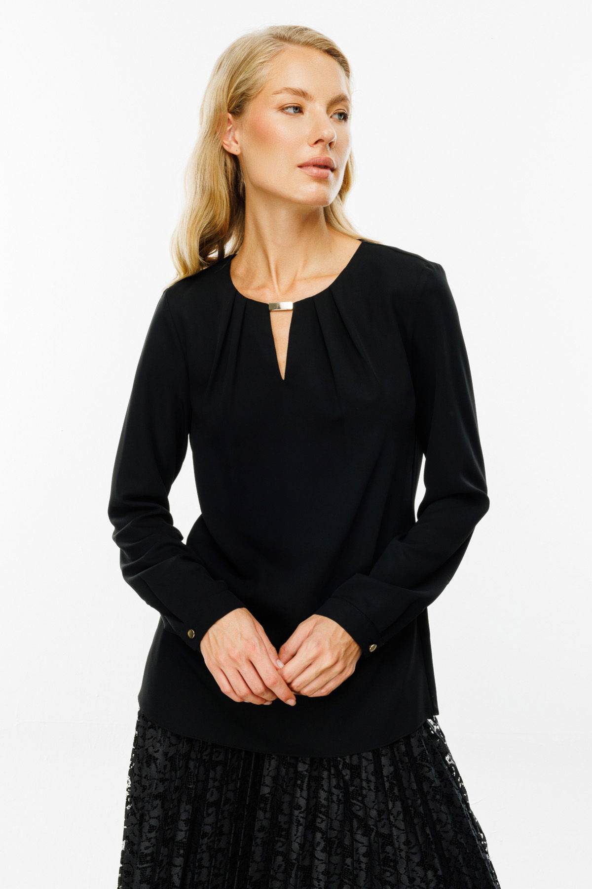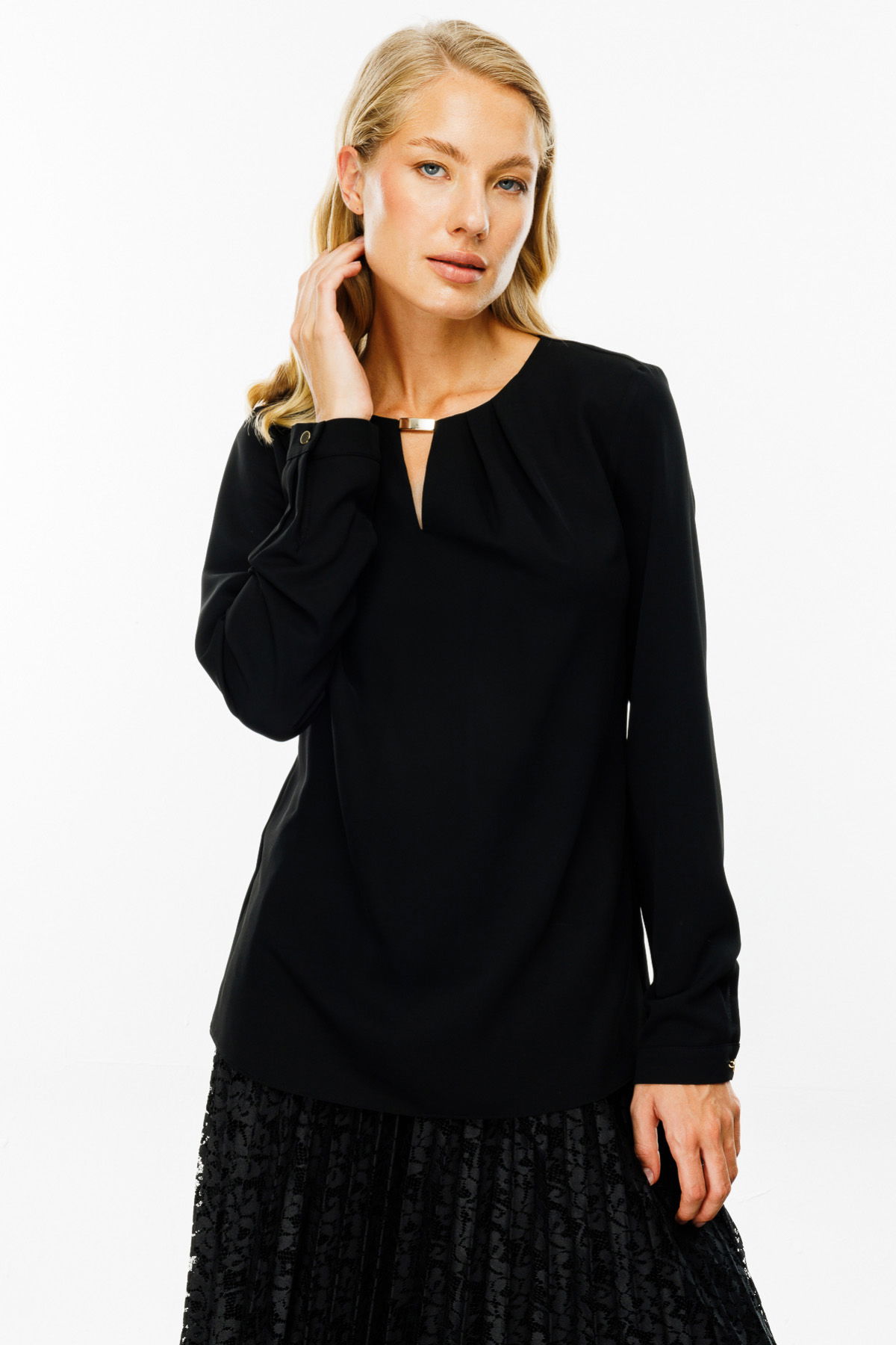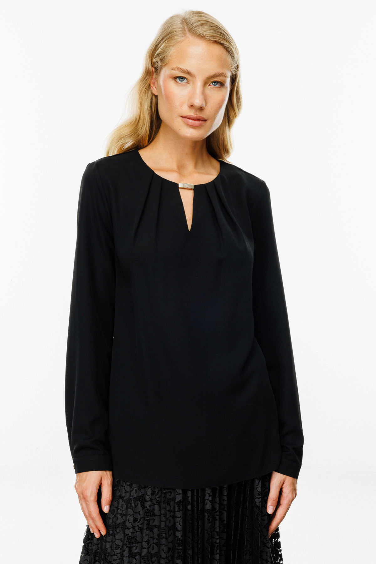 Detay: Göğüs dekolteli, metal aksesuarlı, ön ve arka yaka kısmı pileli, arkadan fermuarlı bluz;