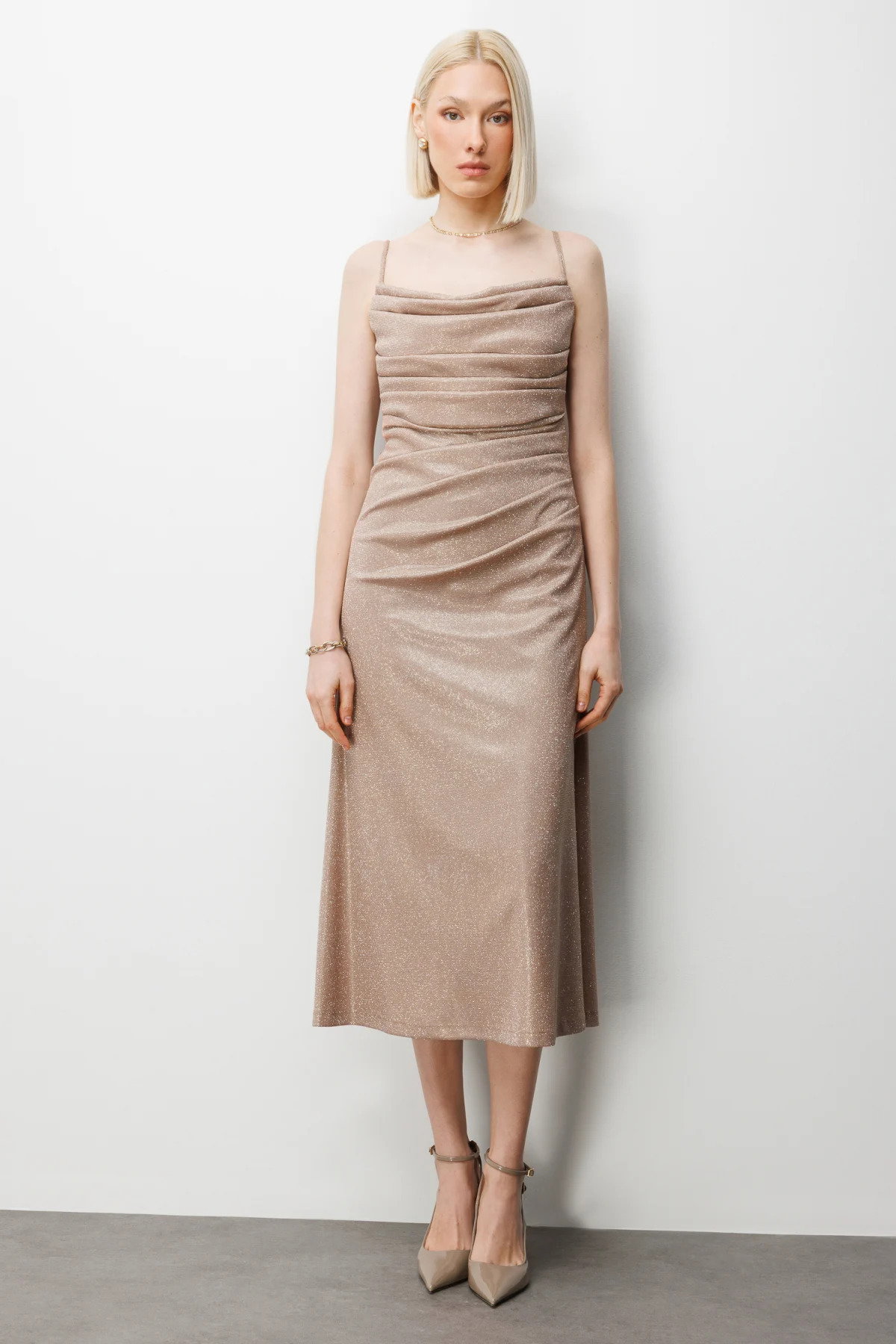Detay: %100 polyester simli kumaştan üretilen, astarlı yapısıyla şık ve düzgün bir duruş sağlayan degaje yaka askılı fermuarlı bu abiye elbise, zarif ve göz alıcı bir görünüm sunar. Simli dokusu sayesinde özel davetlerde parıltılı bir etki yaratırken, degaje yaka tasarımı feminen bir şıklık kazandırır. Pratik fermuar kapamasıyla kullanım kolaylığı sağlayan bu elbise, gardırobunuzda özel günlerin vazgeçilmez parçalarından biri olur;
