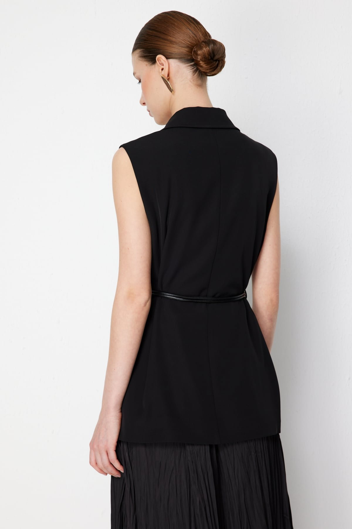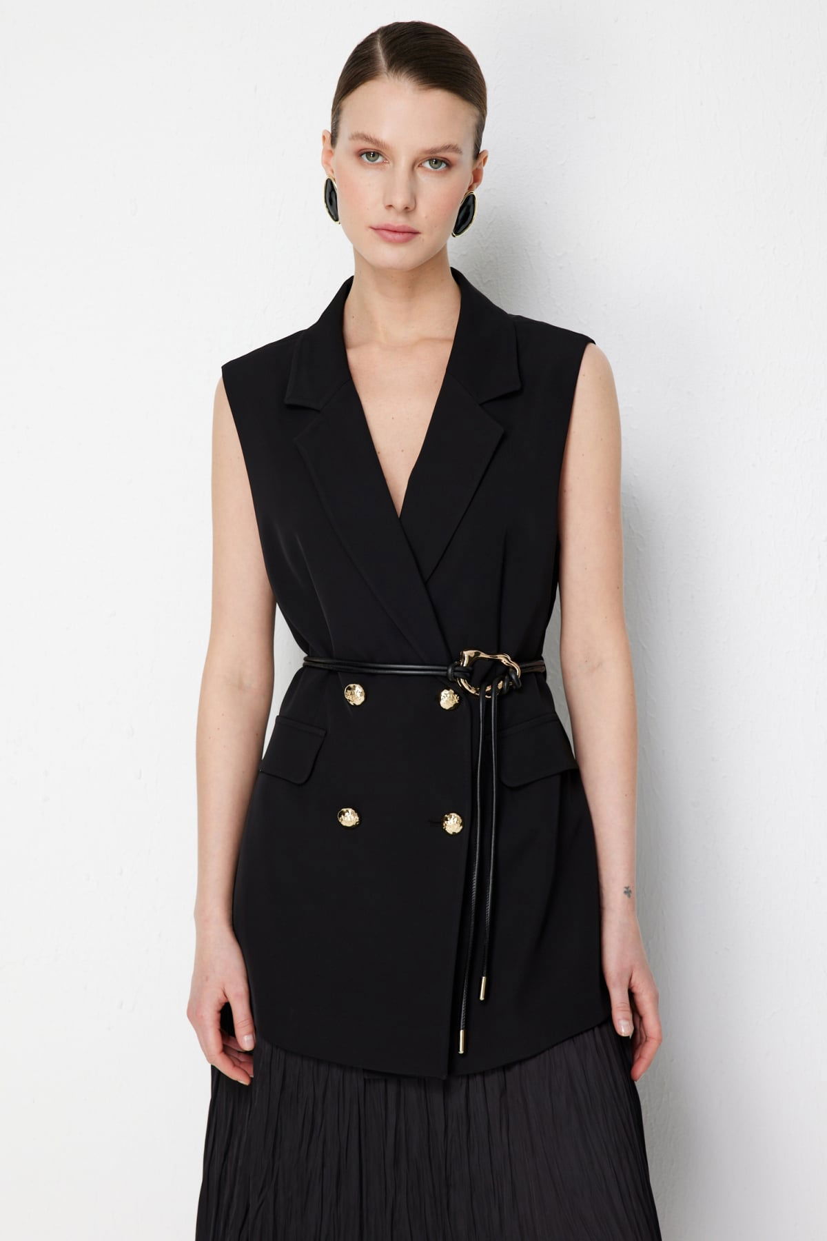 Detay: Bu yelek modeli, dokuma kumaş yapısıyla dayanıklı ve kaliteli bir kullanım sunarken astarlı tasarımı sayesinde daha düzgün bir duruş ve konfor sağlar. Kruvaze yaka detayı sofistike bir görünüm kazandırırken, kolsuz tasarımı özgür bir hareket alanı sağlar. Düğmeli kapama klasik bir şıklık sunarken, kemerli tasarım bel hattını vurgulayarak zarif bir siluet oluşturur. Minimal ve modern çizgileriyle hem günlük kombinlerde hem de özel davetlerde şık bir seçenek olarak öne çıkar;