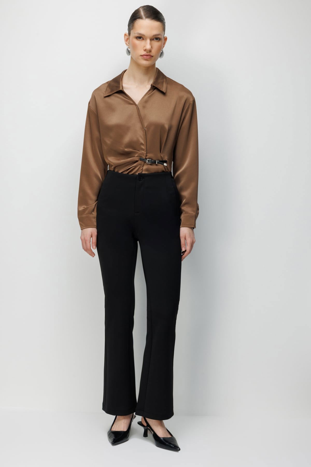 Detay: Bu pantolon modeli, dokuma kumaş yapısıyla kaliteli ve dayanıklı bir kullanım sunarken astarsız tasarımı sayesinde hafif ve rahat bir giyim deneyimi sağlar. Lastikli bel detayı konforlu bir oturuş sağlarken, İspanyol paça kesimi feminen ve zarif bir görünüm kazandırır. Fermuarlı kapama pratiklik sunarken, yan cepler fonksiyonel bir kullanım sağlar. Günlük kombinlerden özel davetlere kadar şıklığı ve rahatlığı bir arada sunan ideal bir parçadır;