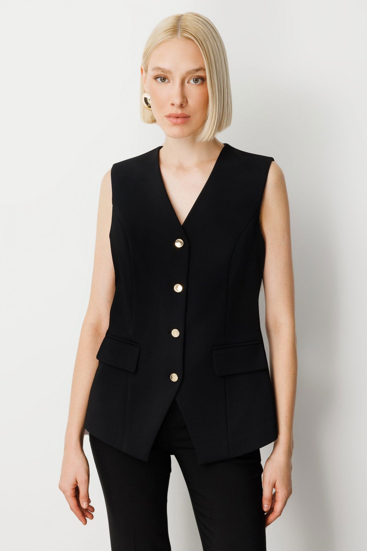 Detay: Dokuma kumaştan üretilmiş, astarlı ve düğmeli tasarımıyla öne çıkan bu kolsuz V yaka yelek, kapaklı cep detaylarıyla hem şıklık hem de işlevsellik sunar. Modern kesimi sayesinde katmanlı kombinlerde rahatlıkla kullanılabilir, stilinize zarif bir dokunuş katar. Günlük giyimden ofis stiline kadar geniş bir kullanım alanı sağlayan bu yelek, gardırobunuzun tamamlayıcı parçalarından biri olmaya adaydır;