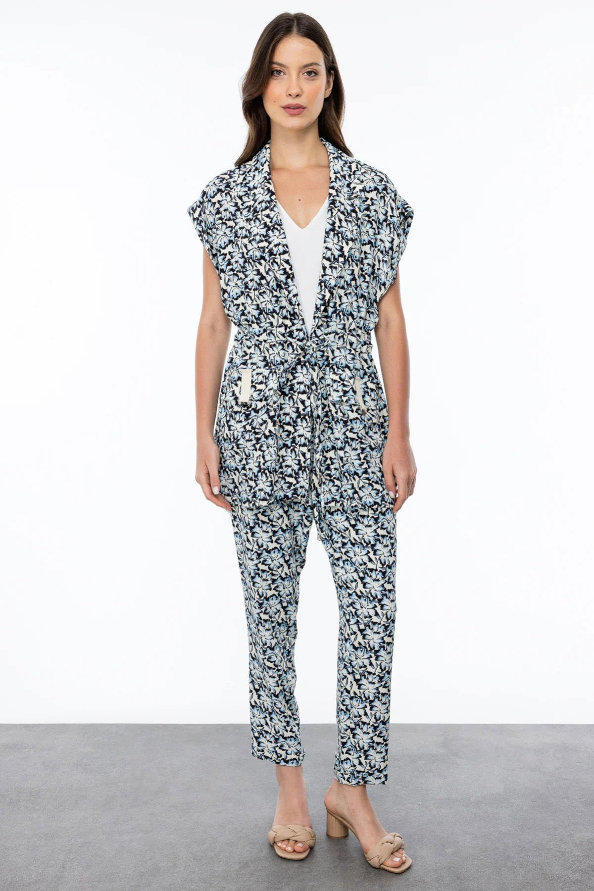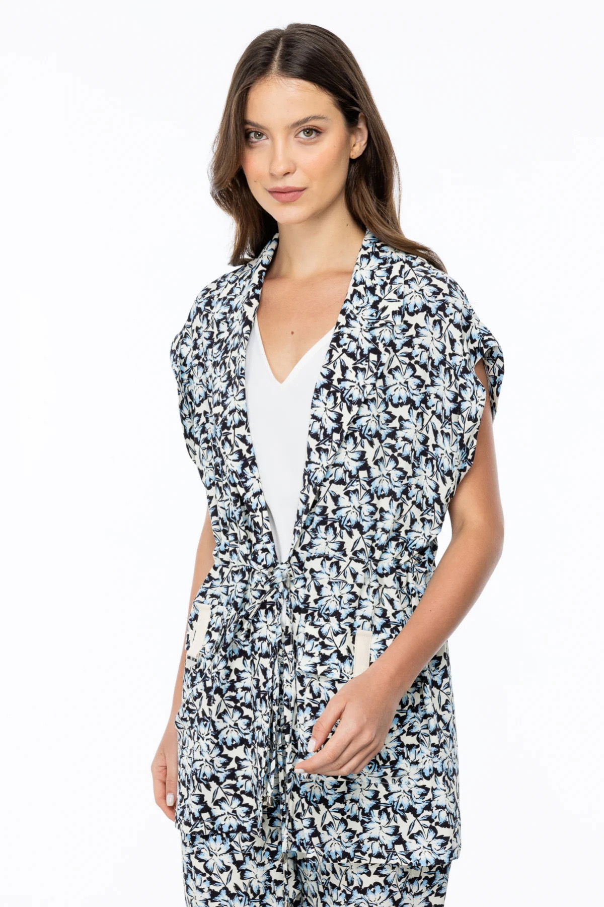 Detay: Şal yaka, kısa duble kol,desenli kumaş,önü düğmesiz,beli bağlamalı,önden torba cepli, astarsız ceket;