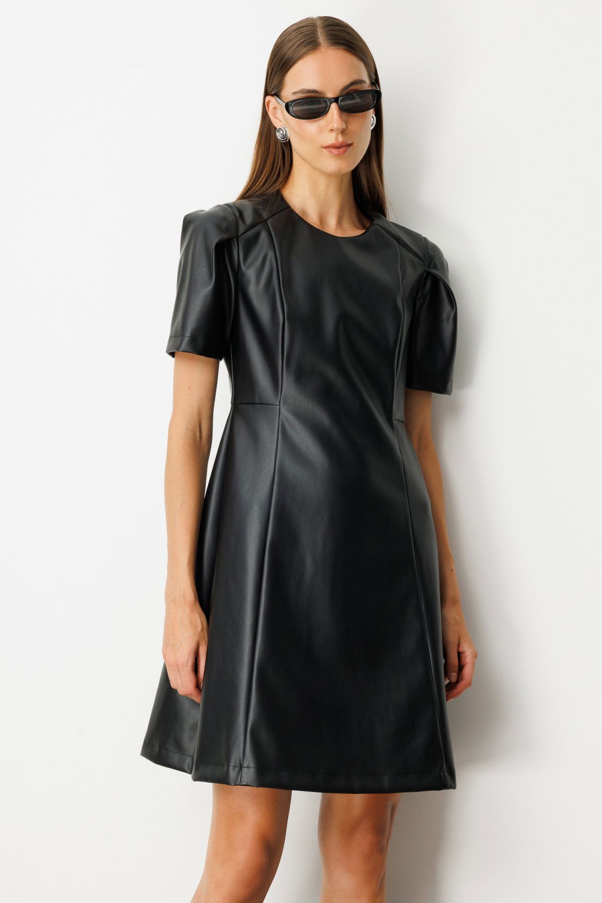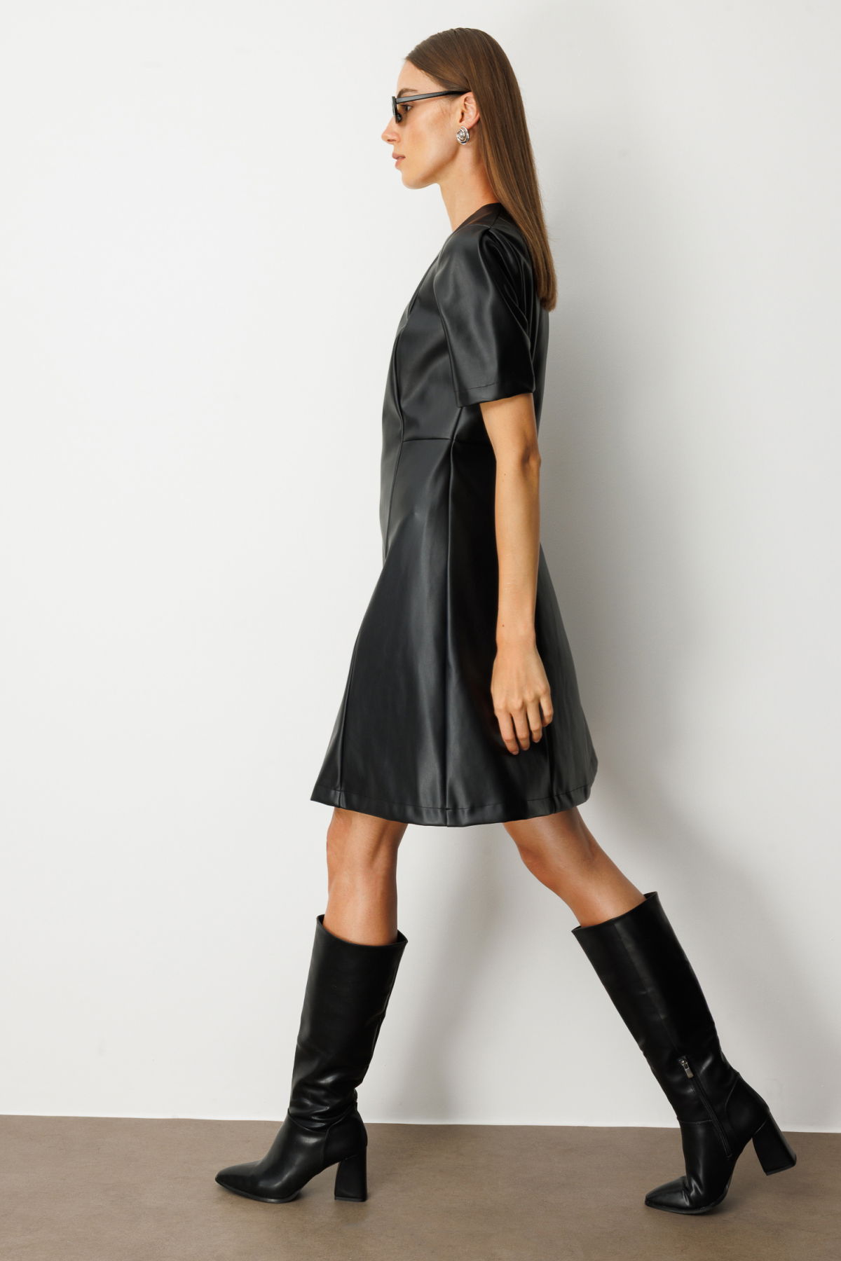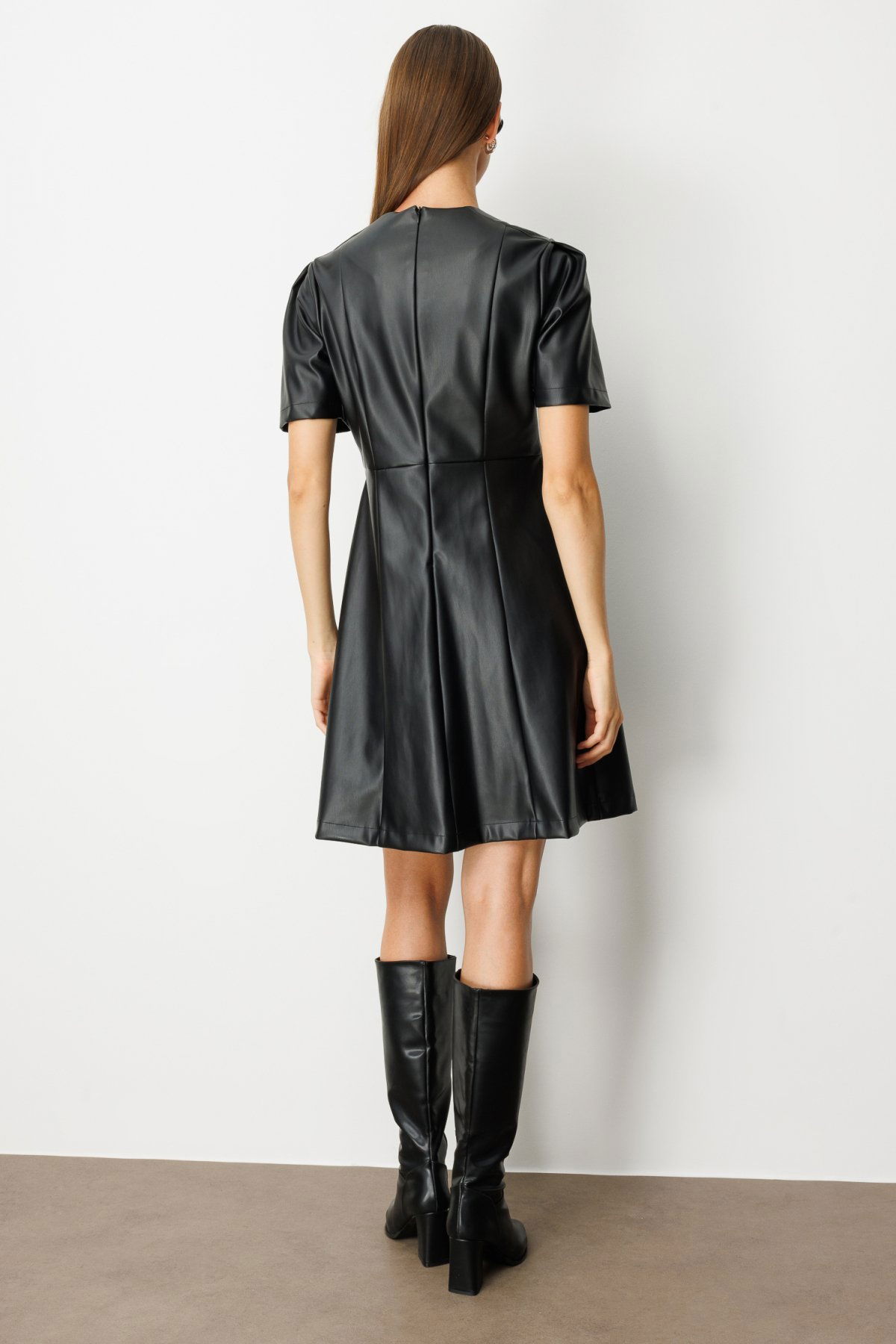 Detay: Suni deri kumaştan üretilmiş, astarlı ve kısa kollu bu elbise; sıfır yaka tasarımıyla sade ve modern bir görünüm sunar. Fermuarlı kapama detayı sayesinde pratik kullanım sağlarken, astarlı iç yapısı konforu artırır. Şehirli ve iddialı stilin tamamlayıcısı olan bu elbise, özel günlerde dikkat çekici bir alternatif oluşturur;
