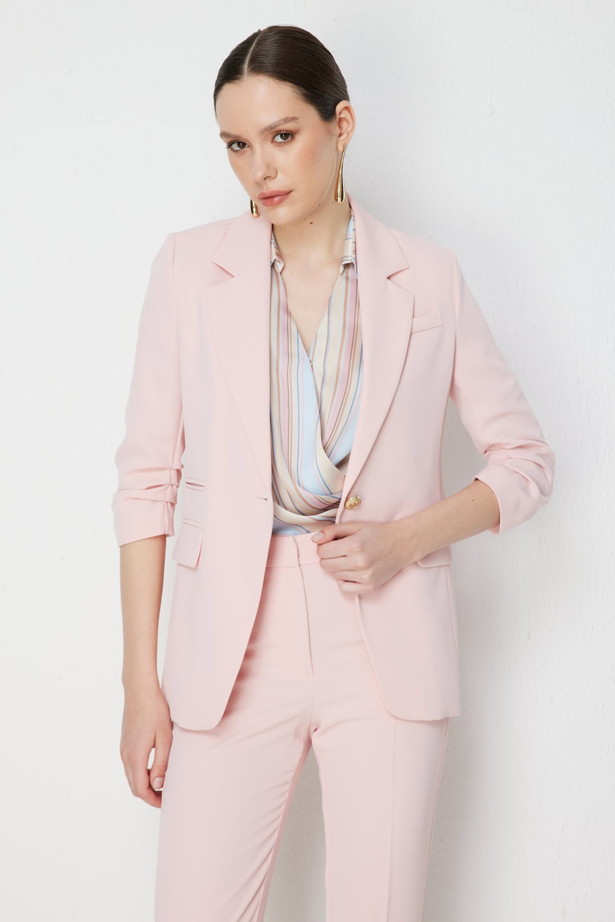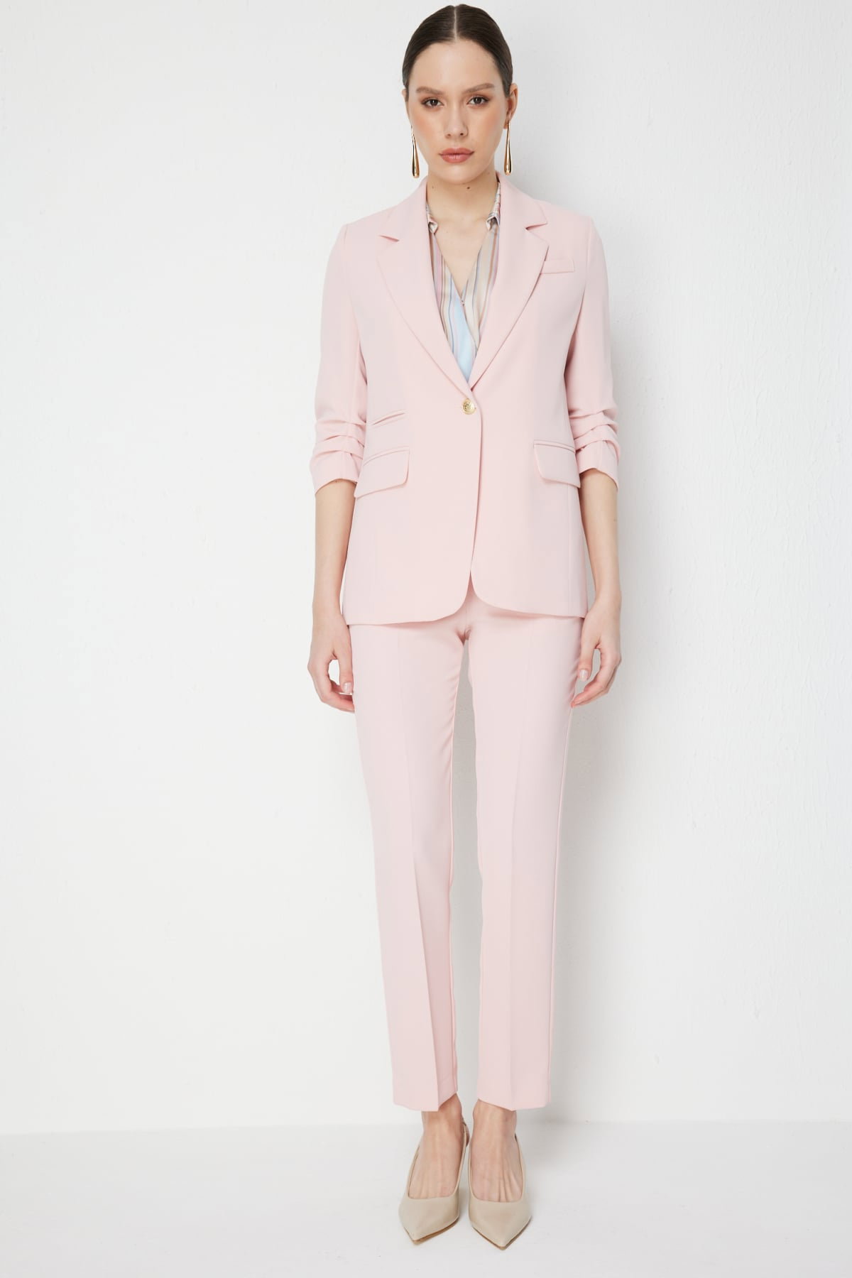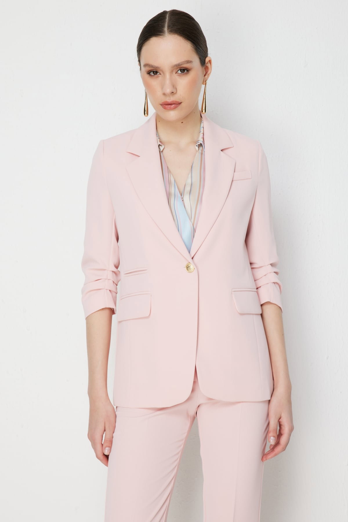 Detay: Polyester kumaş, astarsız, ceket yaka, vatkalı, truvakar kollu, düğmeli ve kapak cepli bu ceket modeli modern ve güçlü bir şıklık sunar. Dayanıklı polyester dokusu hafif ve rahat bir kullanım sağlarken, astarsız yapısı serin bir his verir. Ceket yaka tasarım klasik bir zarafet kazandırırken, vatkalı omuz detayı güçlü ve iddialı bir duruş ortaya çıkarır. Truvakar kol formu dinamik bir stil sunarken, düğmeli kapama pratiklik ve klasik bir şıklık sağlar. Kapaklı cepler ise fonksiyonel kullanımın yanı sıra estetik bir detay olarak öne çıkar. Bu ceket modeli hem iş kombinlerinde hem de özel davetlerde stil sahibi bir tercih olabilir;