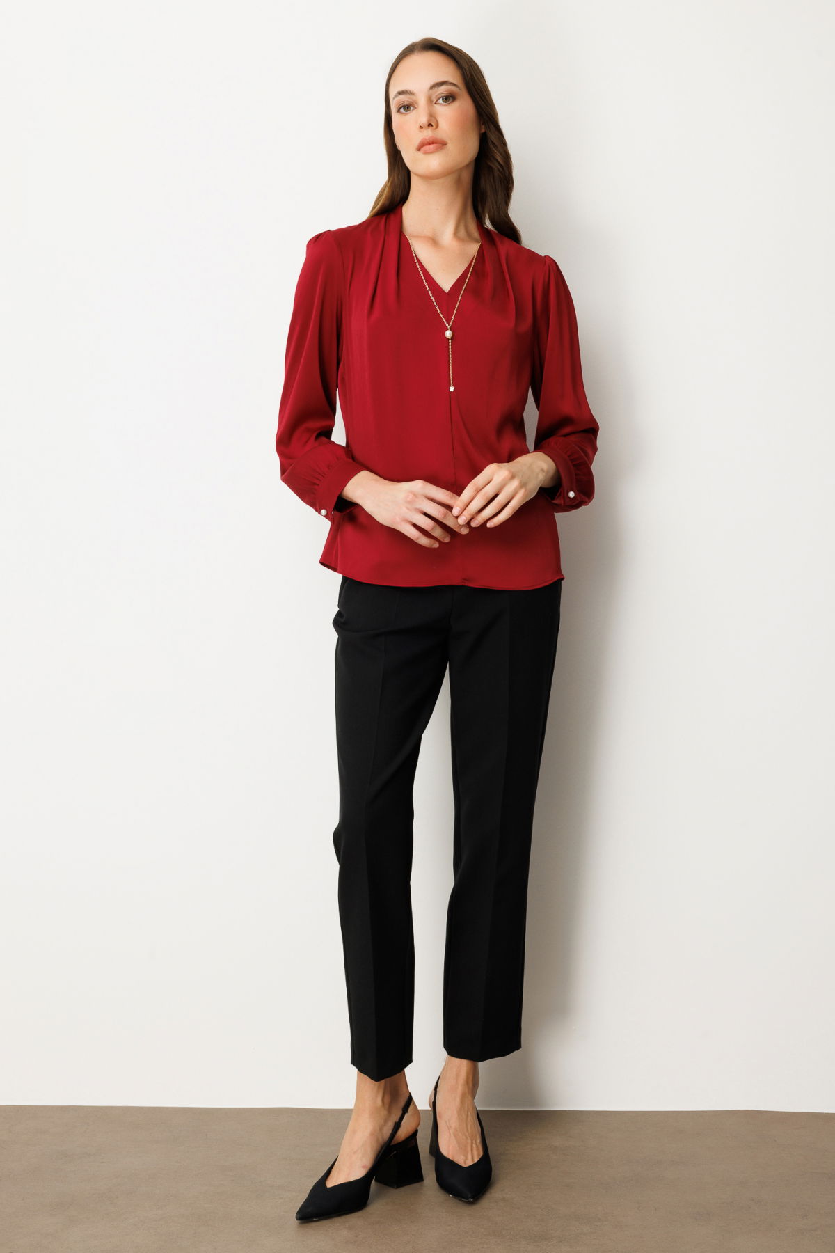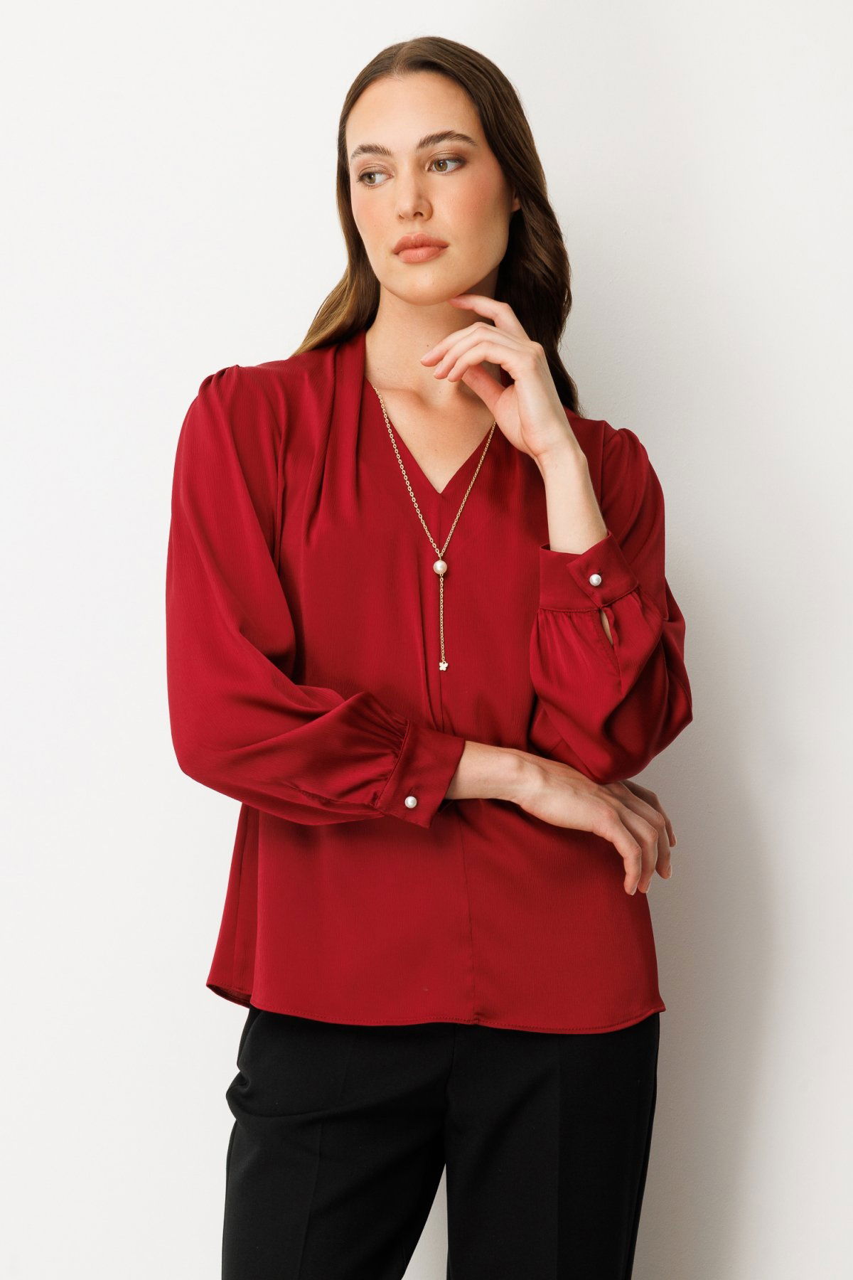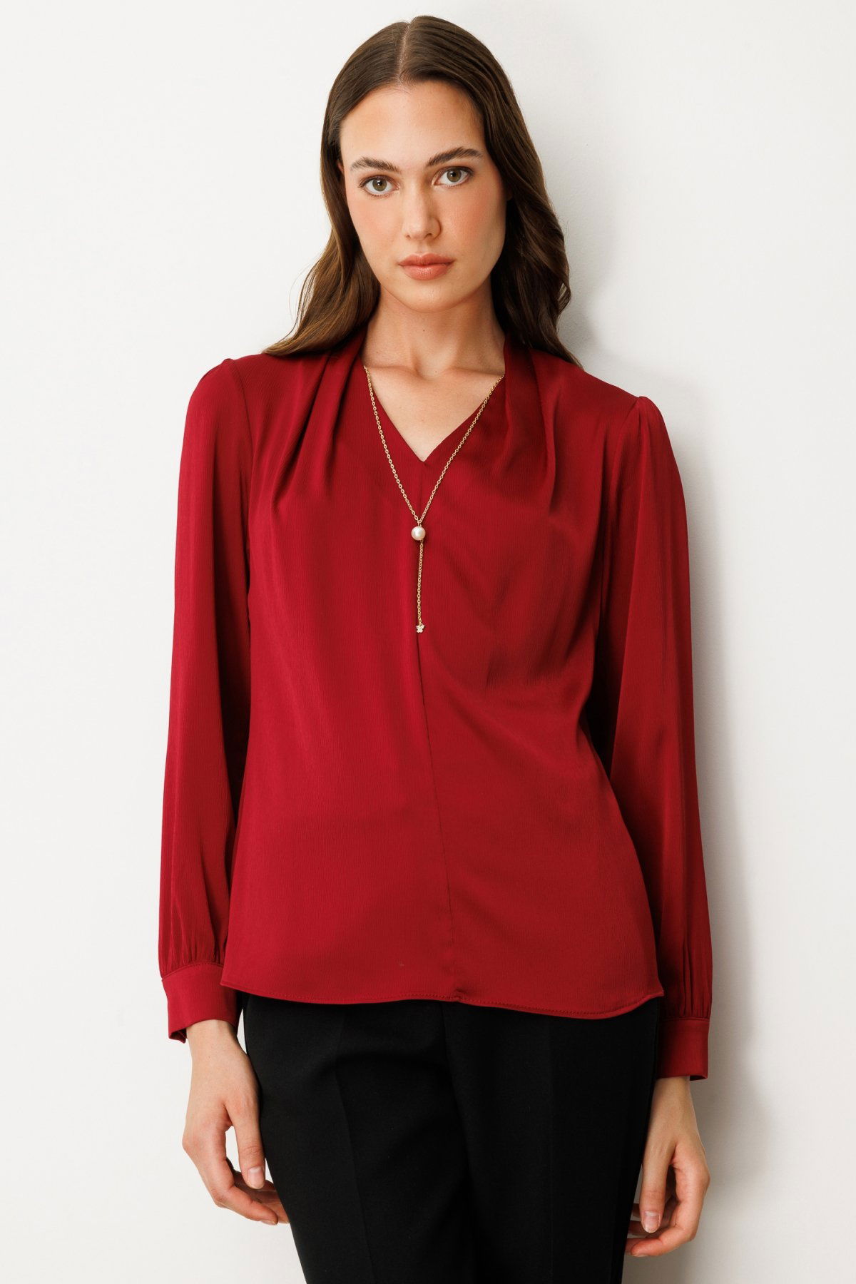 Ekol Kadın Kolye Aksesuarlı V Yaka Bluz 3013 Bordo
