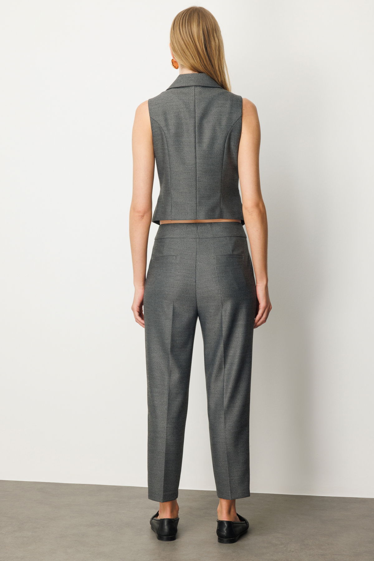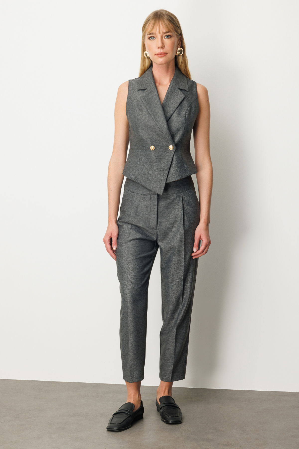 Detay: Dokuma kumaştan üretilmiş, astarlı ve kruvaze yakalı bu kolsuz yelek, zarif ve modern tasarımıyla dikkat çeker. Vücuda oturan kesimiyle şıklığı ön plana çıkarırken, katmanlı kombinlerde rahatlıkla kullanılabilir. Hem ofis stilinde hem de günlük giyimde stilinizi tamamlayacak bu yelek, gardırobunuzun fonksiyonel ve şık parçalarından biri olmaya adaydır;