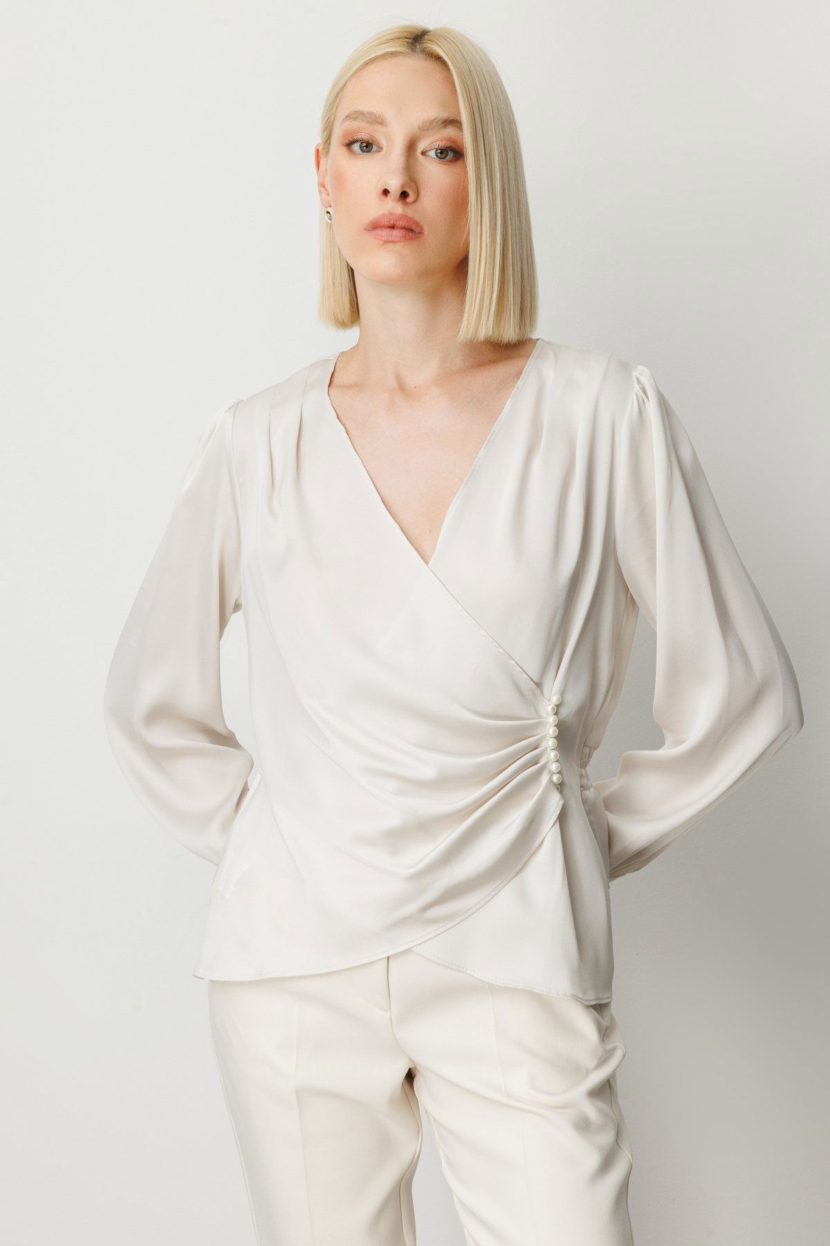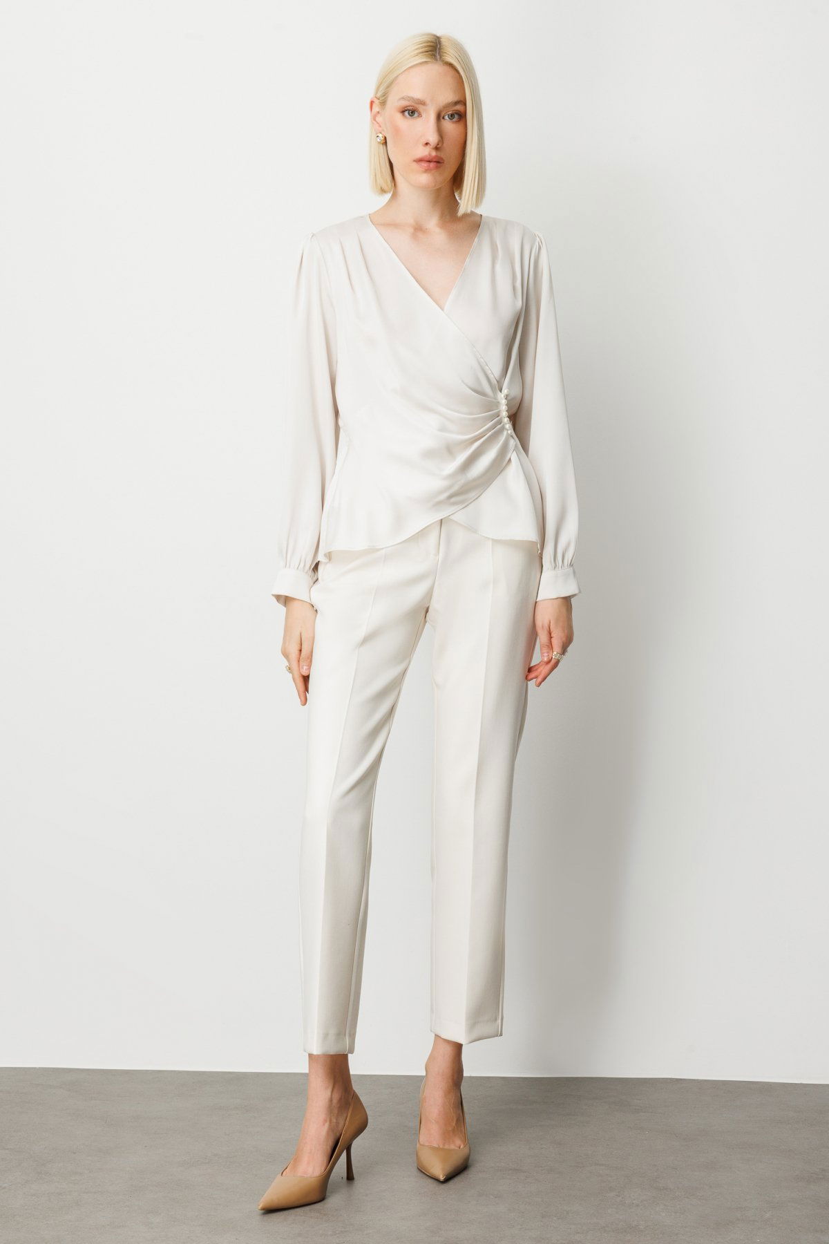 Detay: Astarsız yapısıyla hafif ve konforlu bir kullanım sunan bu uzun kollu bluz, kruvaze yaka detayıyla zarif ve sofistike bir duruş sergiliyor. Uzun kol tasarımı sayesinde mevsim geçişlerinde ideal bir tercih olan model, sade şıklığıyla hem günlük kombinlerde hem de ofis stilinde öne çıkıyor. Kruvaze yakanın feminen havası ve astarsız dokunun rahatlığıyla stil sahibi kadınların gardırobunda özel bir yer ediniyor;
