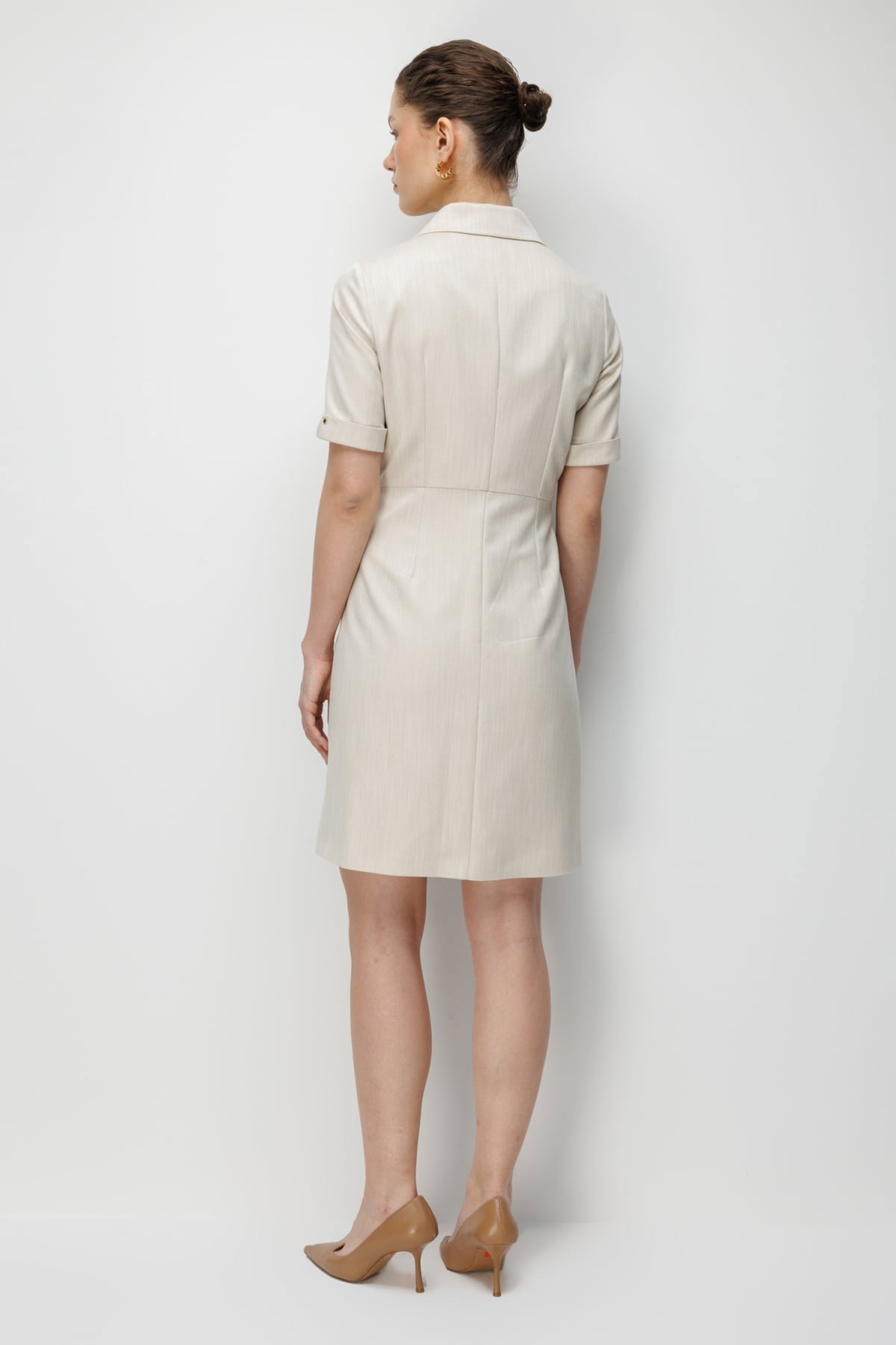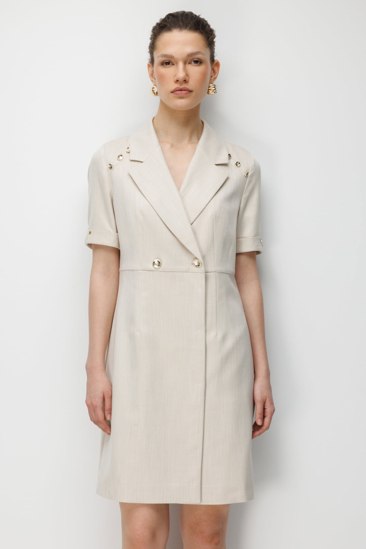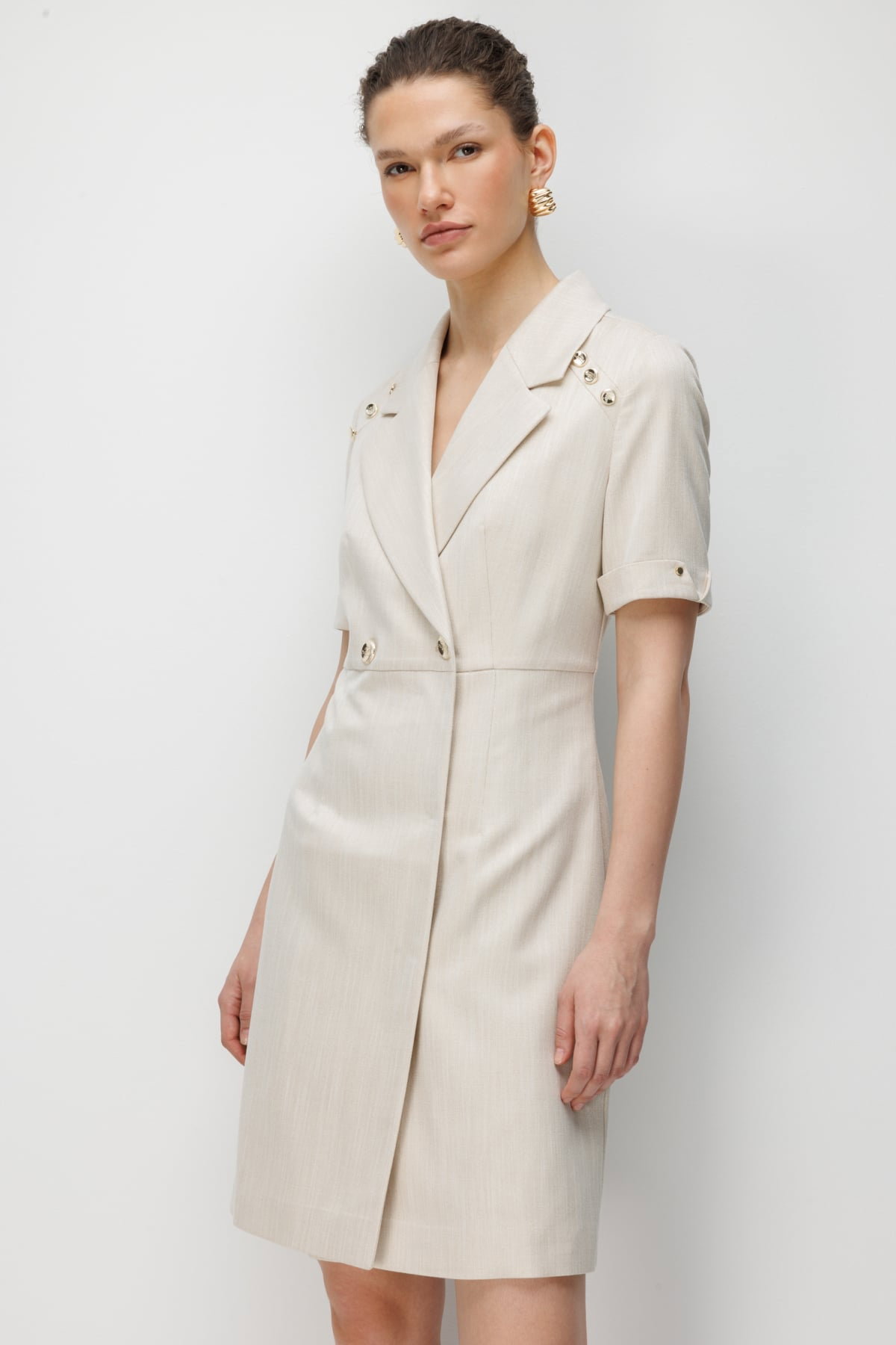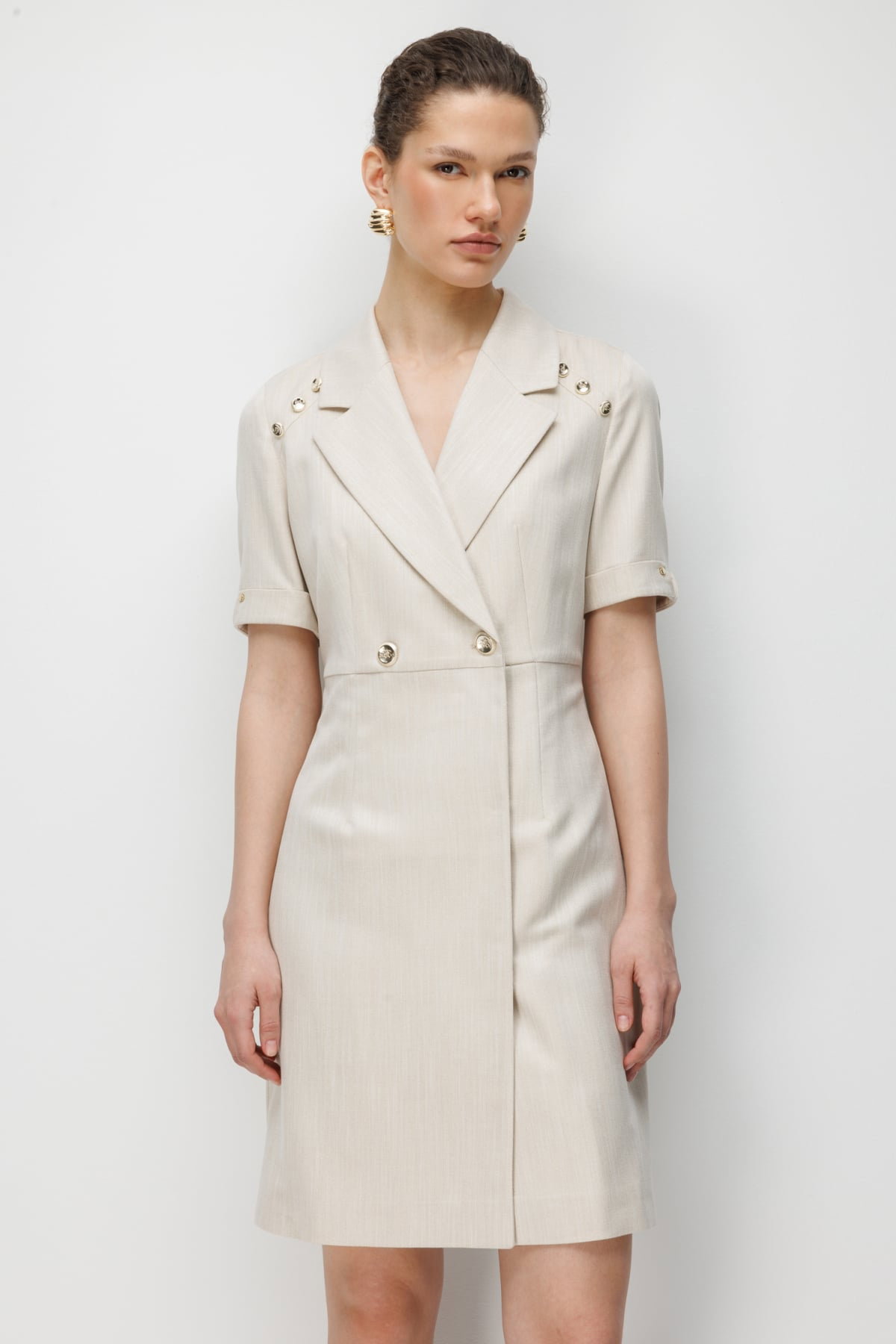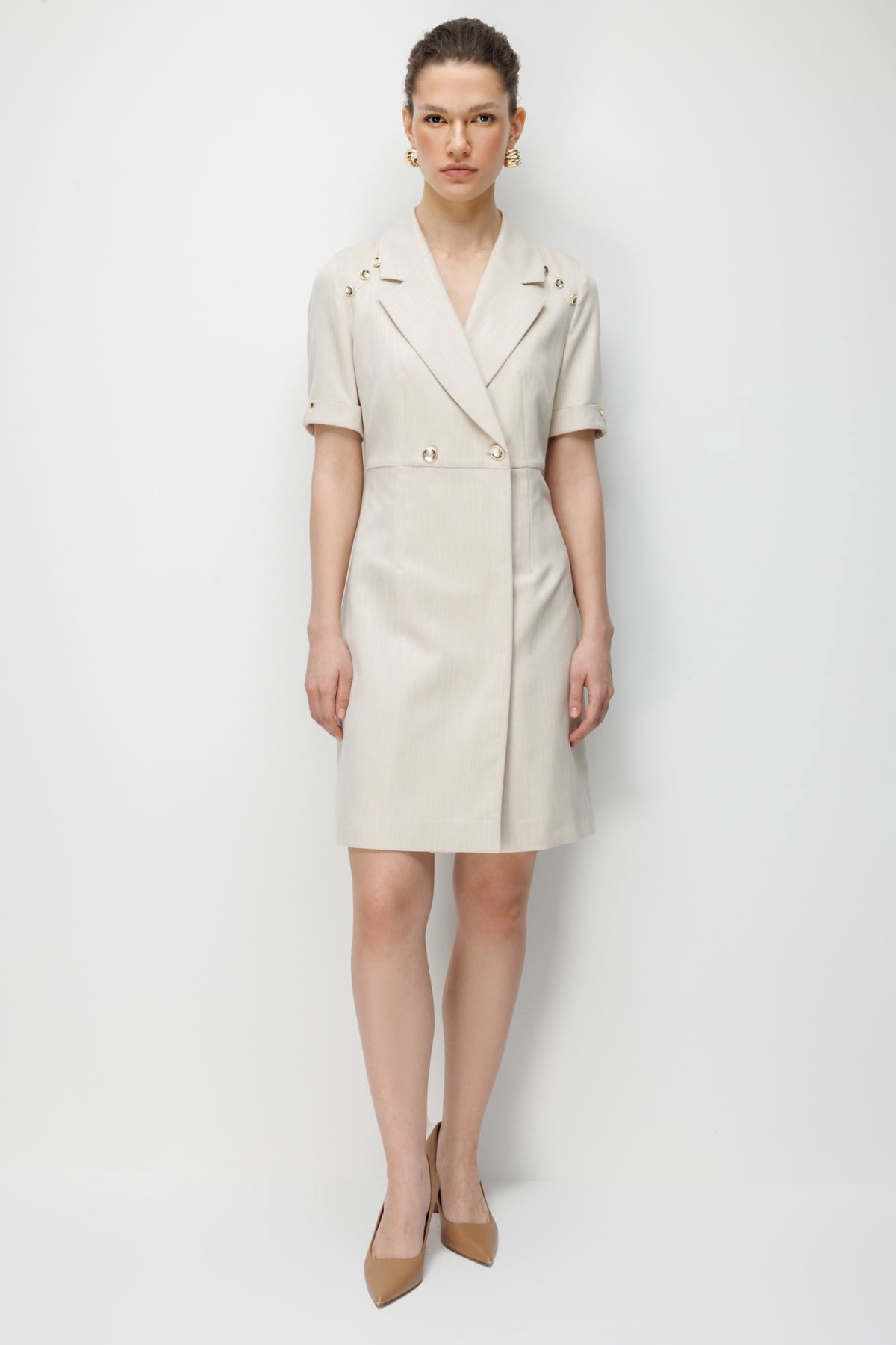 Detay: Dokuma kumaş ile üretilen bu elbise modeli, astarlı yapısı sayesinde şık ve düzgün bir duruş sergiler. Kruvaze yaka detayı zarif bir görünüm kazandırırken, kısa kol tasarımı modern bir rahatlık sunar. Çıt çıt kapama şekli ise pratik kullanım sağlayarak tasarımı tamamlar.;