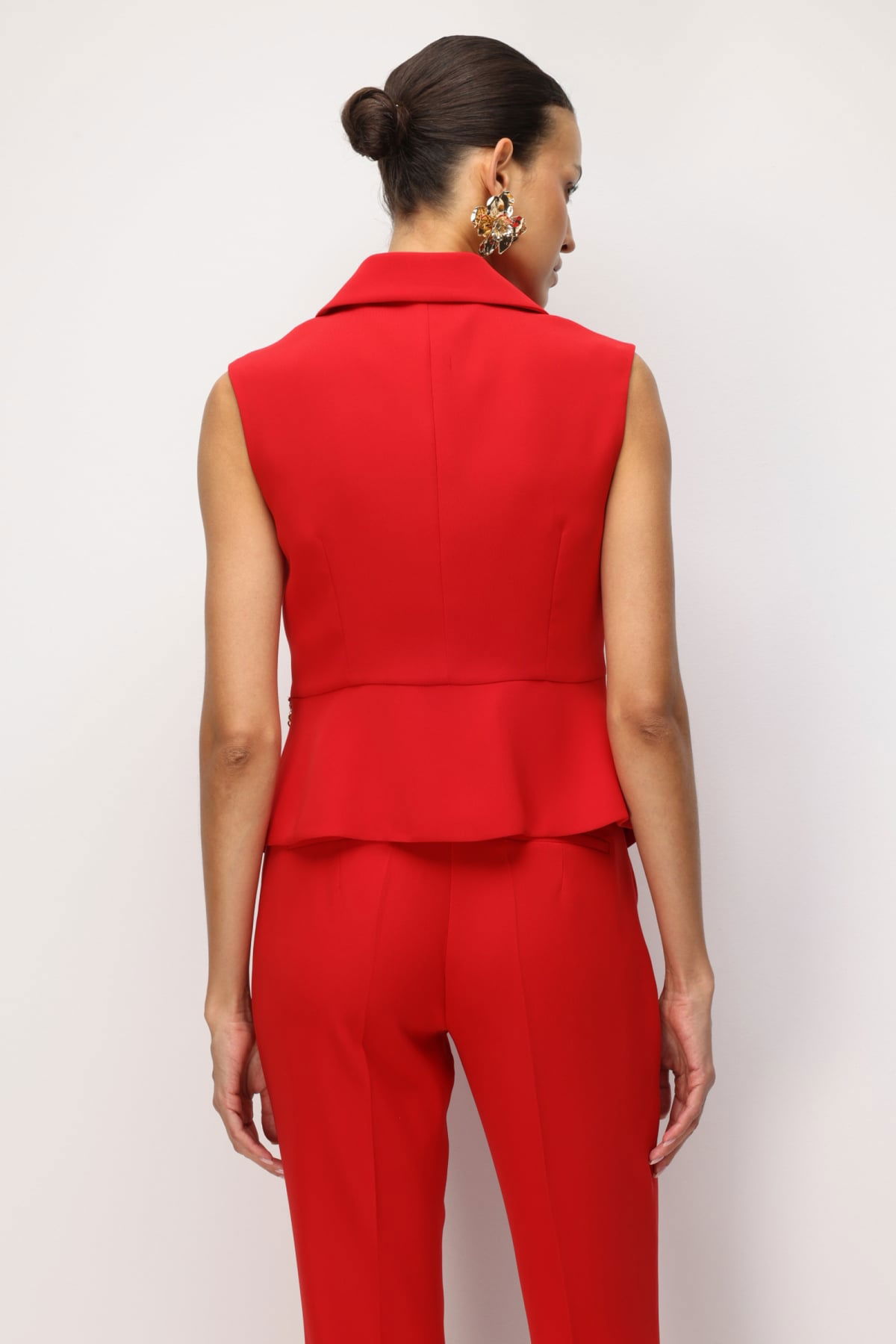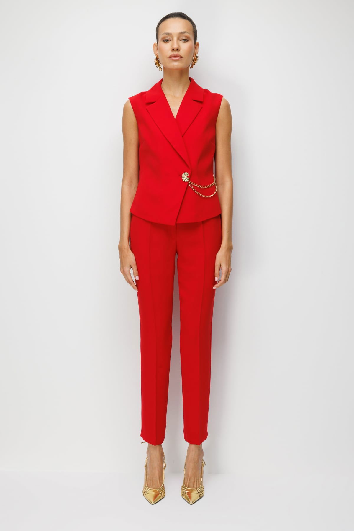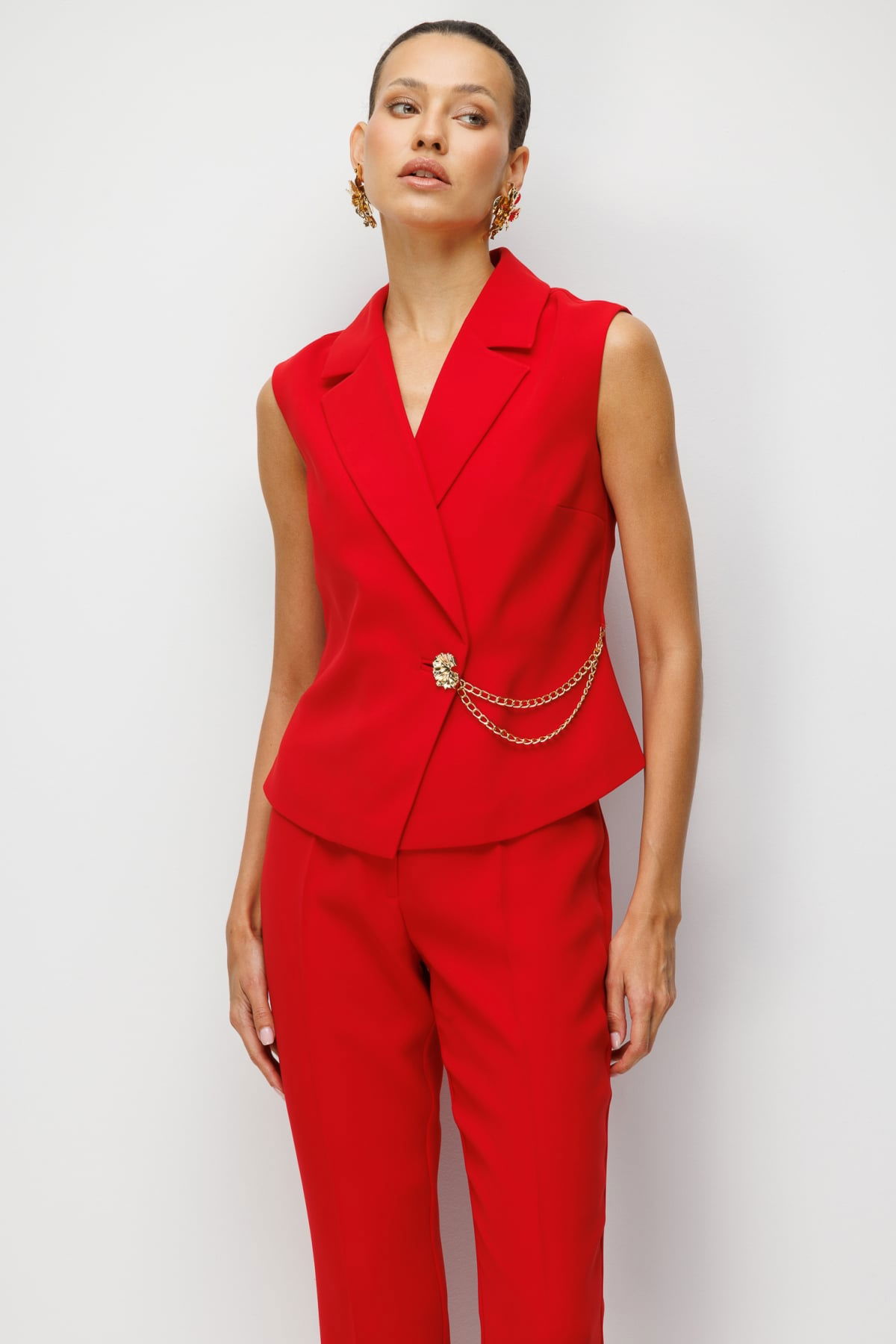 Detay: Bu yelek modeli, polyester kumaş yapısıyla hafif ve dayanıklı bir kullanım sunarken astarlı tasarımı sayesinde daha düzgün bir duruş ve konfor sağlar. Kruvaze yaka detayı sofistike bir görünüm kazandırırken, kolsuz tasarımı özgür bir hareket alanı sağlar. Düğmeli kapama klasik bir şıklık sunar ve tasarıma zarif bir hava katar. Modern çizgileriyle hem günlük kombinlerde hem de özel davetlerde şık bir seçenek olarak öne çıkan, zamansız bir parçadır;