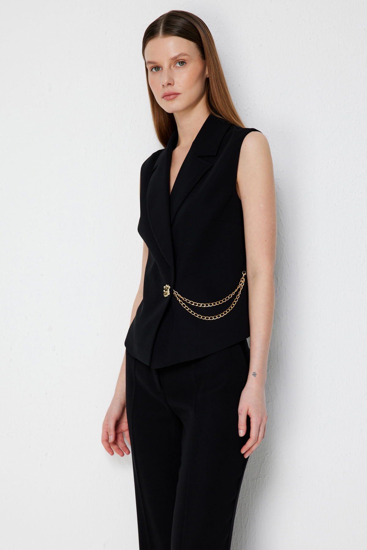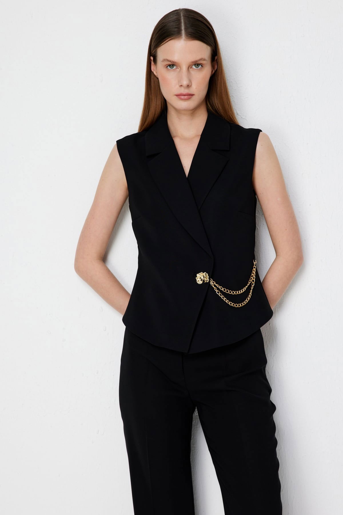 Detay: Bu yelek modeli, polyester kumaş yapısıyla hafif ve dayanıklı bir kullanım sunarken astarlı tasarımı sayesinde daha düzgün bir duruş ve konfor sağlar. Kruvaze yaka detayı sofistike bir görünüm kazandırırken, kolsuz tasarımı özgür bir hareket alanı sağlar. Düğmeli kapama klasik bir şıklık sunar ve tasarıma zarif bir hava katar. Modern çizgileriyle hem günlük kombinlerde hem de özel davetlerde şık bir seçenek olarak öne çıkan, zamansız bir parçadır;