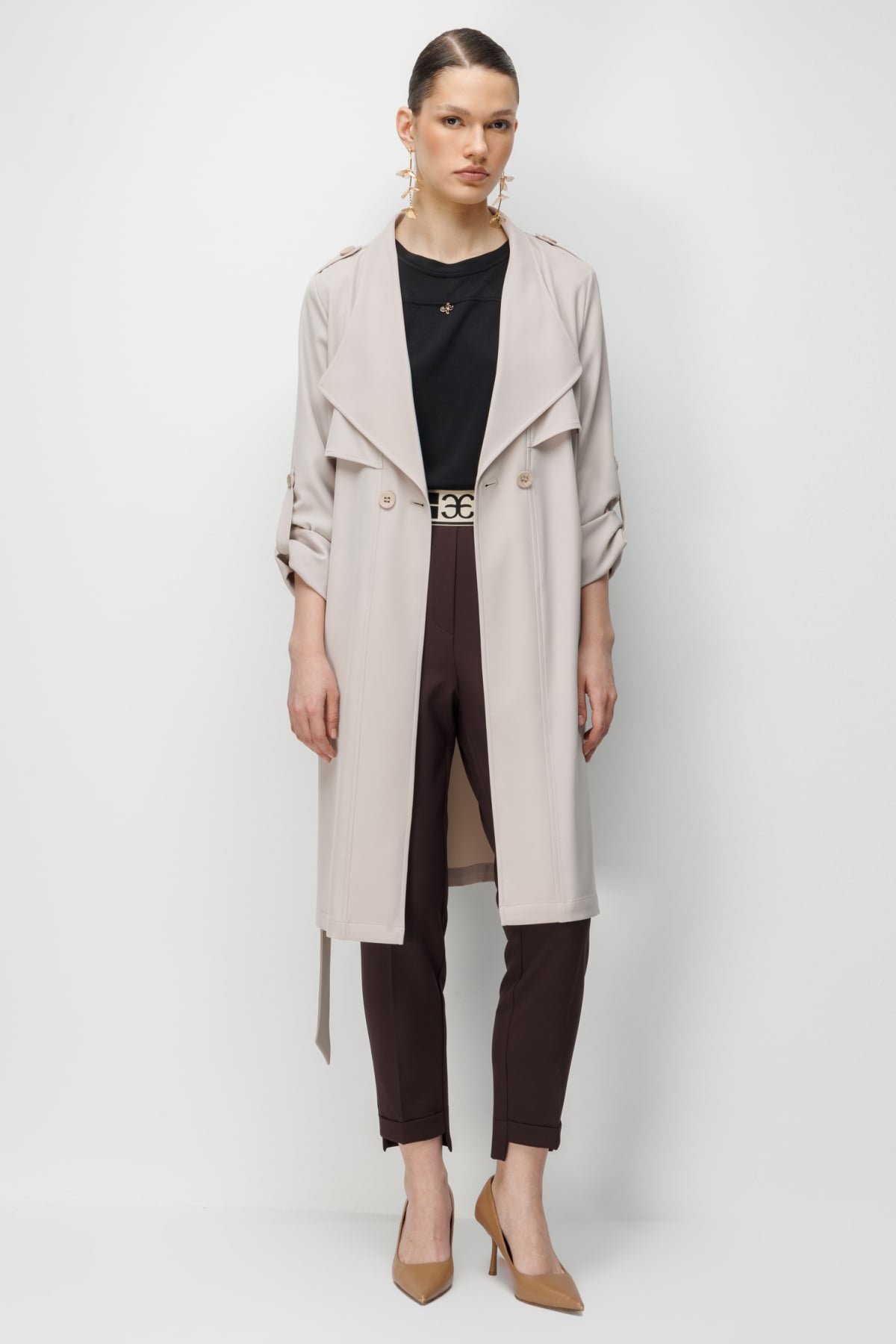 Ekol Kadın Omzu Apoletli Kuşaklı Trenç 7022 Kum