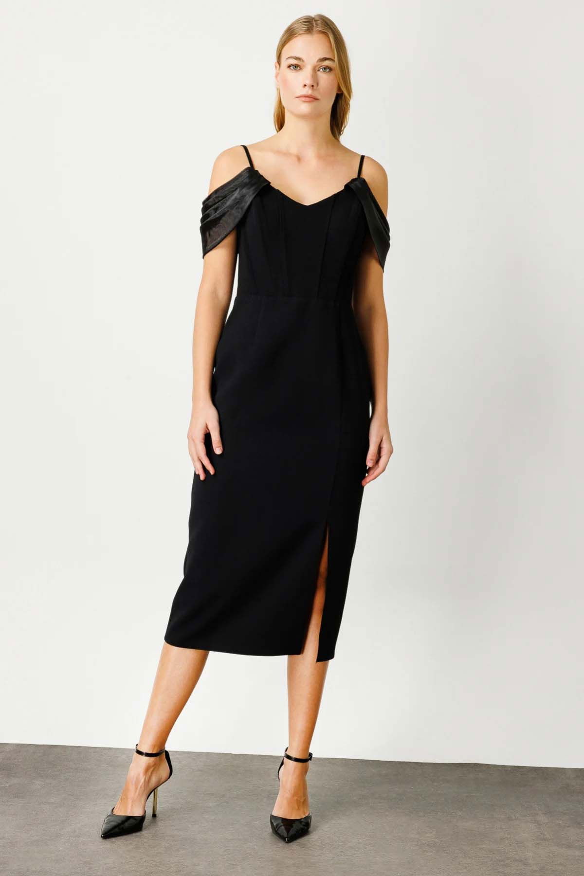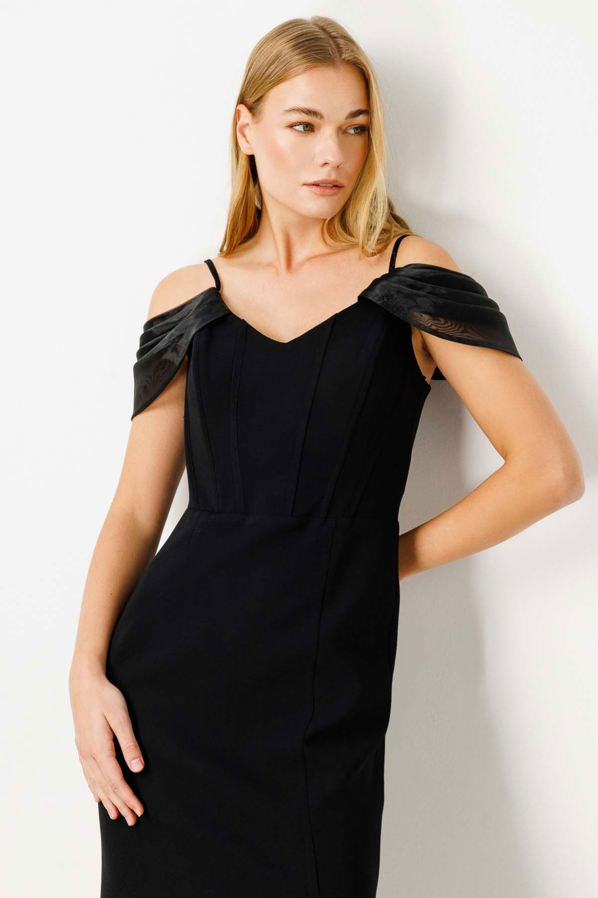 Detay: Ayarlanabilir ip askılı, omzu katlı organze detaylı, krep kumaş, göğüs kısmı gloplu, önden yırtmaçlı, sırt kısmı fermuar kapamalı, astarlı abiye elbise;