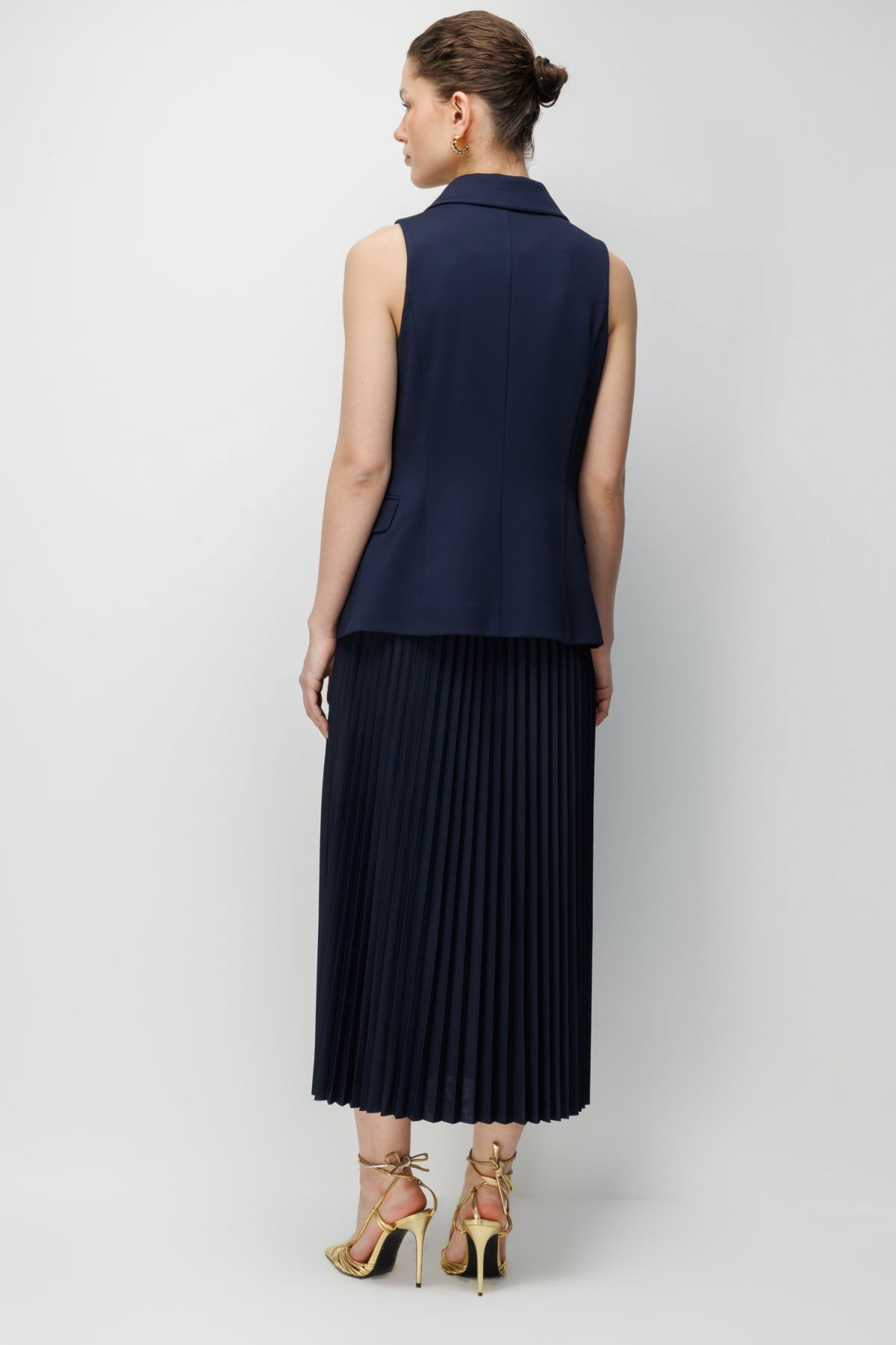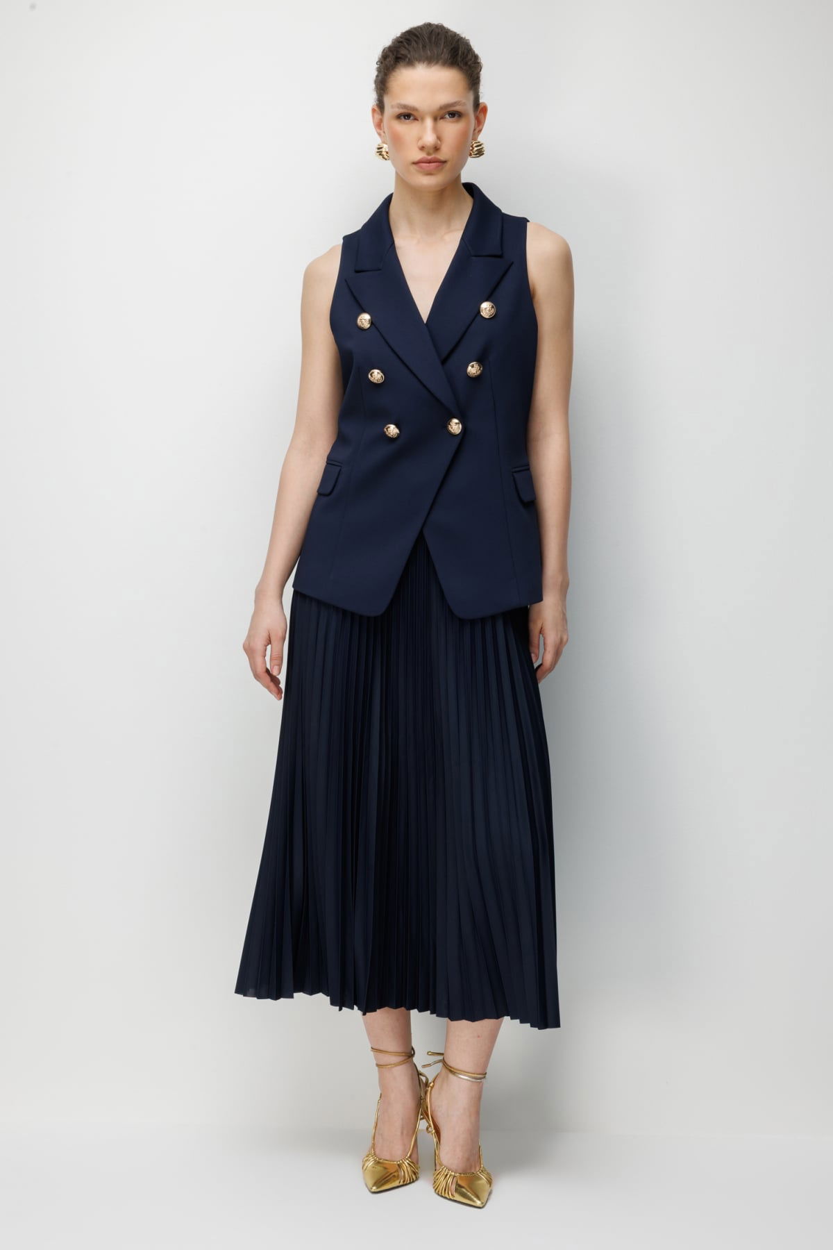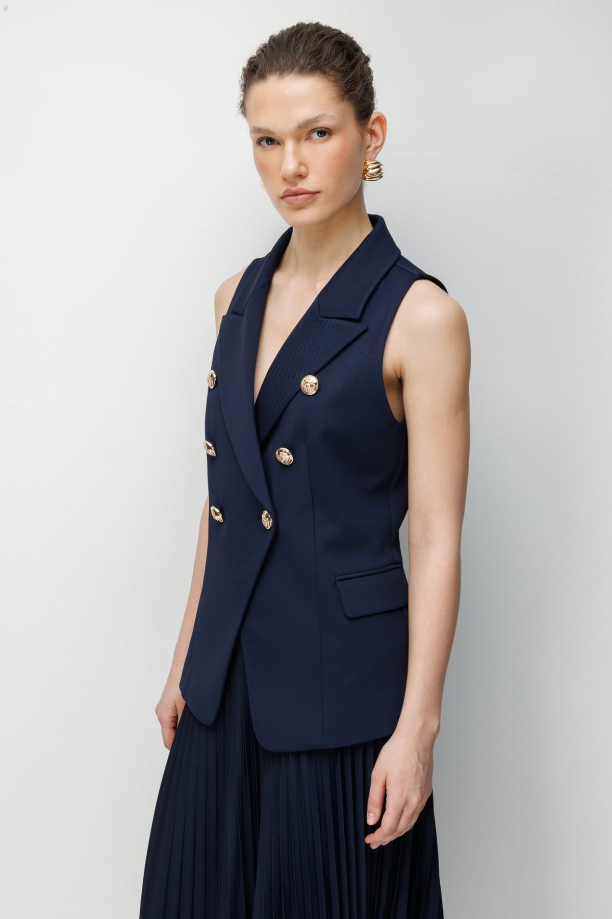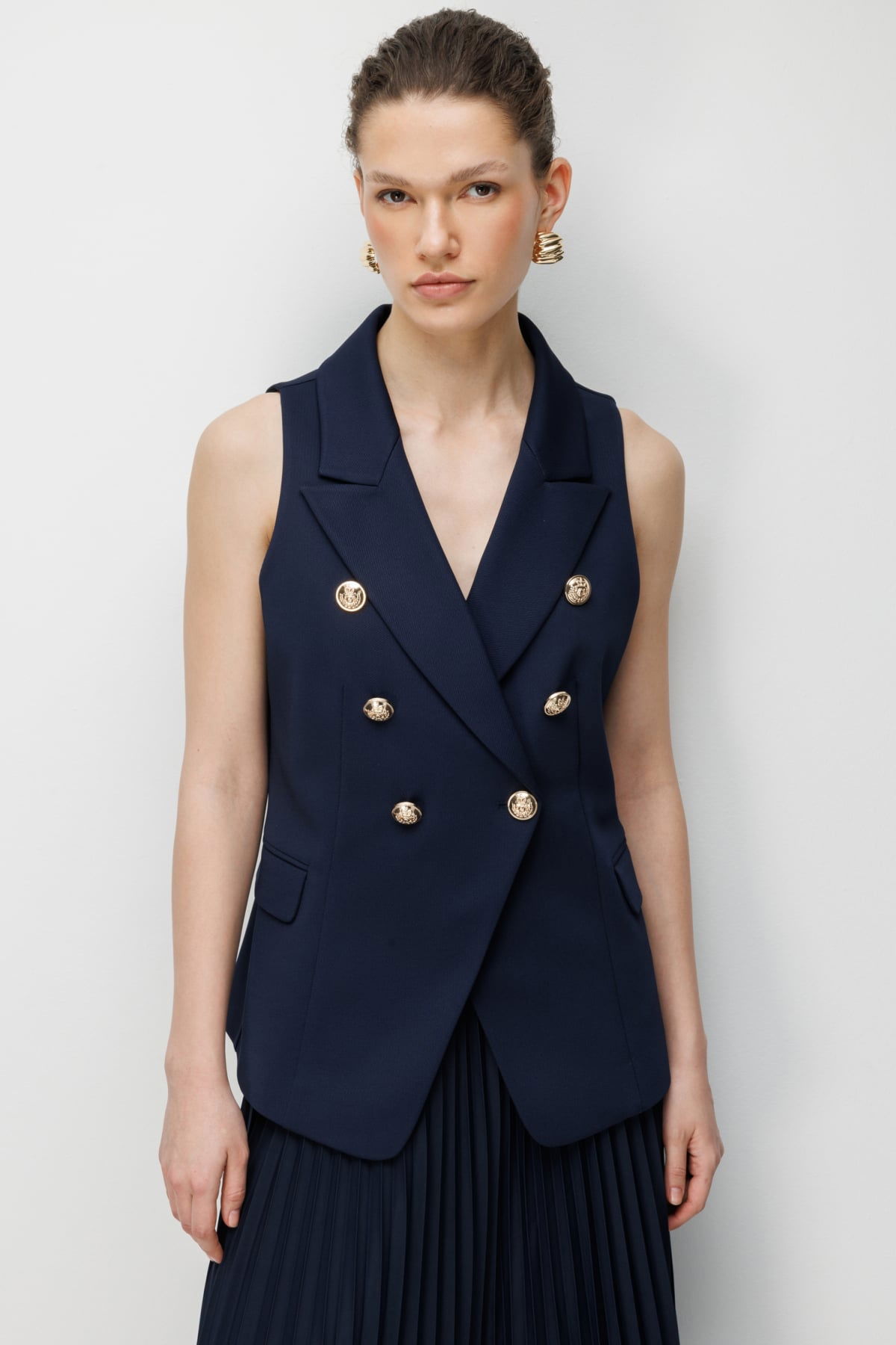 Detay: Bu yelek modeli, polyester kumaş yapısıyla hafif ve dayanıklı bir kullanım sunarken astarlı tasarımı sayesinde daha düzgün bir duruş ve konfor sağlar. Kruvaze yaka detayı sofistike bir görünüm kazandırırken, kolsuz tasarımı özgür bir hareket alanı sağlar. Düğmeli kapama şıklığı tamamlar, cepsiz tasarımı ise minimal ve zarif bir stil ortaya çıkarır. Hem günlük kombinlerde hem de özel davetlerde modern ve şık bir seçenek olarak öne çıkar;