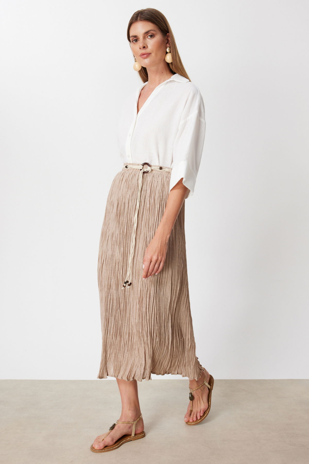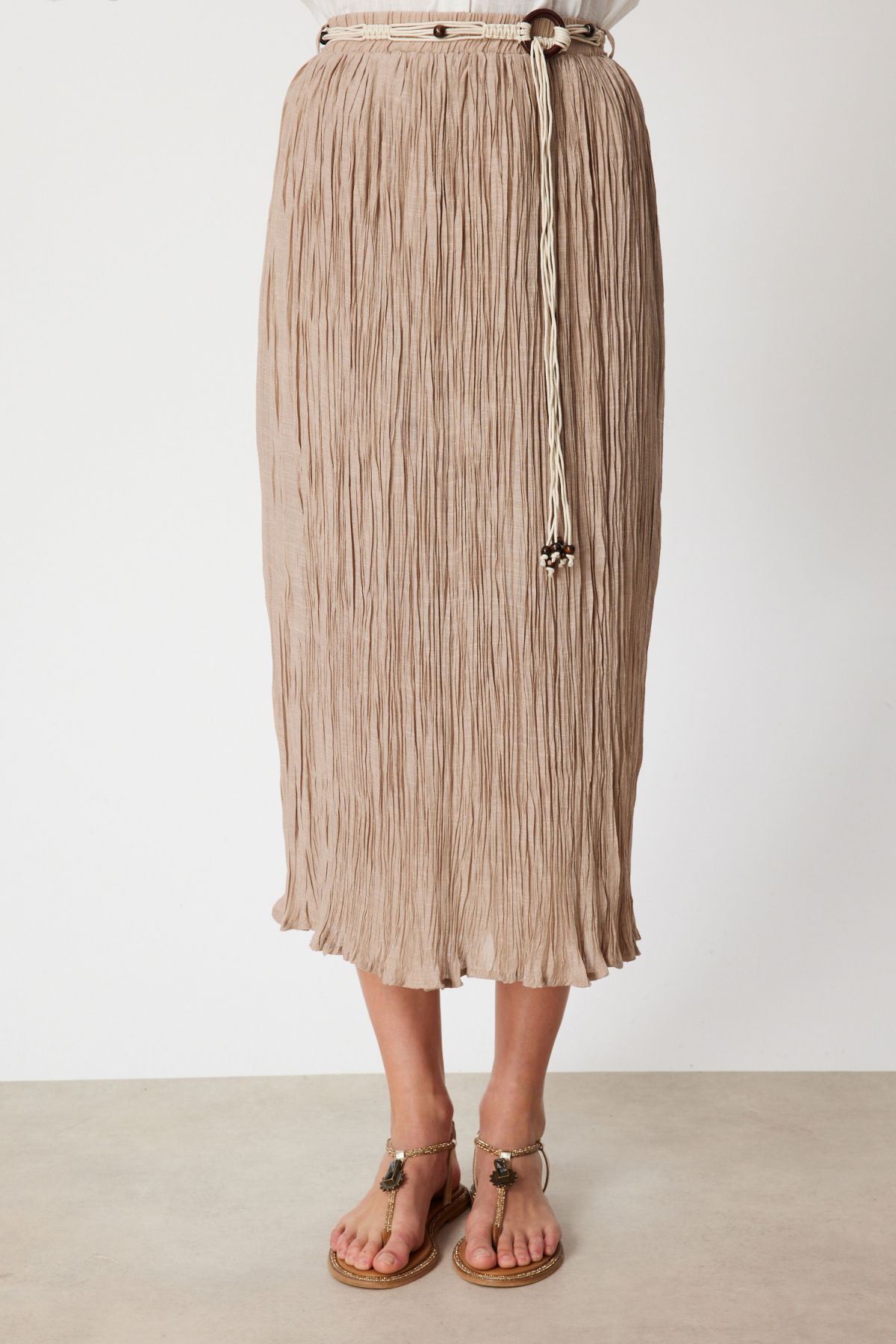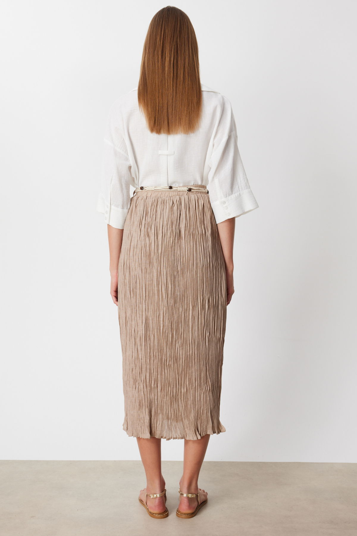 Detay: Dokulu kumaştan üretilmiş, yarım astar detayıyla hafif ve konforlu bir kullanım sunan bu lastikli bel ince etek, zarif tasarımıyla günlük kombinlere modern bir dokunuş katar. Lastikli bel yapısı sayesinde rahat bir oturuş sağlarken, dokulu kumaşı ile şıklığı ön plana çıkarır. Hem günlük kullanımda hem de özel davetlerde gardırobunuzun tamamlayıcı parçalarından biri olmaya adaydır;