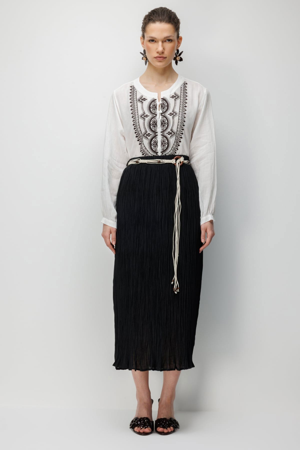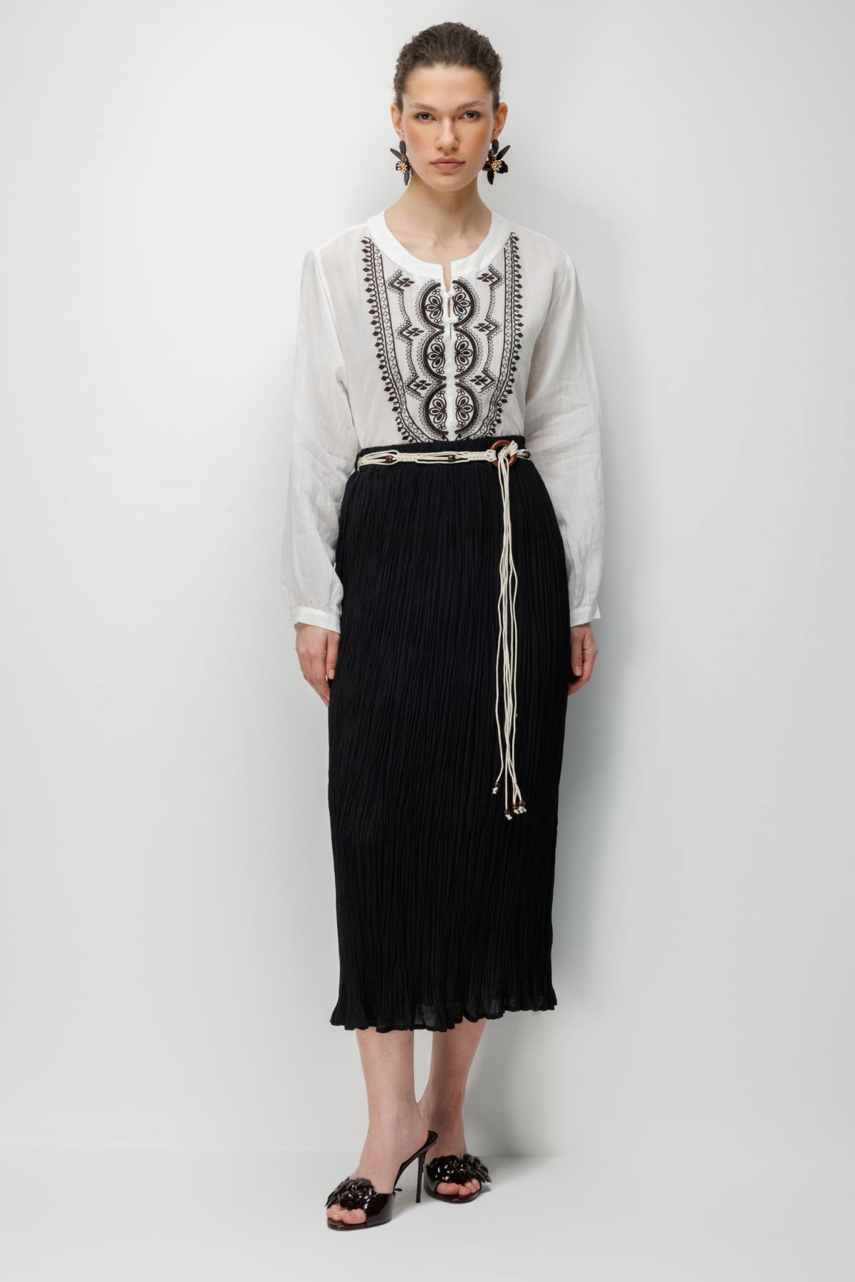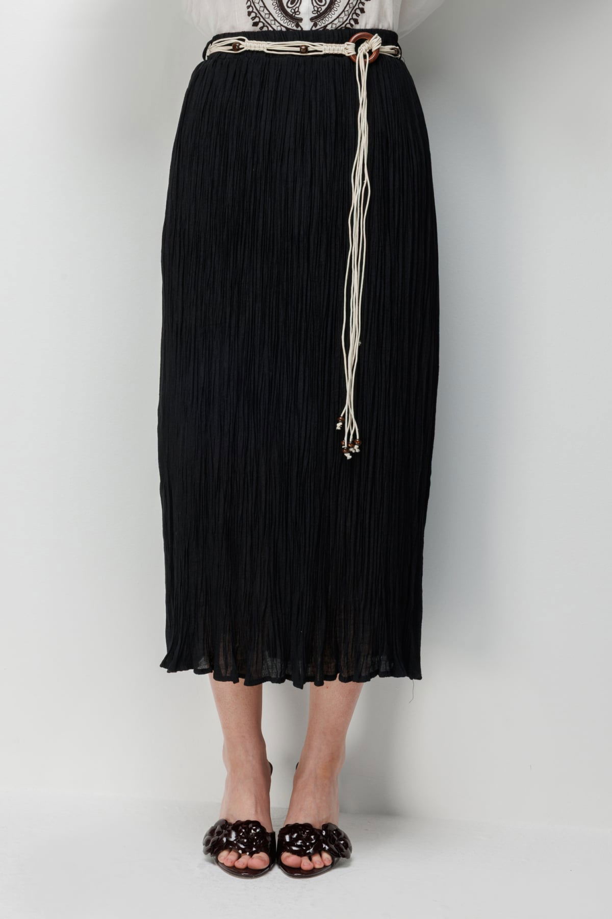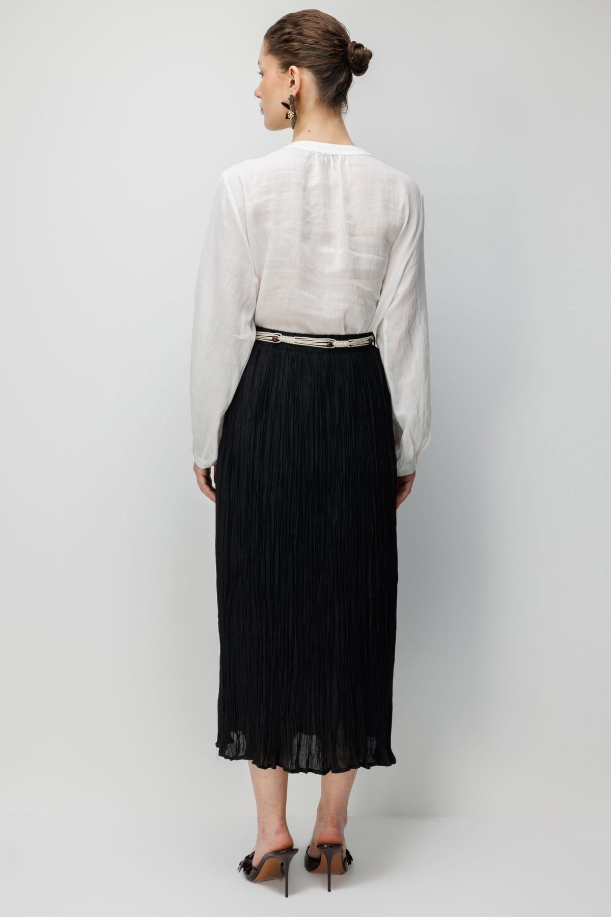 Detay: Dokulu kumaştan üretilmiş, yarım astar detayıyla hafif ve konforlu bir kullanım sunan bu lastikli bel ince etek, zarif tasarımıyla günlük kombinlere modern bir dokunuş katar. Lastikli bel yapısı sayesinde rahat bir oturuş sağlarken, dokulu kumaşı ile şıklığı ön plana çıkarır. Hem günlük kullanımda hem de özel davetlerde gardırobunuzun tamamlayıcı parçalarından biri olmaya adaydır;