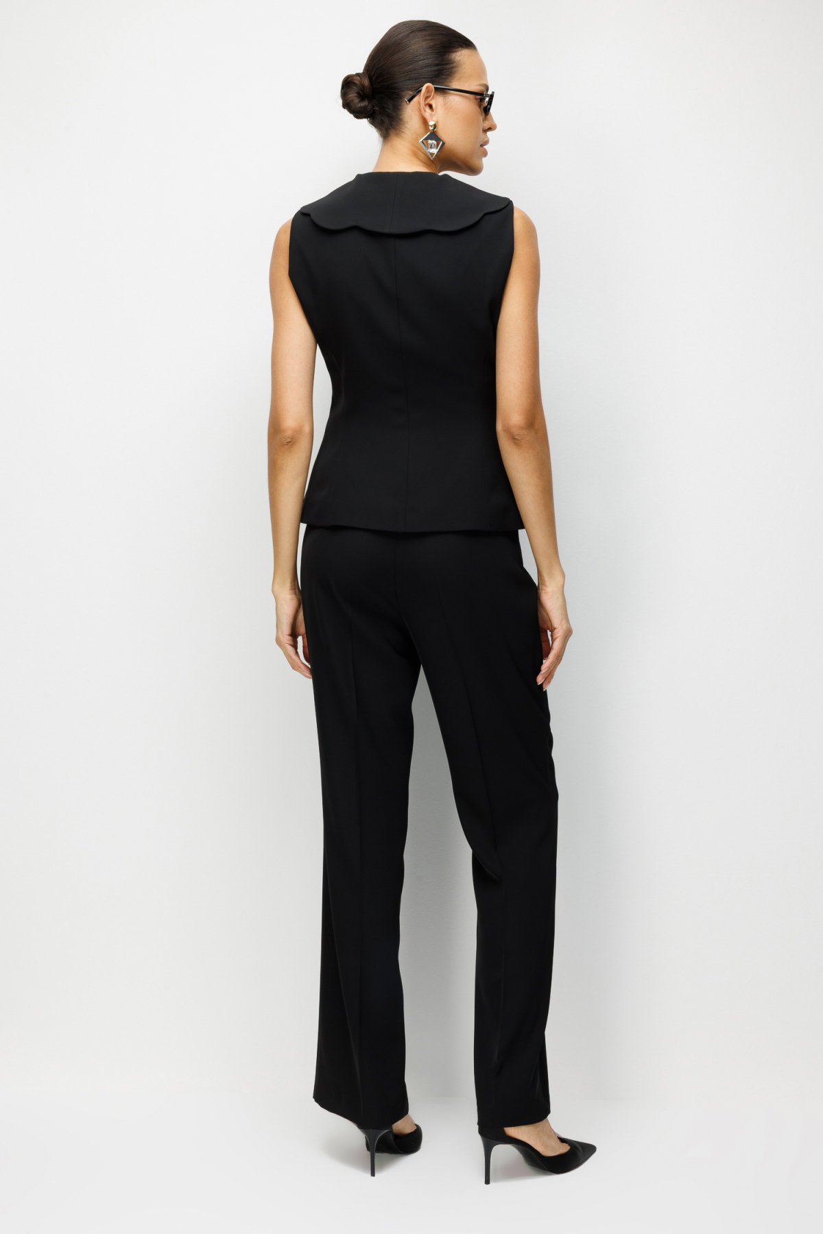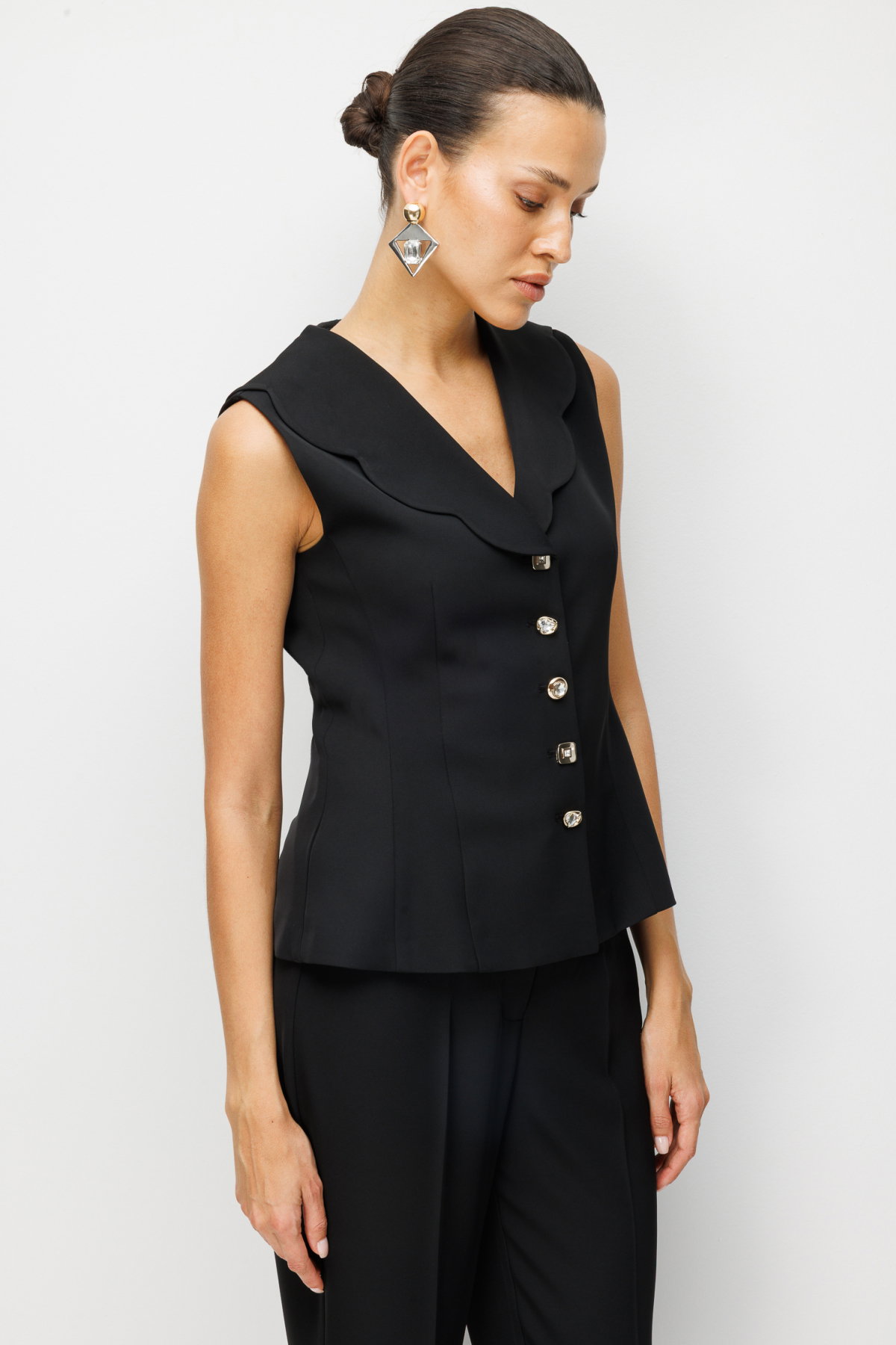 Detay: Dokuma kumaştan üretilen, astarlı, ceket yaka, kolsuz ve düğmeli tasarımıyla öne çıkan bu yelek modern ve zarif bir görünüm sunar. Dokuma kumaş yapısı dayanıklılık ve kaliteli bir duruş sağlarken astarlı formu konforlu bir kullanım imkânı verir. Ceket yaka klasik bir şıklık kazandırırken kolsuz tasarım özgür bir hareket alanı sunar. Düğmeli kapama fonksiyonel bir detay olarak öne çıkarken, yeleğin genel tasarımı sofistike ve zamansız bir stil ortaya koyar;