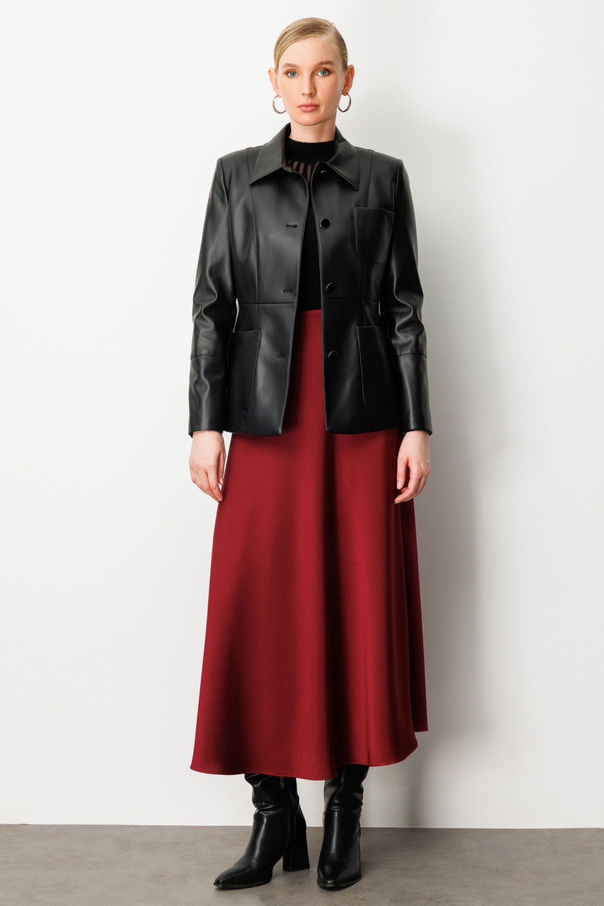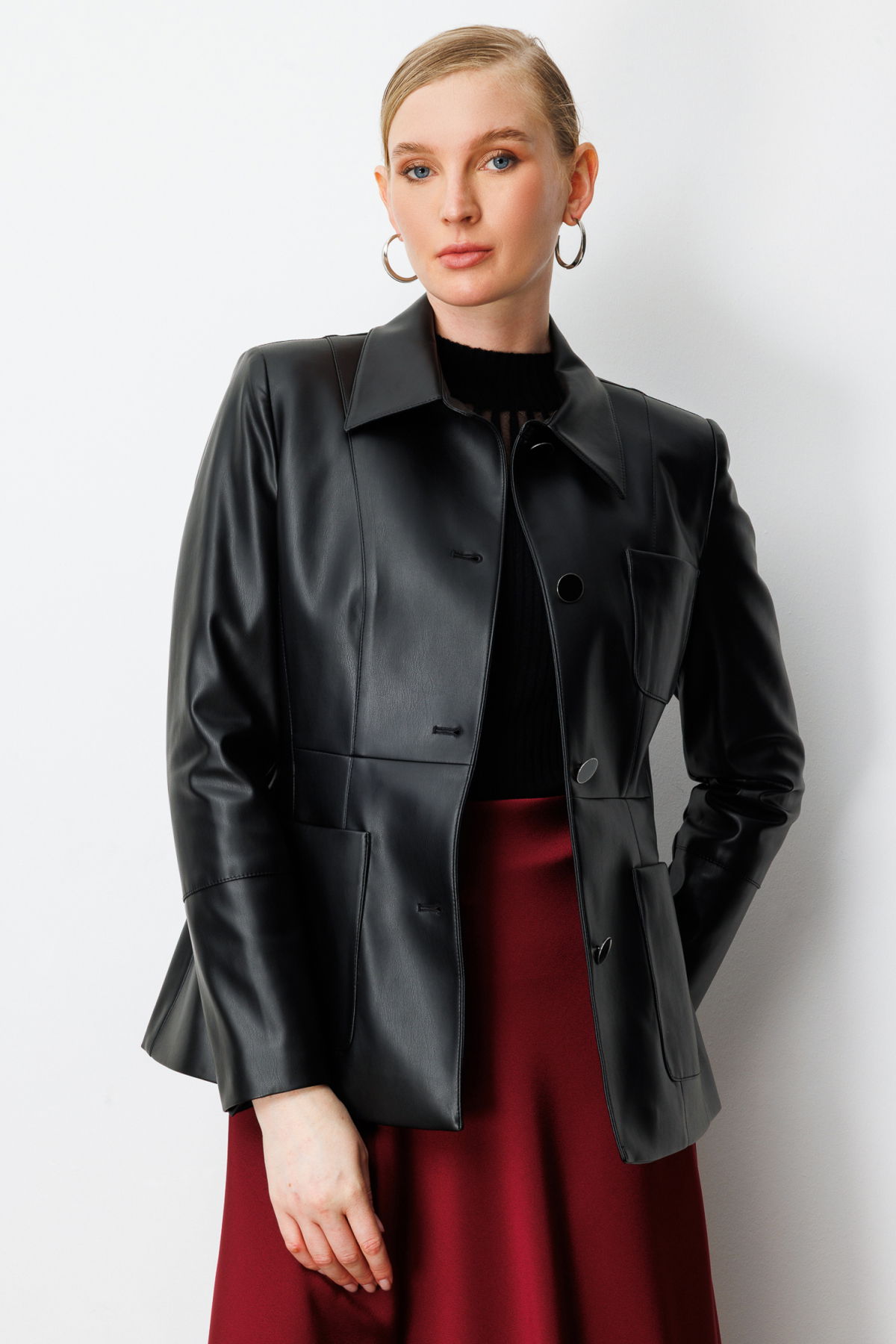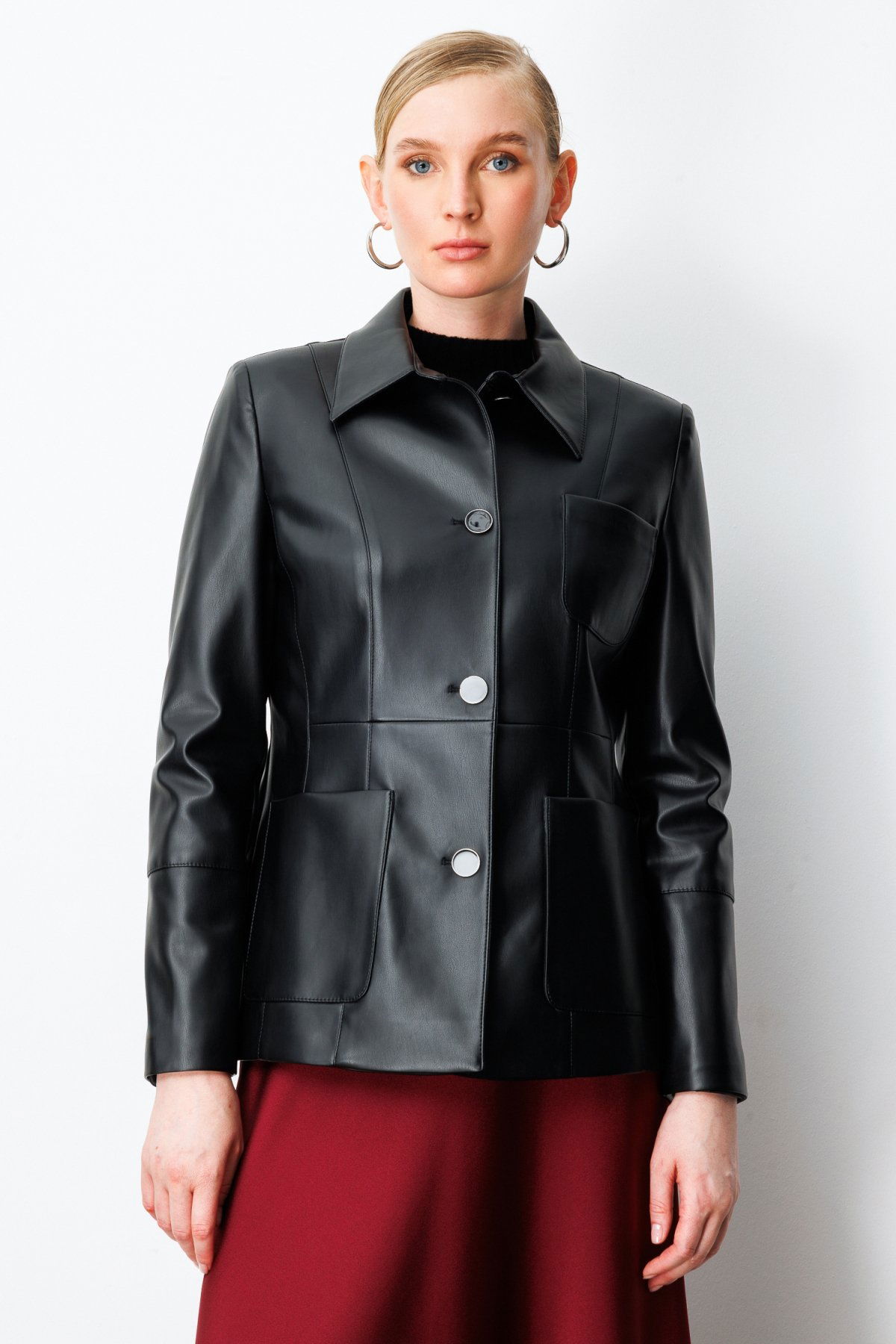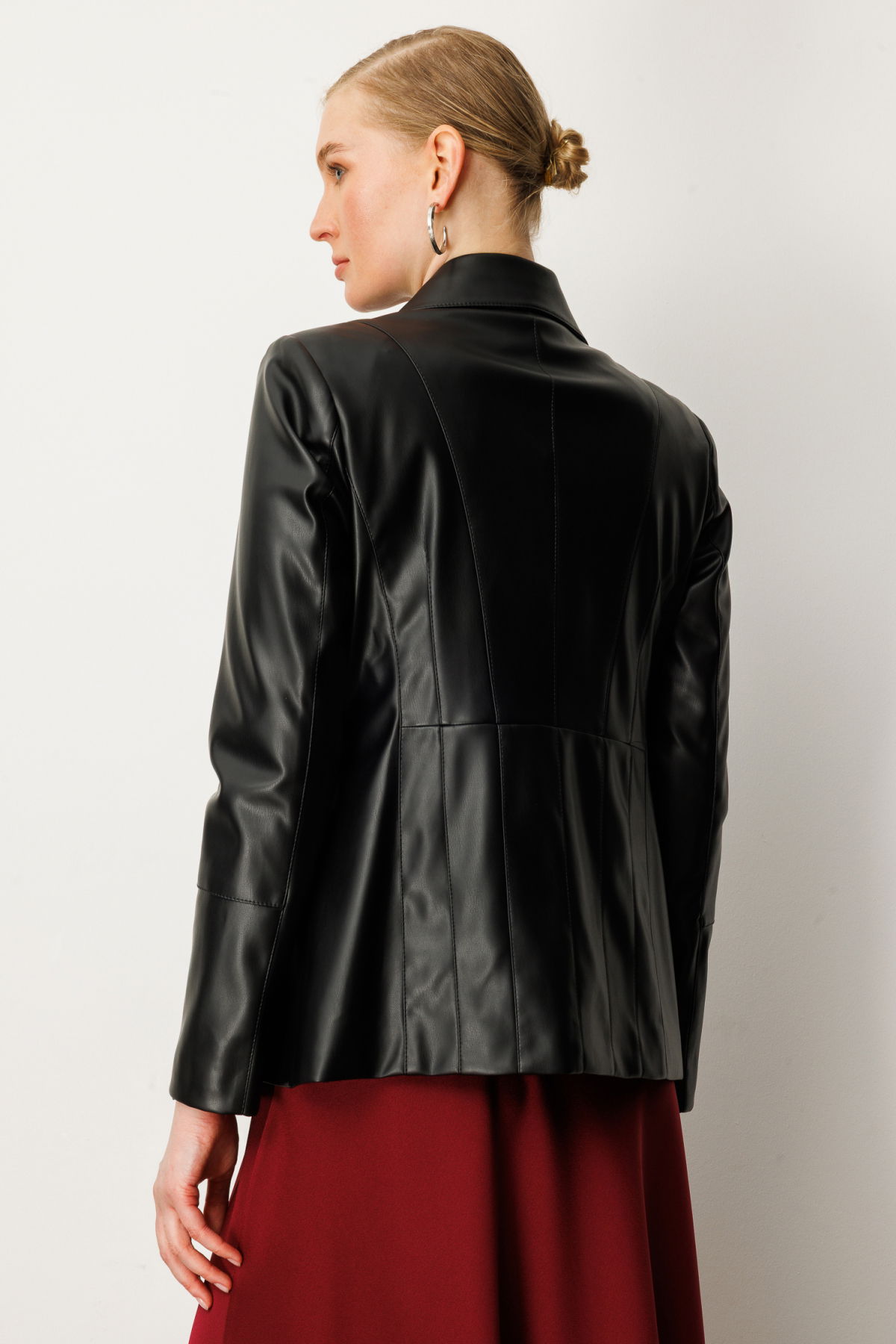 Detay: Ceket yaka tasarımıyla klasik şıklığı yansıtan bu astarlı suni deri ceket, uzun kollu ve düğmeli kol detaylarıyla güçlü bir duruş sergiler. Torba cepleri hem fonksiyonellik hem de stil kazandırırken, suni deri dokusu sayesinde modern ve çevre dostu bir alternatif sunar. Şehir hayatının temposuna uyum sağlayan bu ceket, hem günlük kombinlerde hem de özel anlarda stilinizi tamamlamak için ideal bir seçimdir;