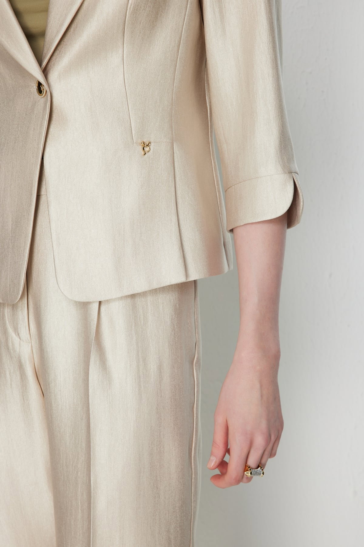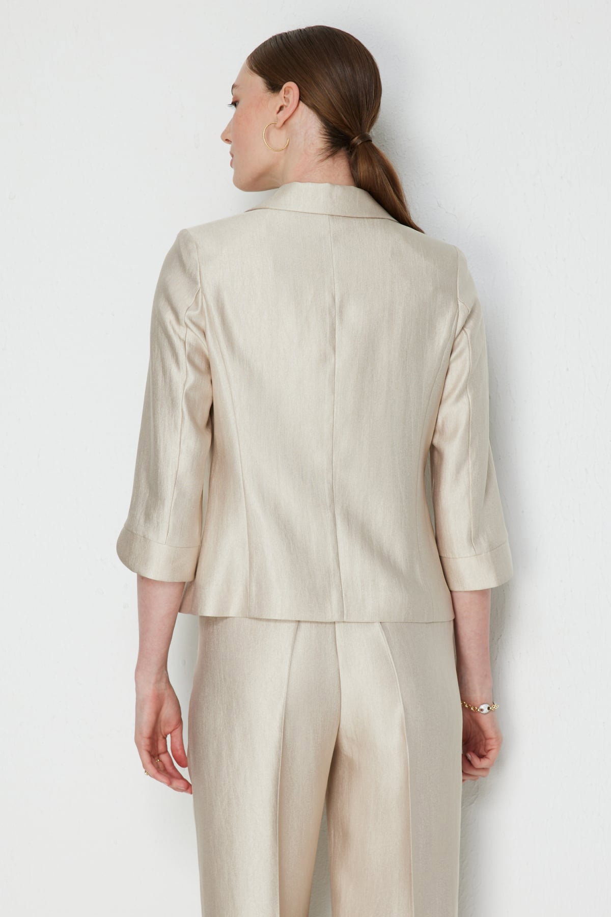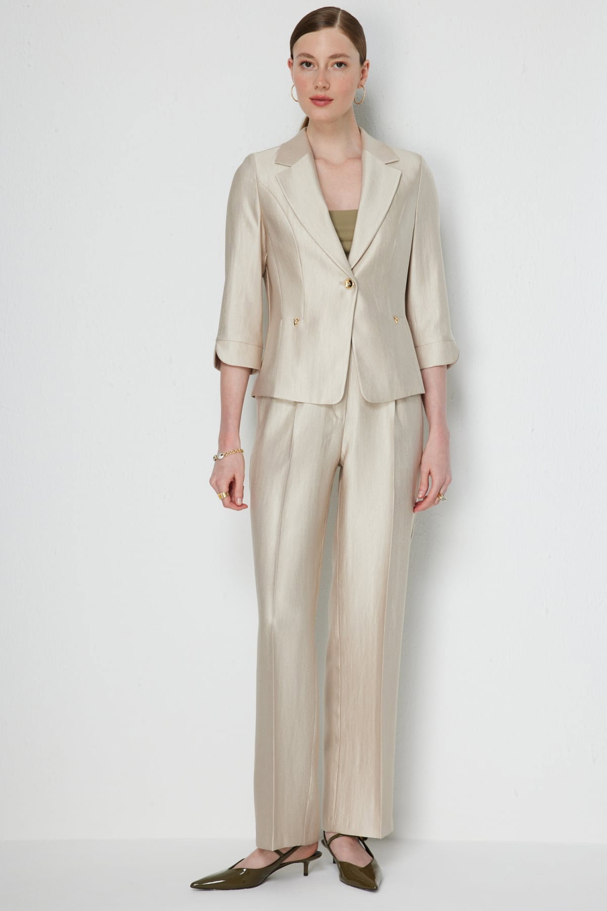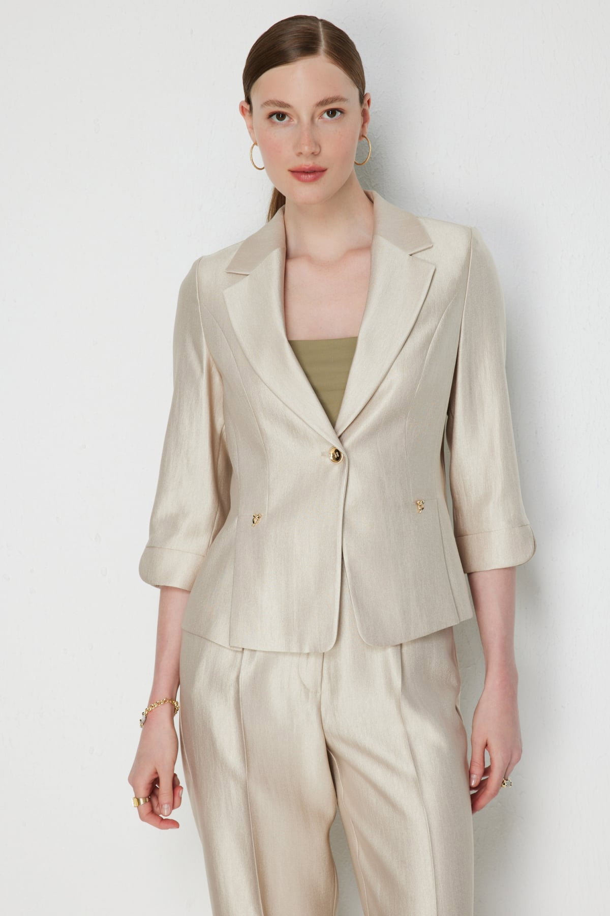 Detay: Dokuma kumaş, astarsız, ceket yaka, vatkalı, truvakar kollu, düğmeli ve cepsiz bu ceket modeli klasik ve güçlü bir şıklık sunar. Dokuma kumaşın kaliteli dokusu hafif ve rahat bir kullanım sağlarken astarsız yapısı serin bir his verir. Ceket yaka sofistike bir görünüm kazandırırken vatkalı omuz detayı iddialı bir duruş ortaya çıkarır. Truvakar kol modern bir stil sunarken düğmeli kapama pratiklik ve klasik bir şıklık sağlar. Cepsiz tasarım ise minimal ve temiz bir görünüm sunar;