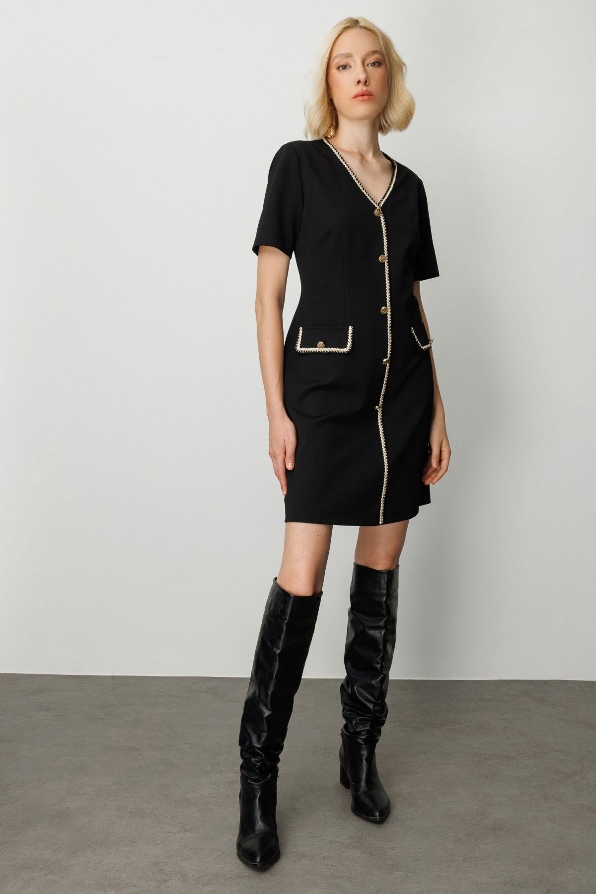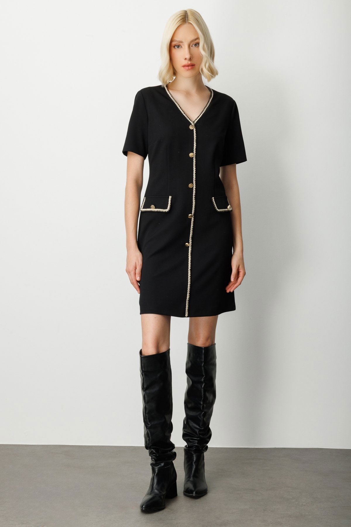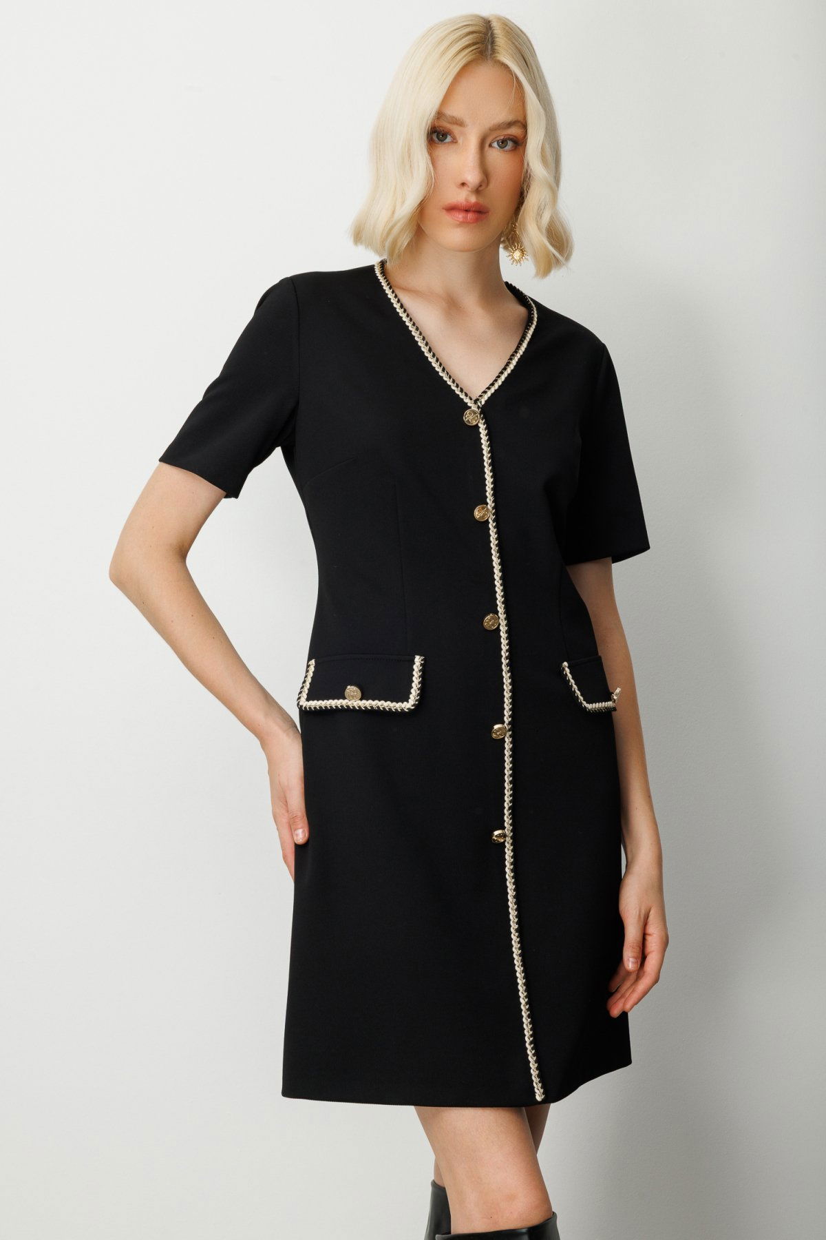 Detay: Polyester kumaştan üretilmiş, astarlı yapısıyla konforlu bir kullanım sunan bu midi elbise; V yaka detayıyla feminen ve zarif bir görünüm kazandırıyor. Kısa kol tasarımı sayesinde sıcak havalarda ideal bir tercih olan model, fermuarlı kapama özelliğiyle pratikliği ve şıklığı bir arada sunuyor. Astarlı dokusu ve midi boy kesimiyle hem günlük kombinlerde hem de özel davetlerde stil sahibi bir duruş sergiliyor;