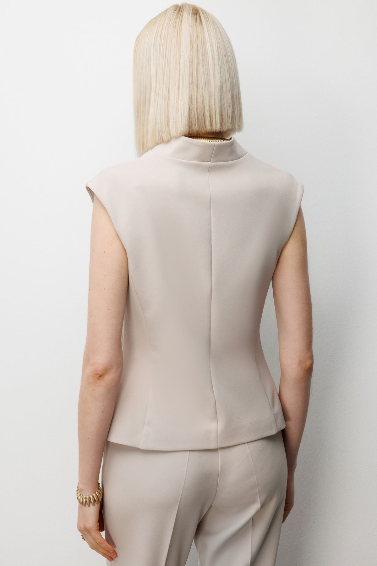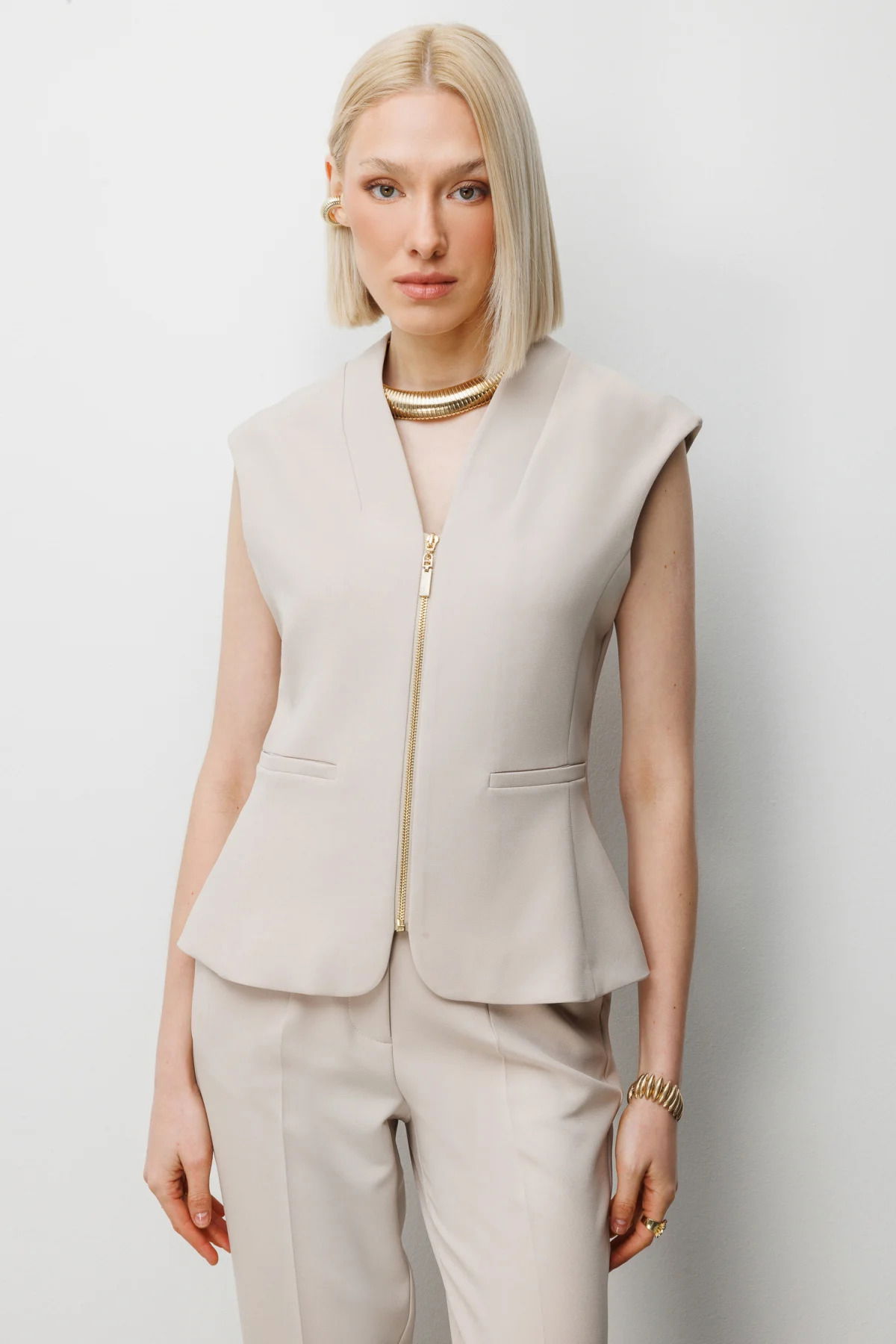 Detay: Polyester dokuma kumaştan üretilmiş, astarlı yapısı sayesinde düzgün bir duruş sunan bu V yaka, kolsuz ve fermuarlı yelek modern tasarımıyla şıklığı ön plana çıkarır. V yaka detayı zarif bir görünüm sağlarken, kolsuz yapısı sayesinde katmanlı kombinlerde rahatlıkla kullanılabilir. Fermuarlı kapama pratik bir kullanım sunarken, polyester dokusu uzun süre formunu korur. Hem günlük kombinlerde hem de özel davetlerde tercih edilebilecek bu yelek, gardırobunuzun tamamlayıcı parçalarından biri olmaya adaydır;
