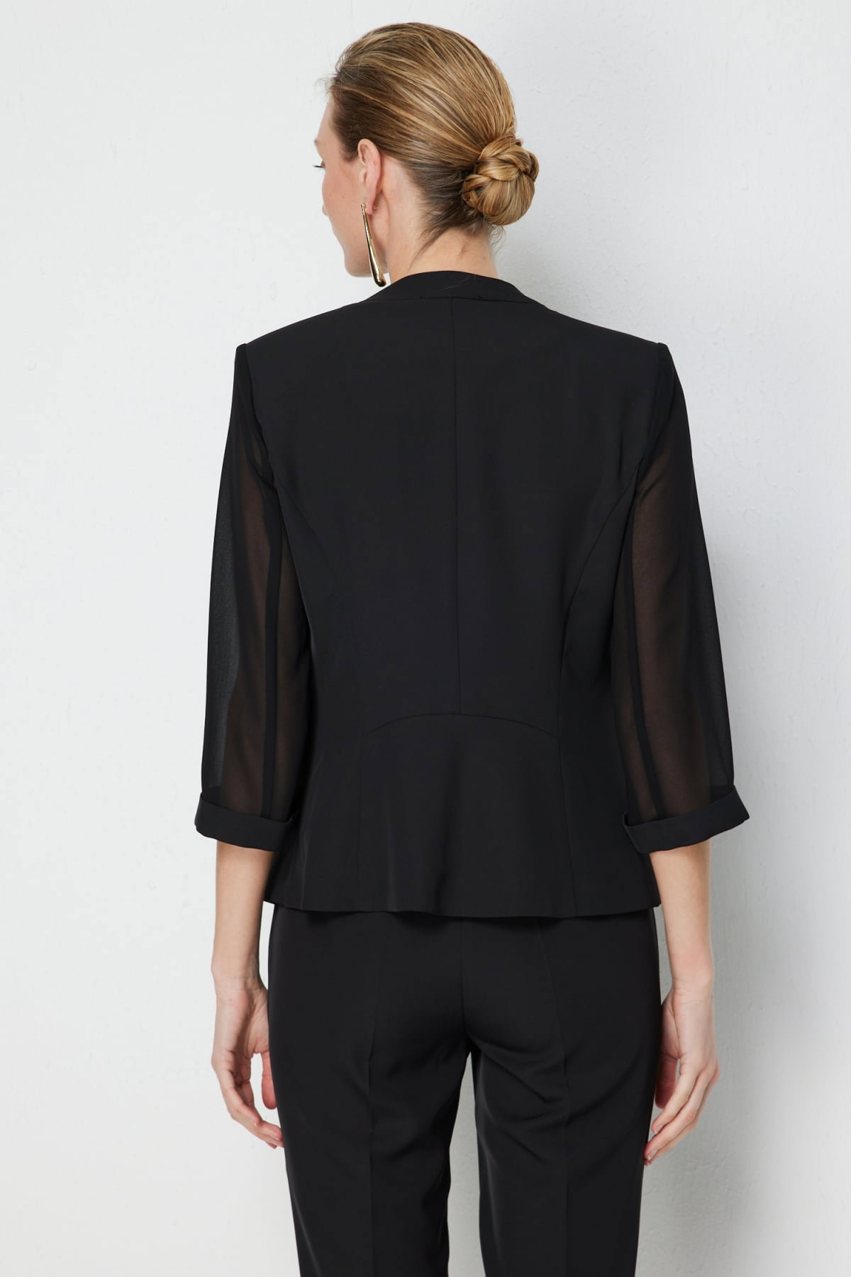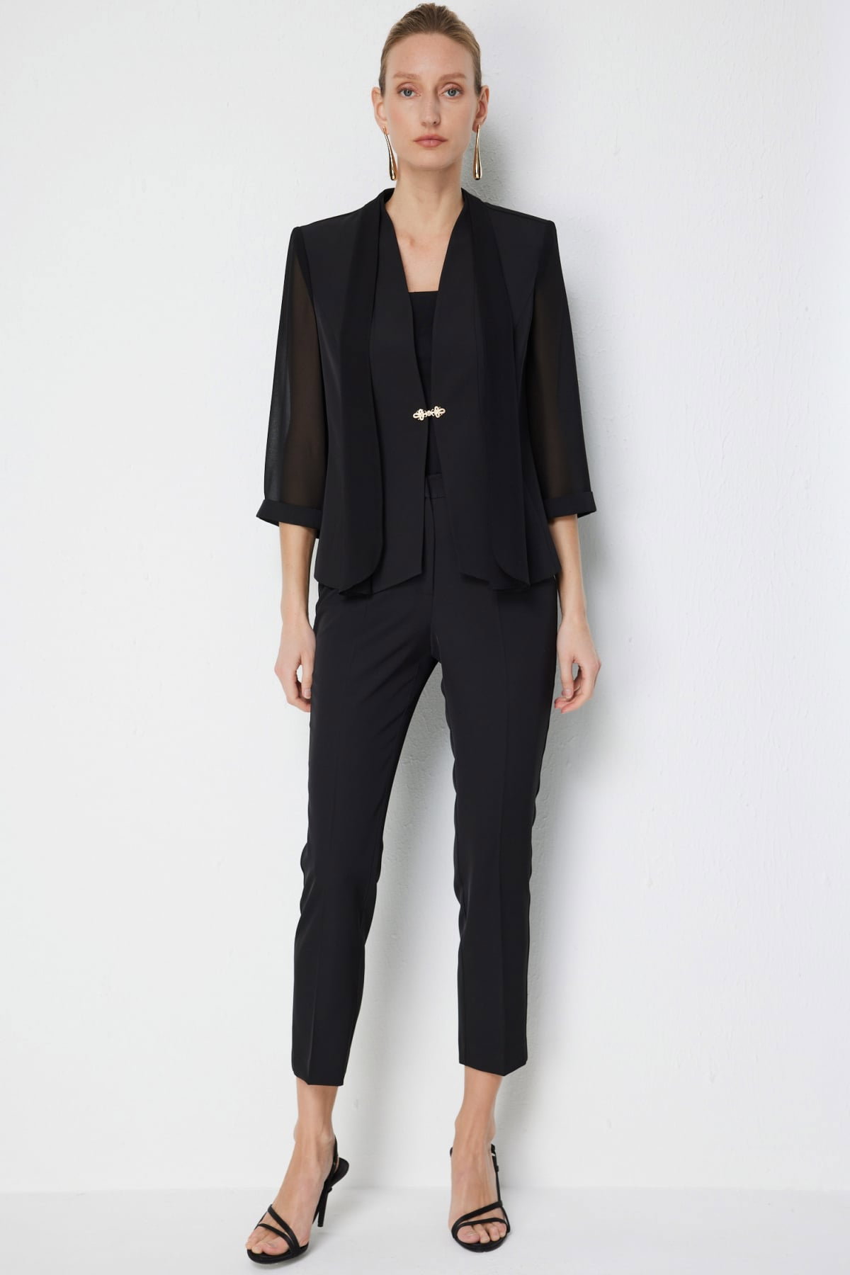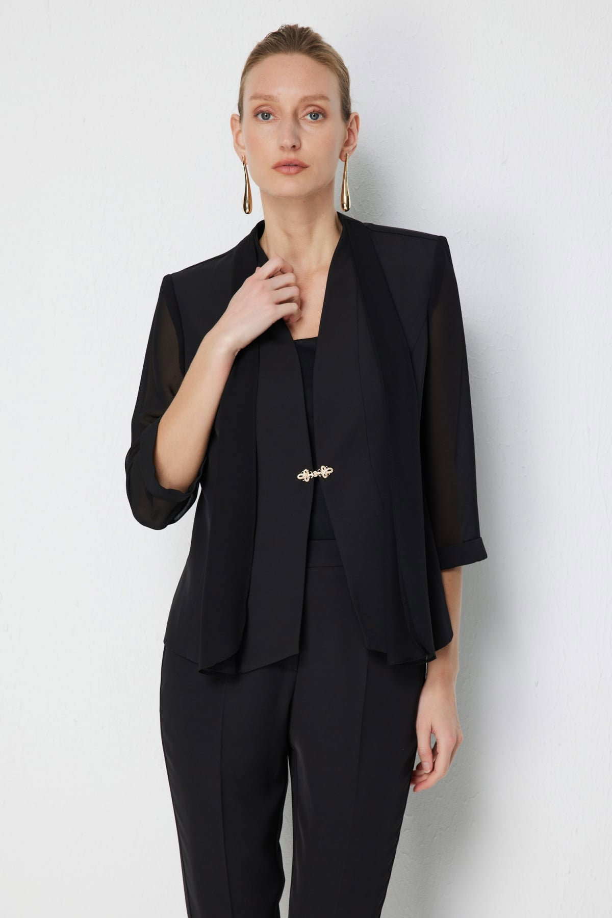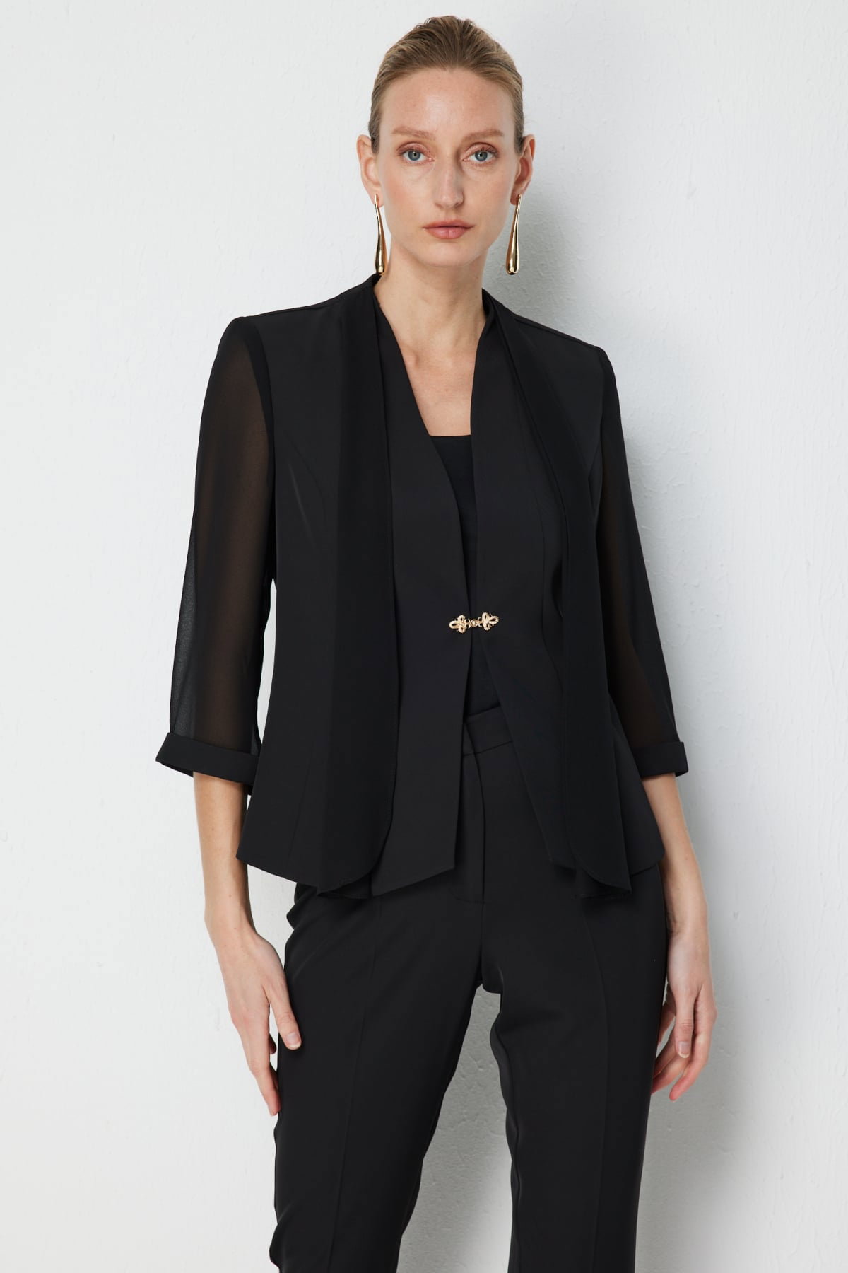 Detay: Dokuma kumaş, yarım astarlı, ceket yaka, vatkalı, truvakar kollu ve kancalı bu ceket modeli klasik ve güçlü bir şıklık sunar. Kumaşın dokusu hafif ve rahat bir kullanım sağlarken yarım astar düzgün bir duruş verir. Ceket yaka sofistike bir görünüm kazandırırken vatkalı omuzlar iddialı bir duruş ortaya çıkarır. Truvakar kol modern bir stil sunarken kancalı kapama farklı ve zarif bir detay olarak öne çıkar;