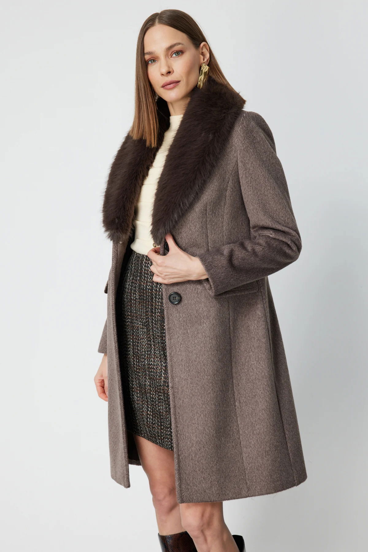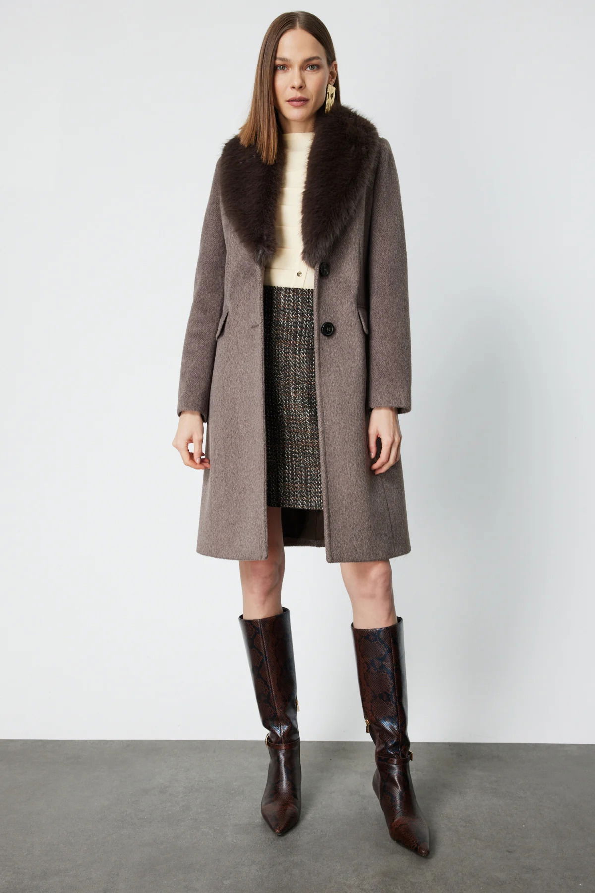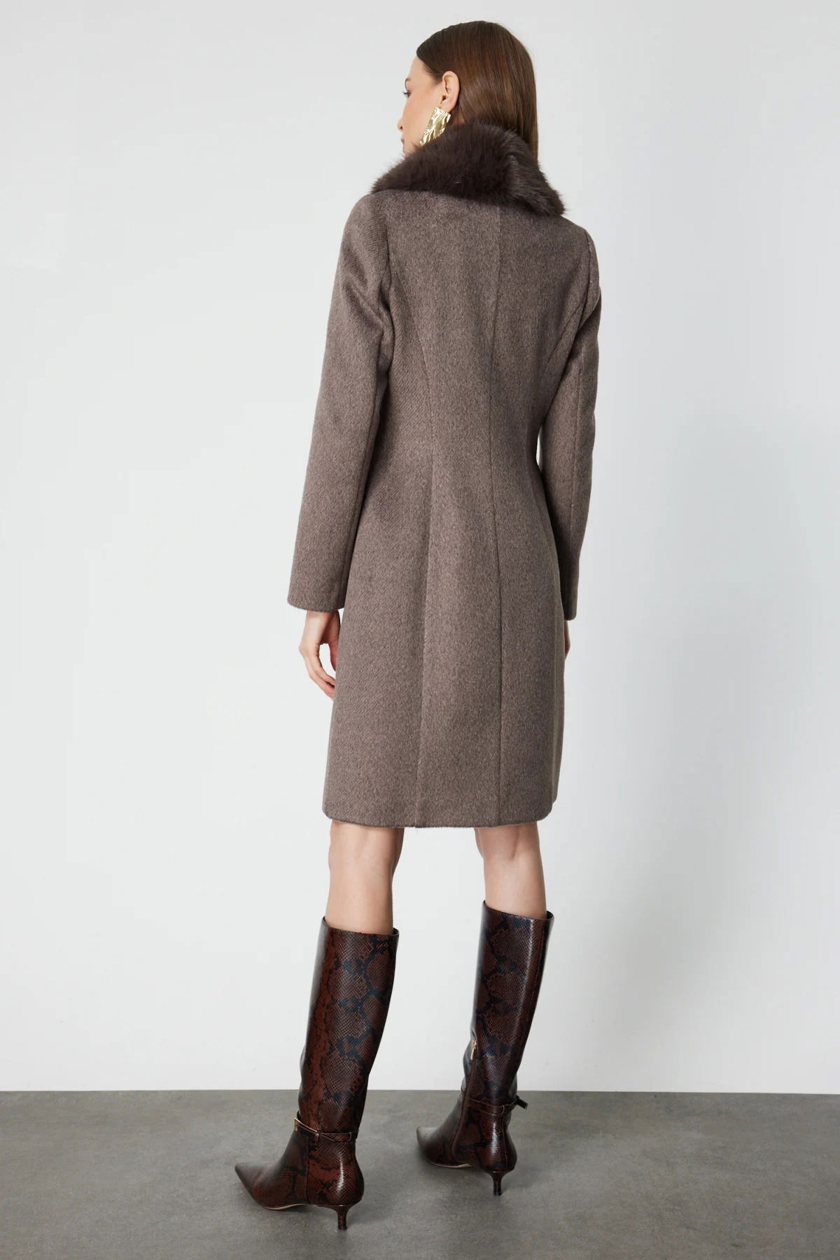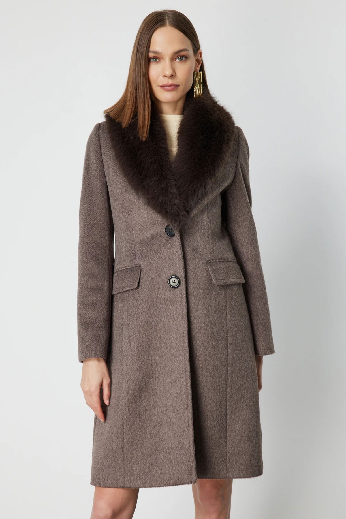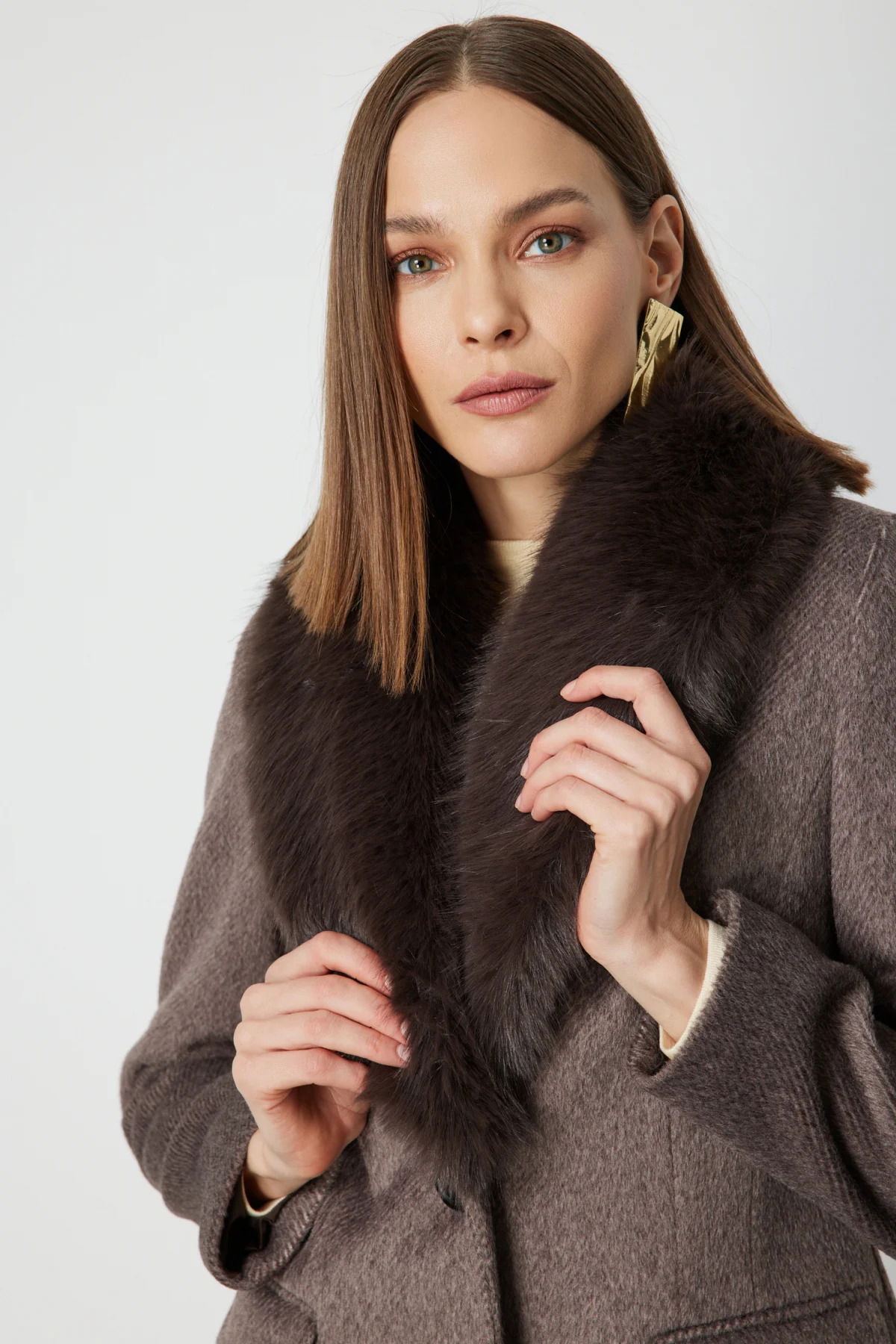 Ekol Kadın Yakası Kürklü Kapak Cepli Kaban 6065 Mokka