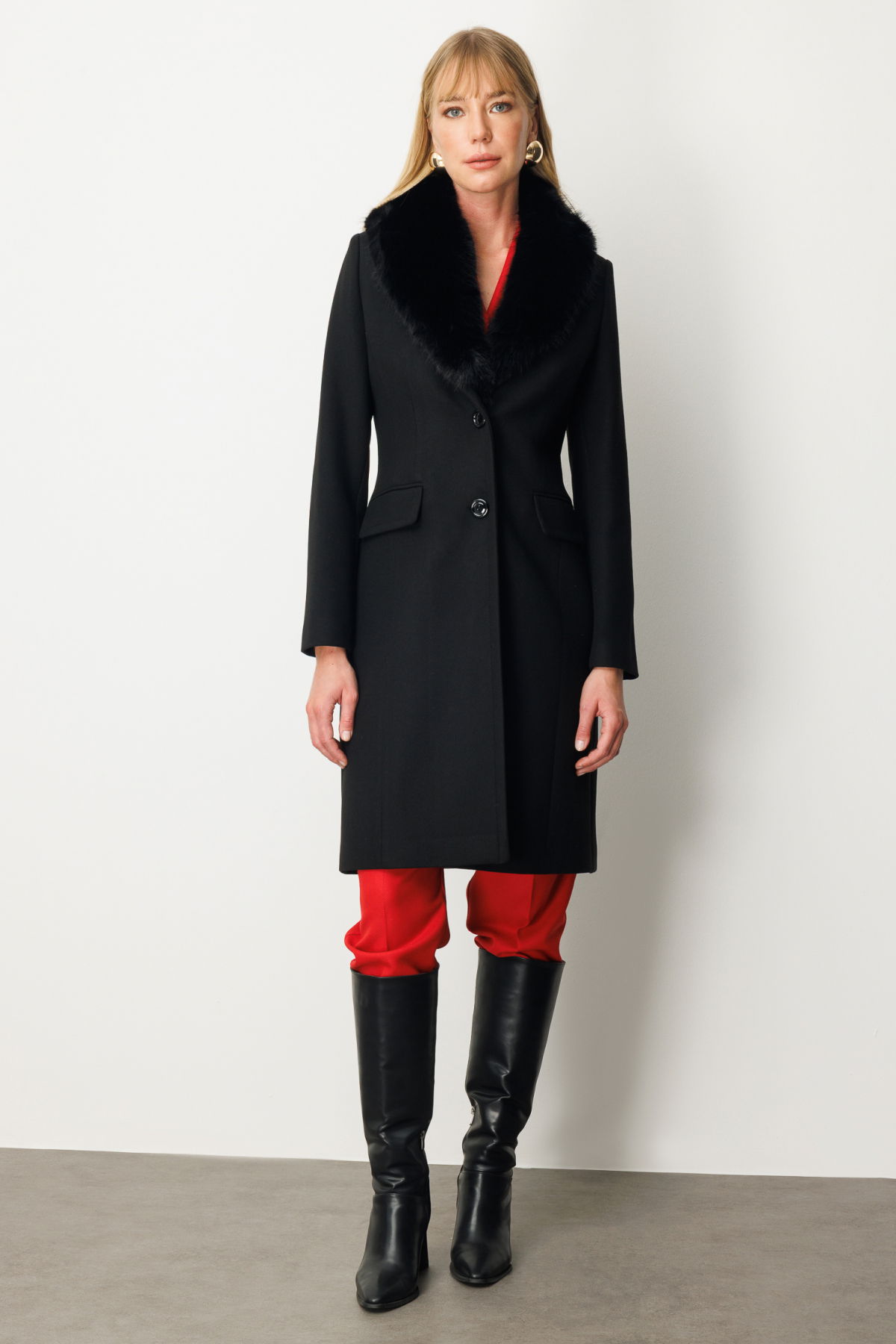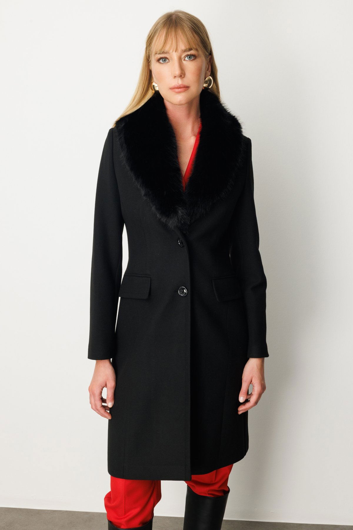 Ekol Kadın Yakası Kürklü Kapak Cepli Kaban 6065 Siyah
