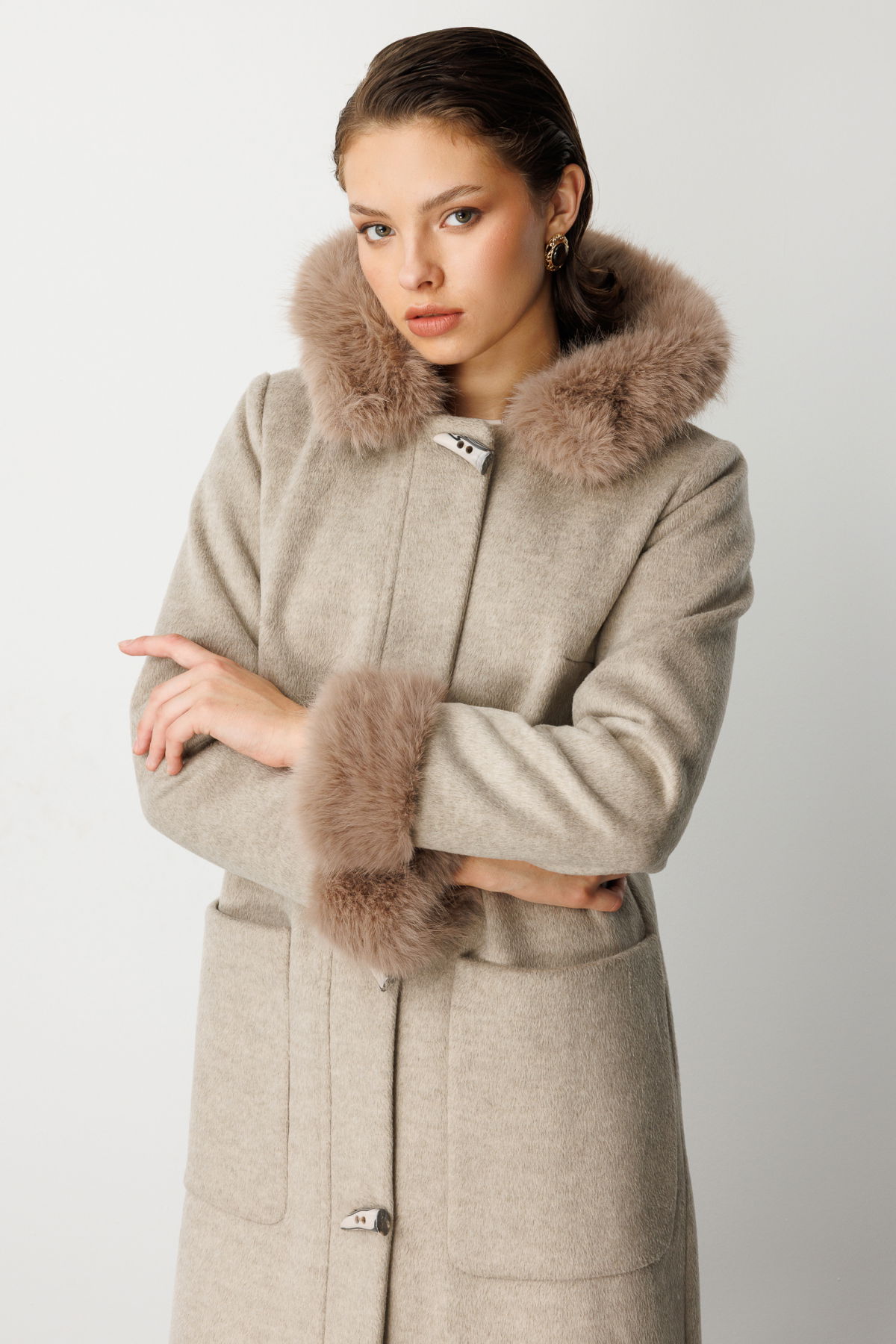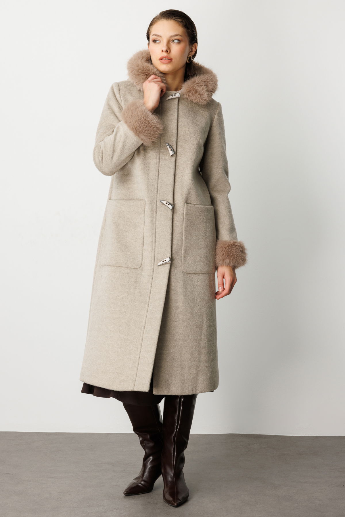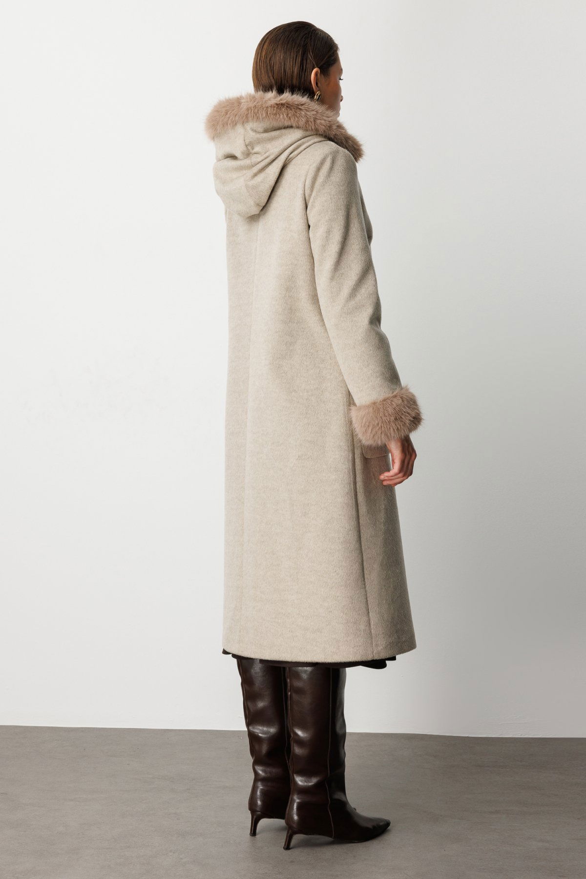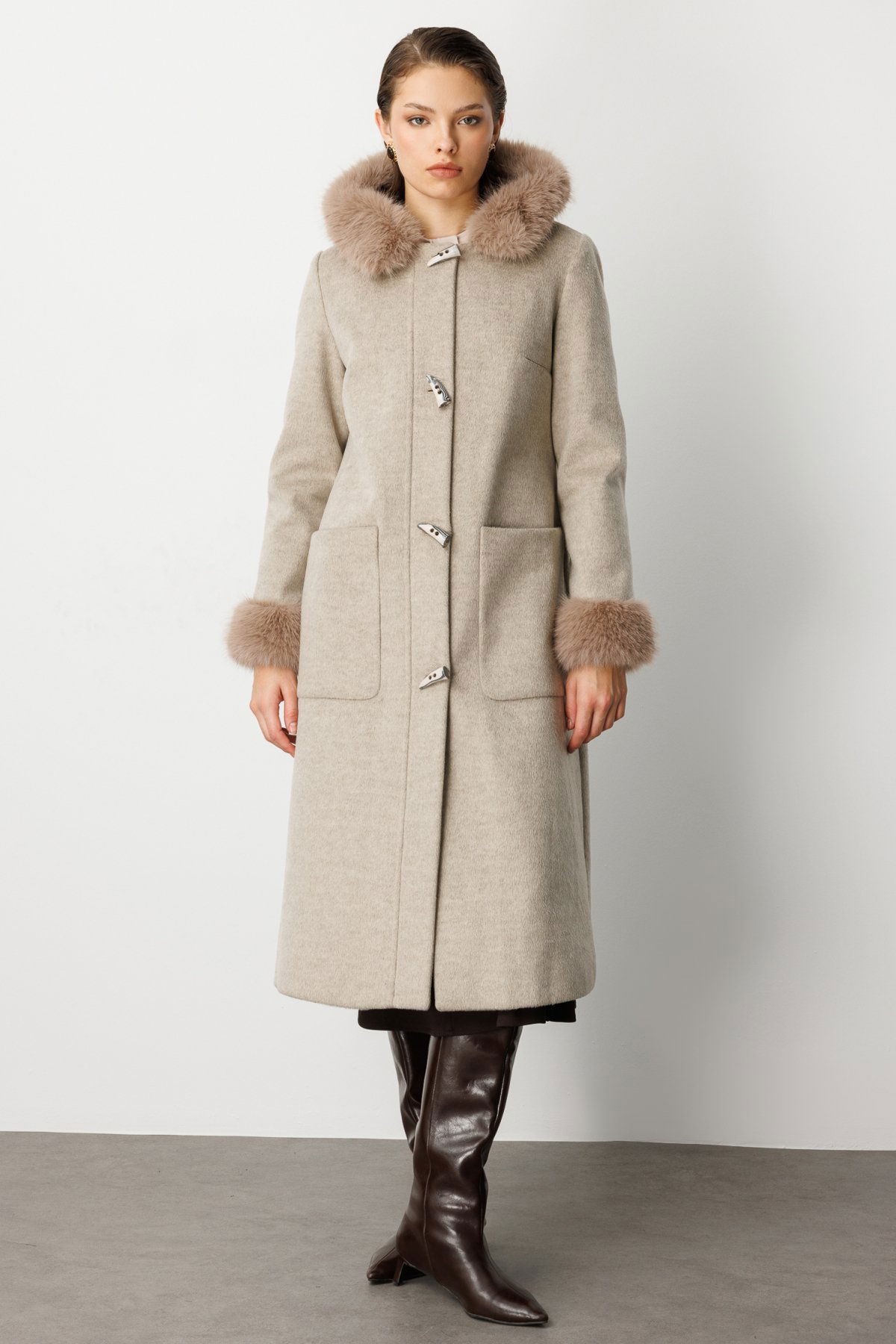 Ekol Kadın Yakası Ve Kolları Kürklü Kaşe Kaban 6055 Vizon