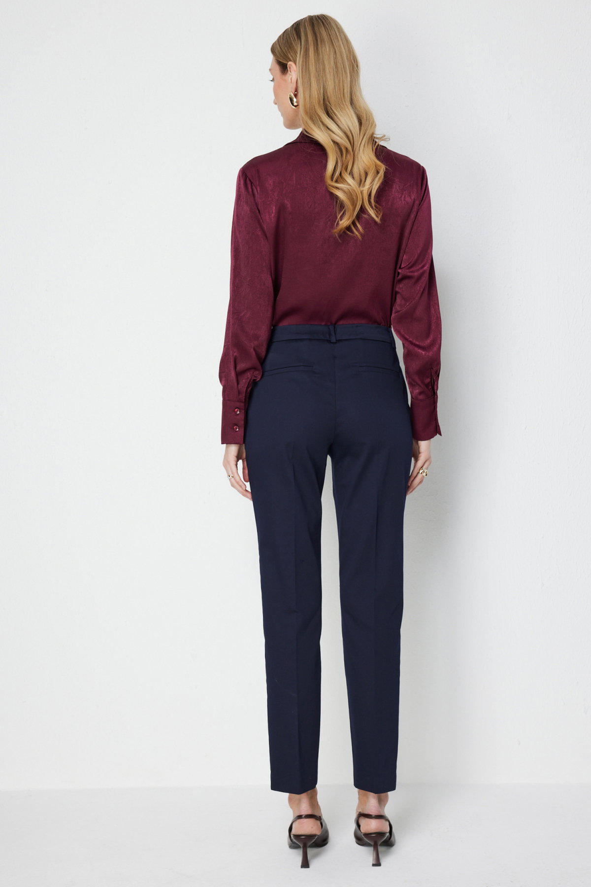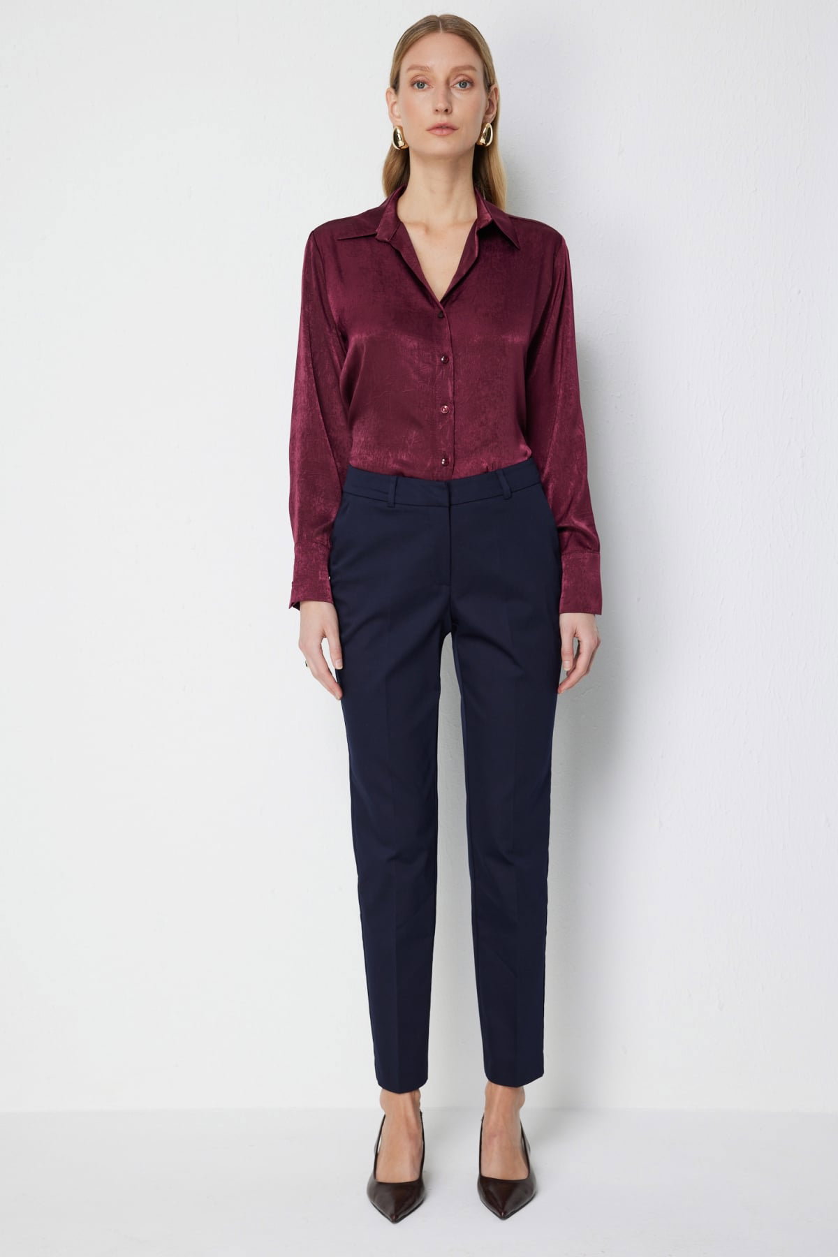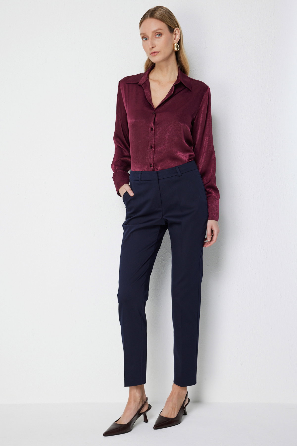 Detay: Dokuma kumaştan üretilen, astarsız, normal bel, dar paça, fermuarlı ve yan cepli bu pantolon modeli tüm bu özellikleri ile modern ve kullanışlı bir görünüm sunar. Normal bel tasarımı günlük kullanımda rahatlık sağlarken dar paça formu şık ve zarif bir siluet oluşturur. Fermuarlı kapama şekli pratiklik sunarken yan cep detayı işlevsellik katarak pantolonu hem estetik hem de fonksiyonel bir parça haline getirir;