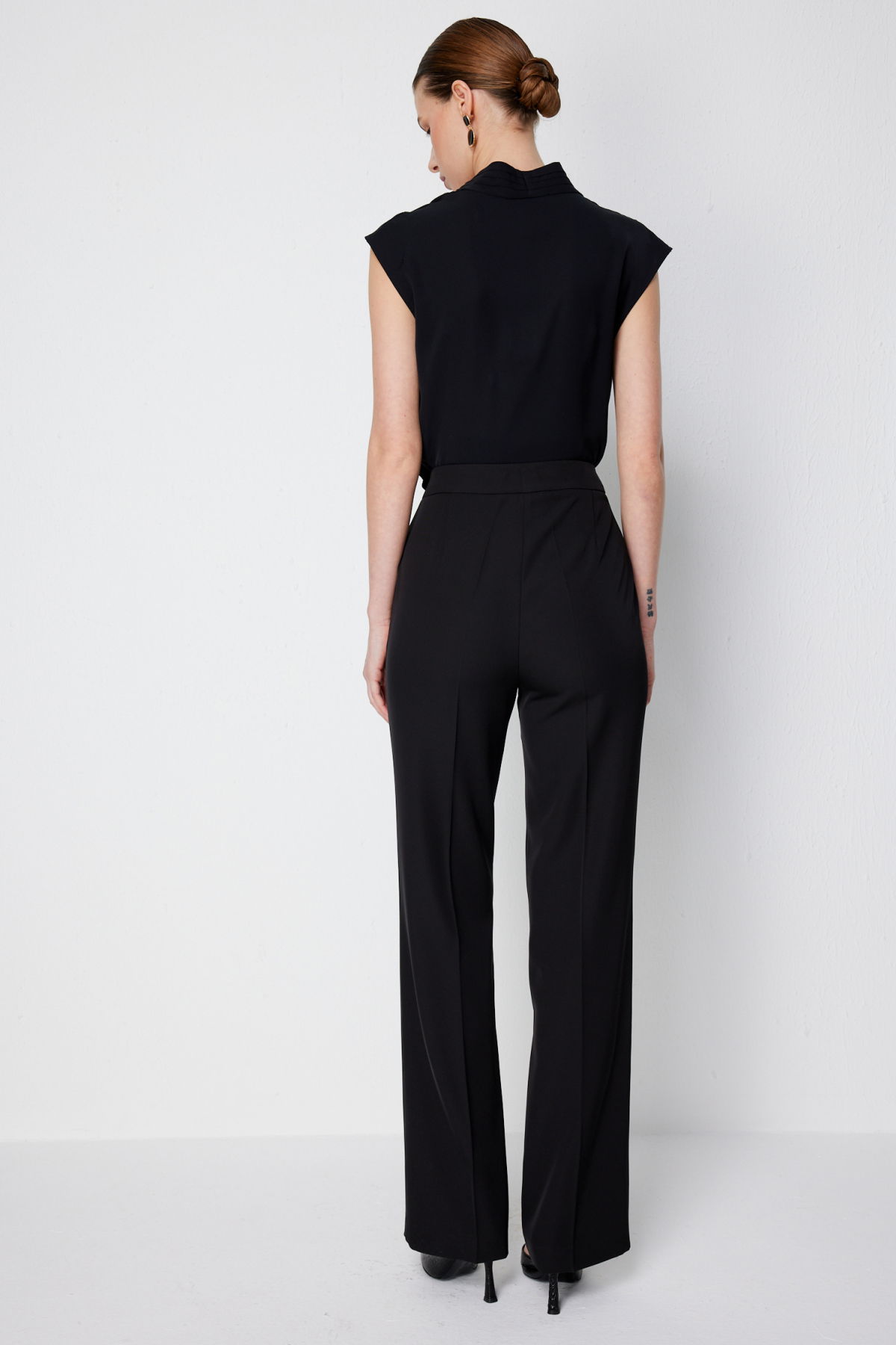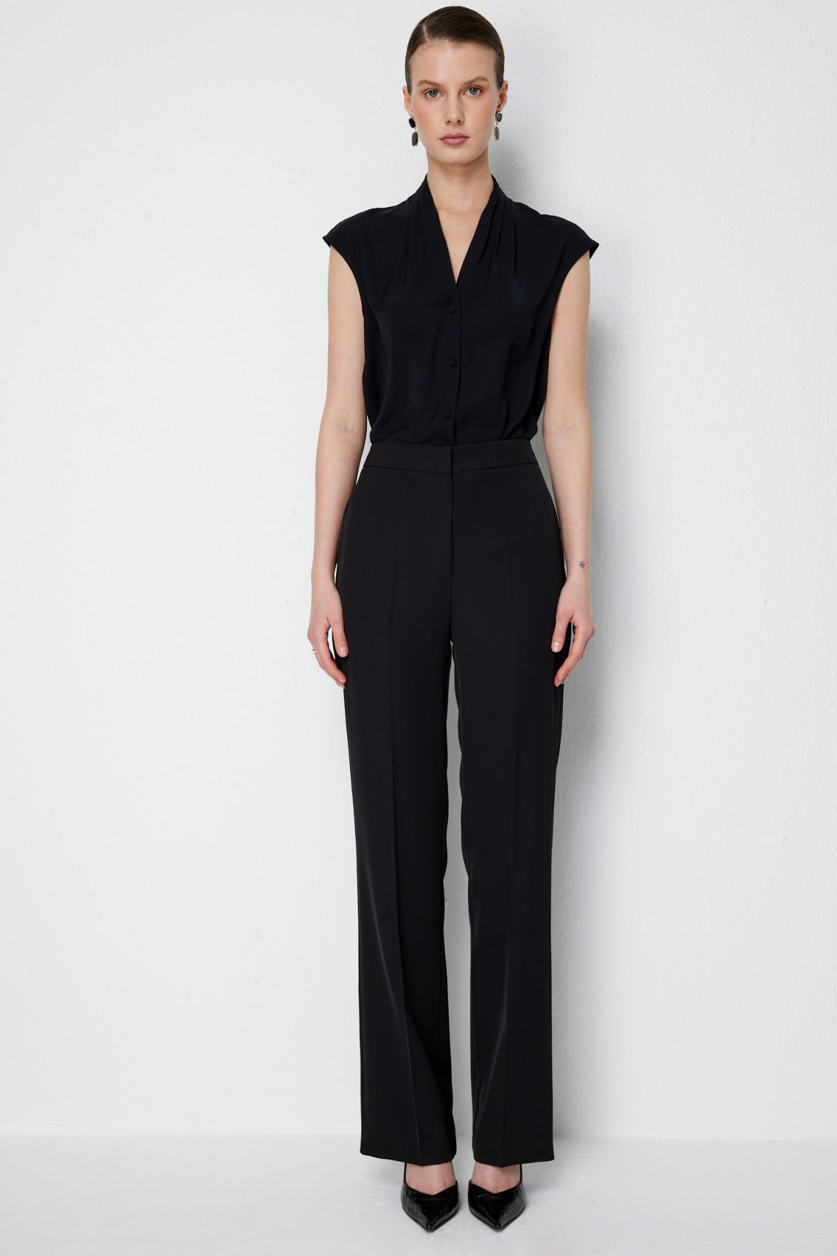 Detay: Polyester kumaştan üretilen, astarsız, yüksek bel, boru paça, fermuarlı ve cepsiz bu pantolon modeli tüm bu özellikleri ile modern ve zarif bir görünüm sunar. Yüksek bel tasarımı bel hattını vurgulayarak daha uzun bir siluet etkisi yaratırken boru paça formu klasik ve şık bir duruş sağlar. Fermuarlı kapama şekli pratiklik sunarken cepsiz tasarım minimal bir estetik kazandırarak sade ve çağdaş bir tarz ortaya çıkarır;
