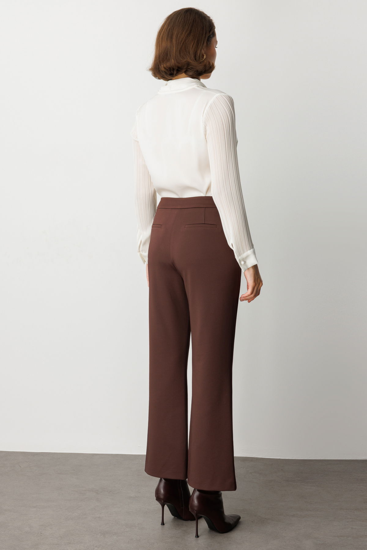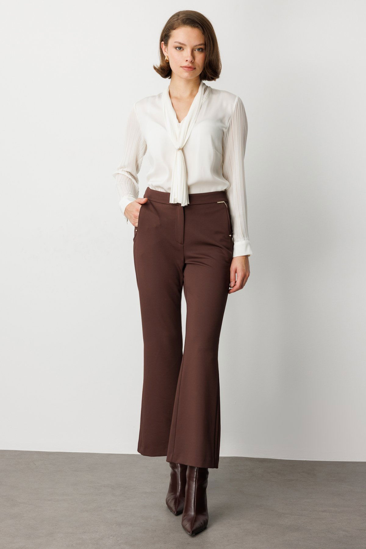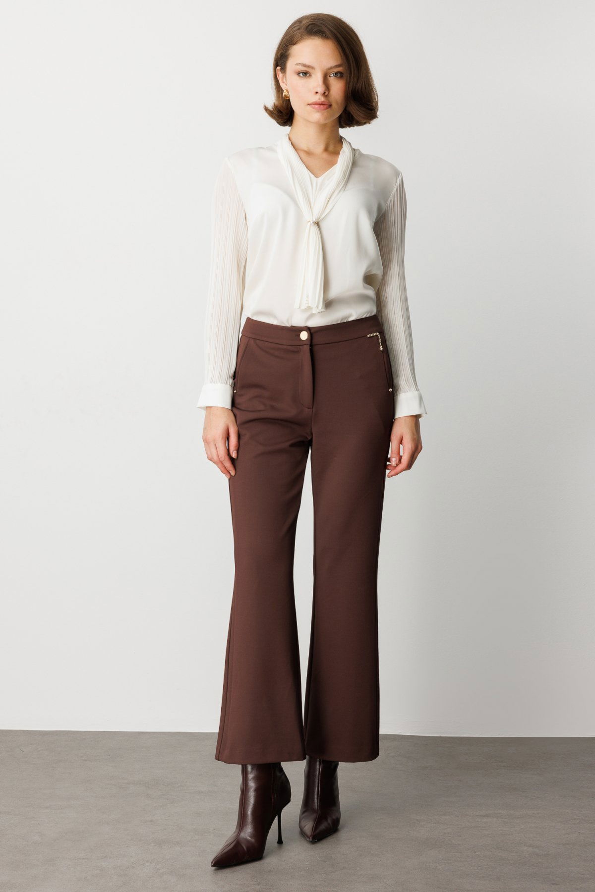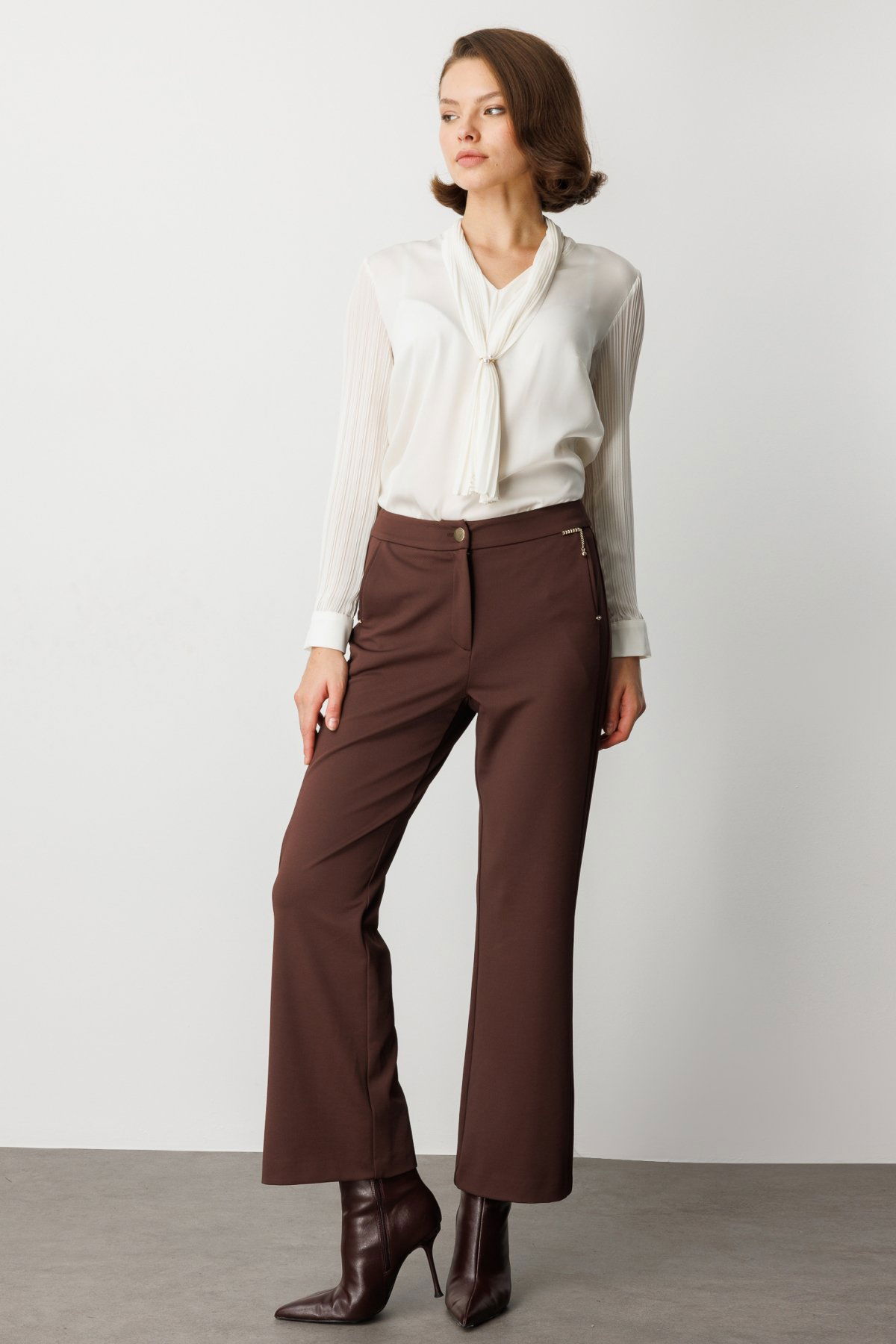 Detay: Zarif ve sade tasarımıyla dikkat çeken bu yüksek bel pantolon, polyester kumaşı sayesinde hafiflik ve rahatlık sunar. Astarsız yapısı ile serin havalarda ideal bir kullanım sağlarken, boru paça kesimiyle klasik ve dengeli bir siluet oluşturur. Fermuarlı kapama detayı pratiklik katarken, yan cepleriyle günlük fonksiyonelliği artırır. Hem ofis stiline hem de günlük kombinlere kolayca uyum sağlayan şık bir tercihtir;