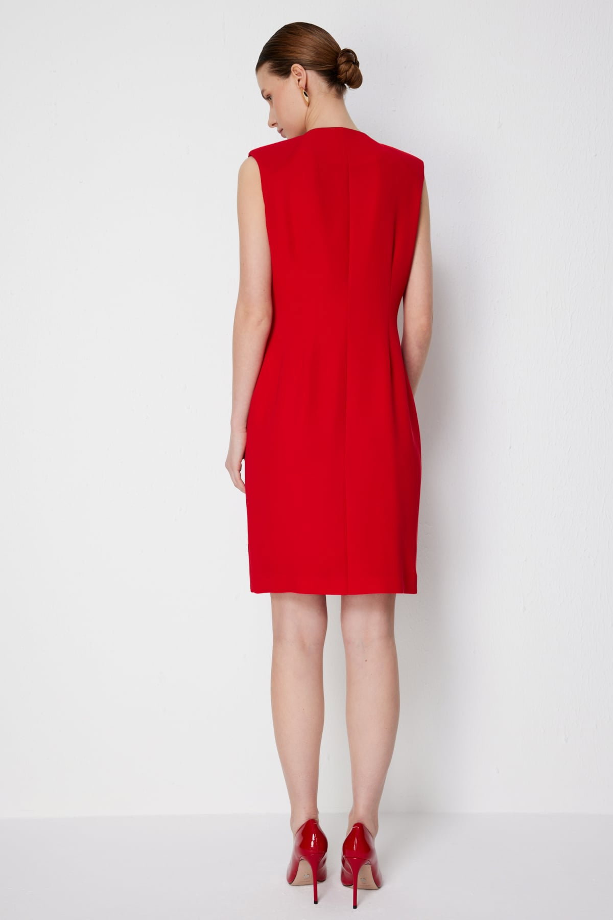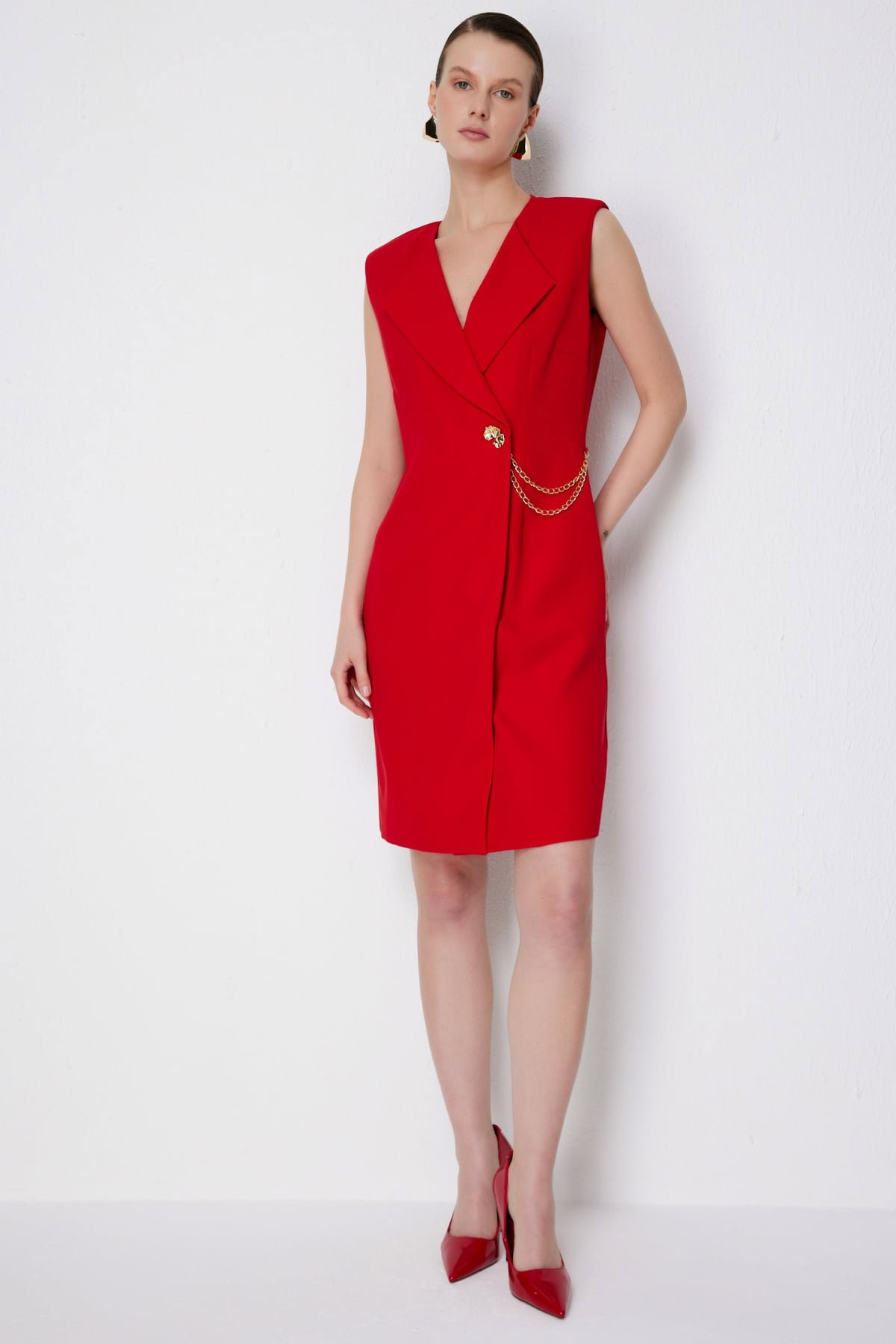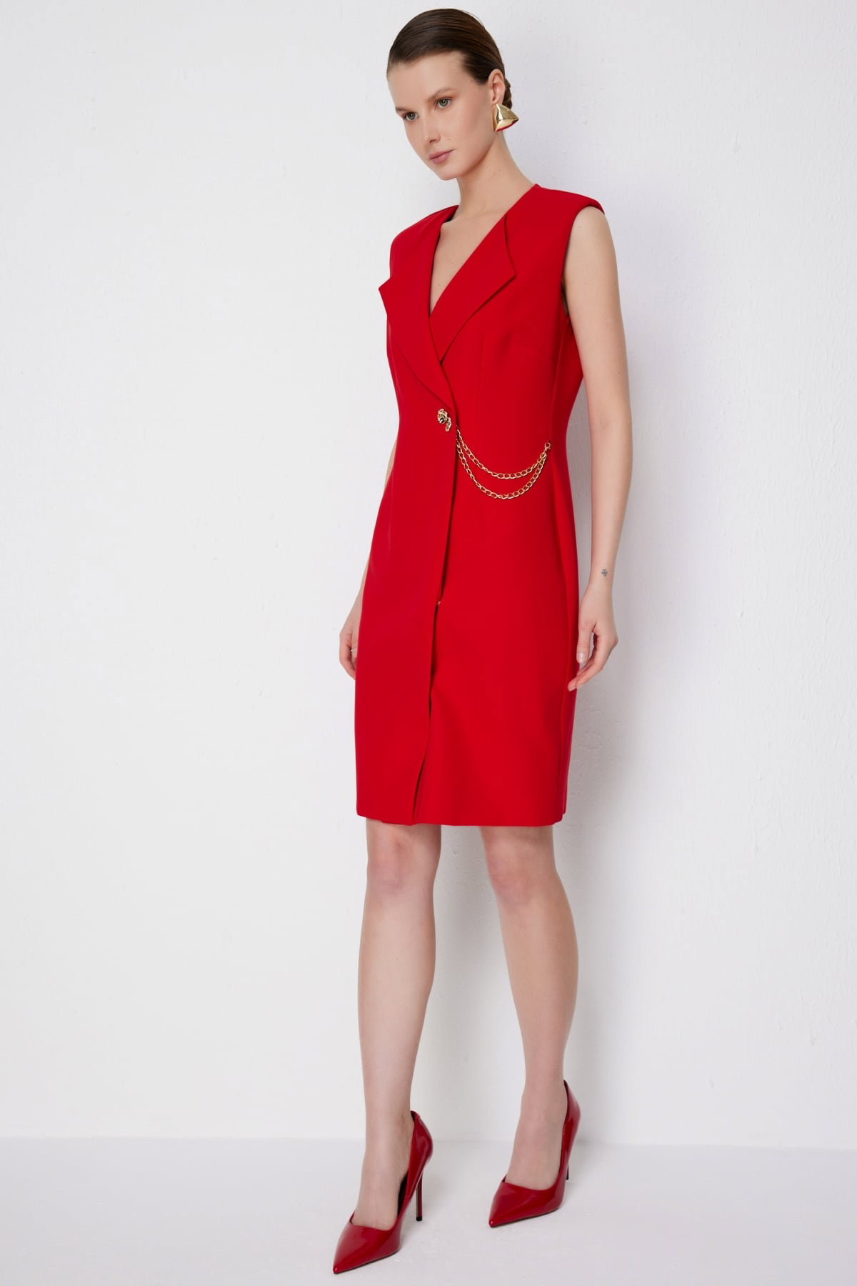 Ekol Kadın Zincir Detaylı Kruvaze Midi Elbise 6044 Kırmızı