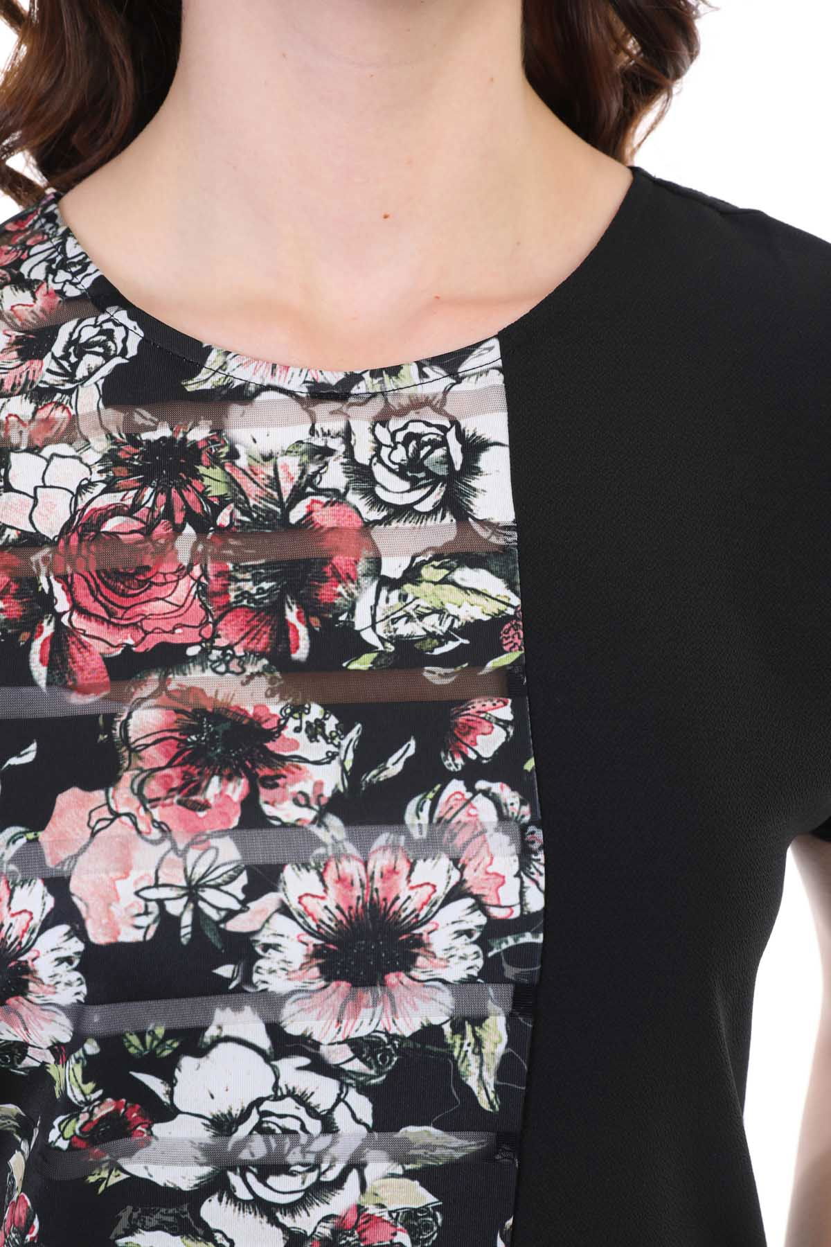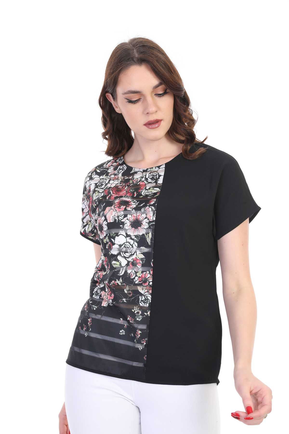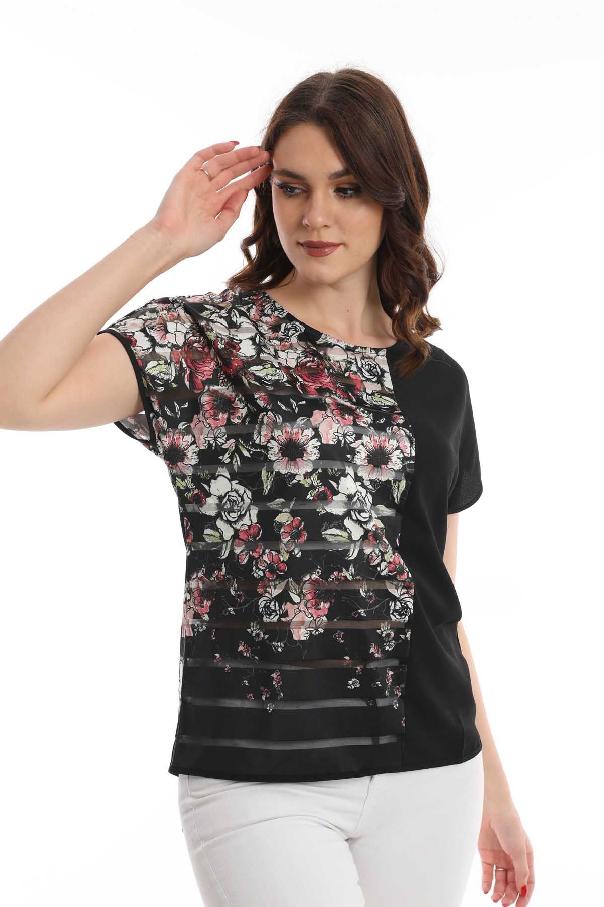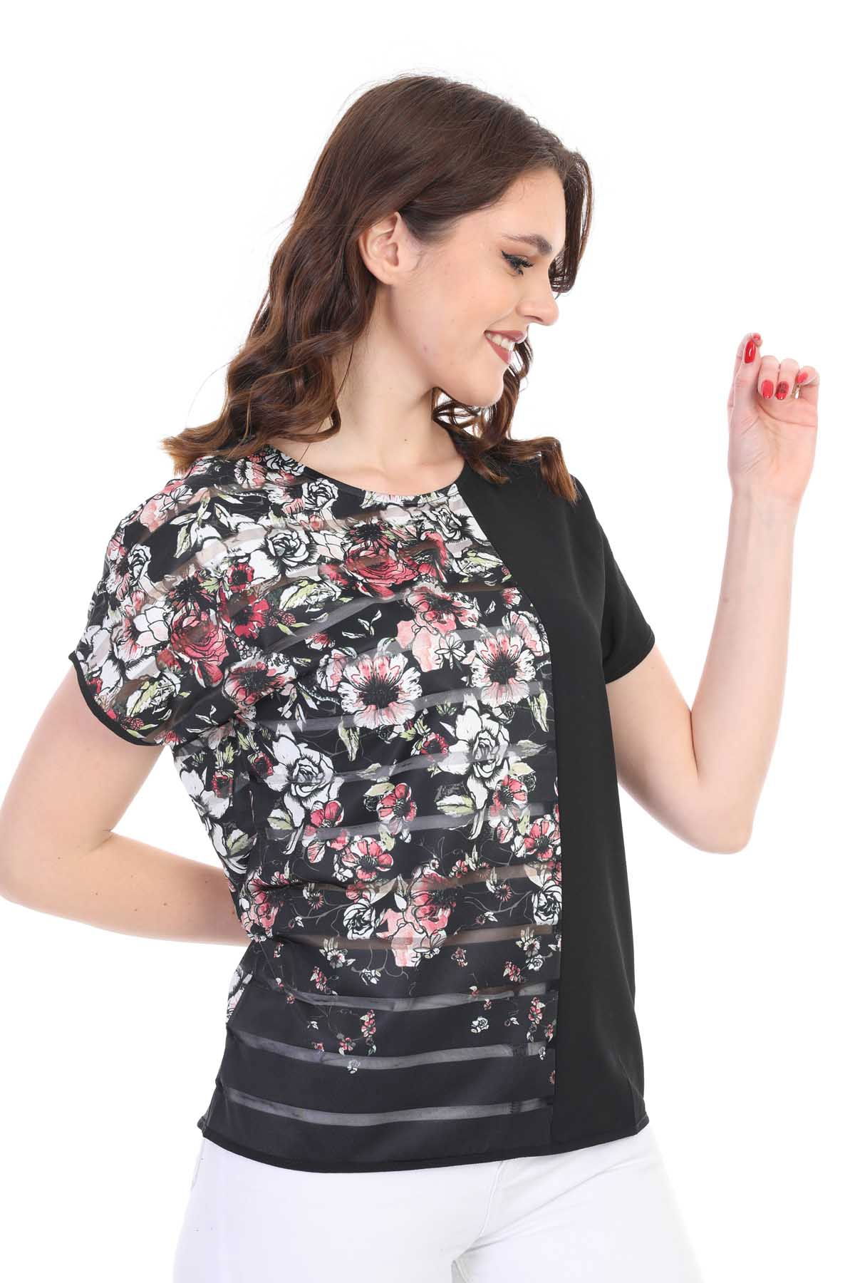 Ella Camelia Kadın Blok Desenli Transparan Detaylı Bluz 19E051 Siyah