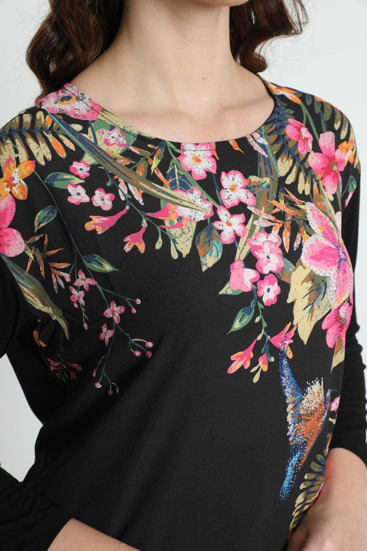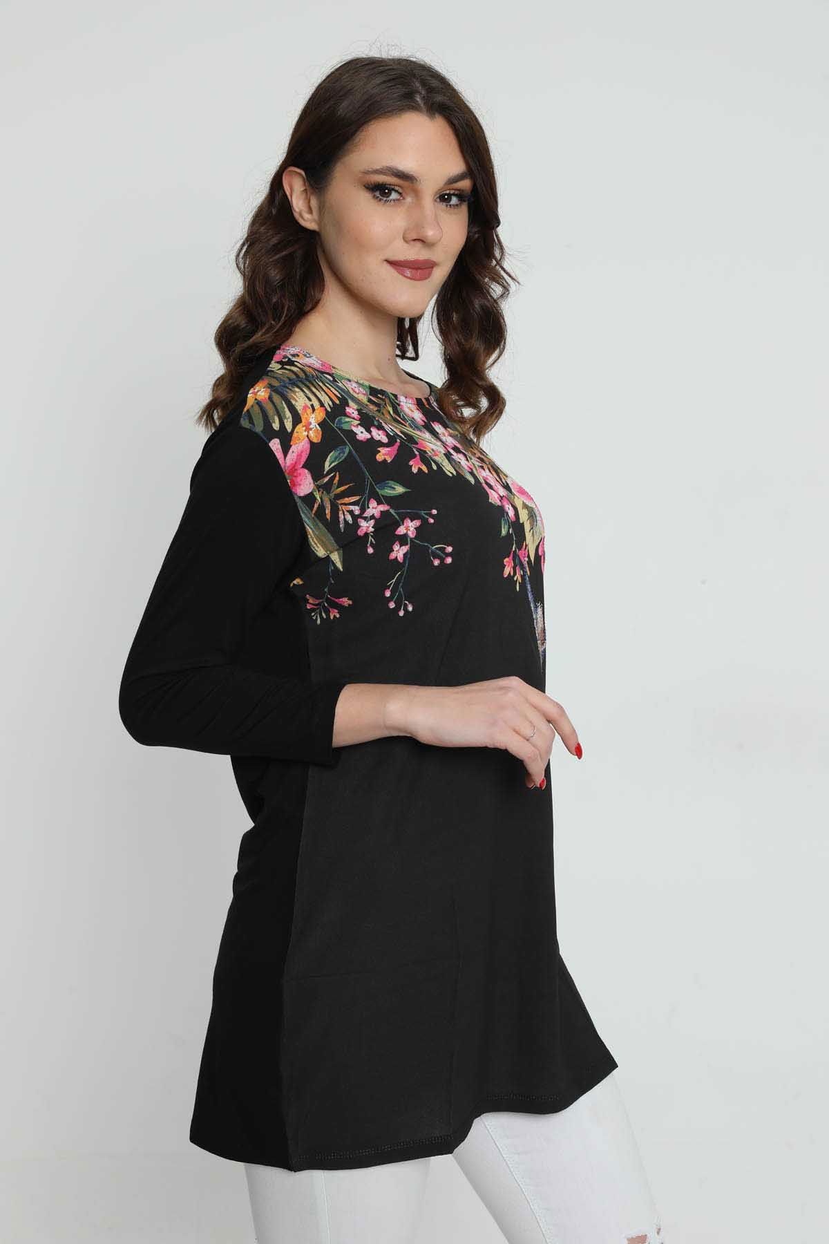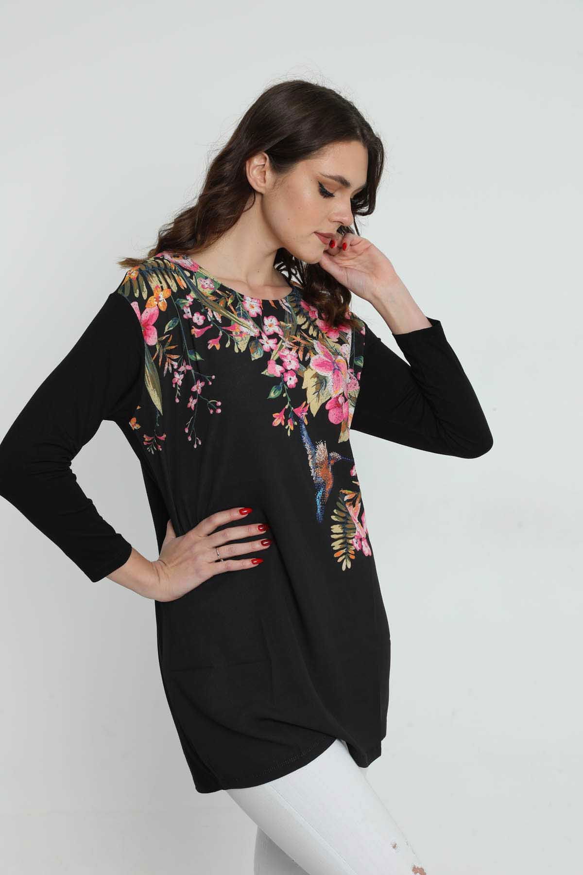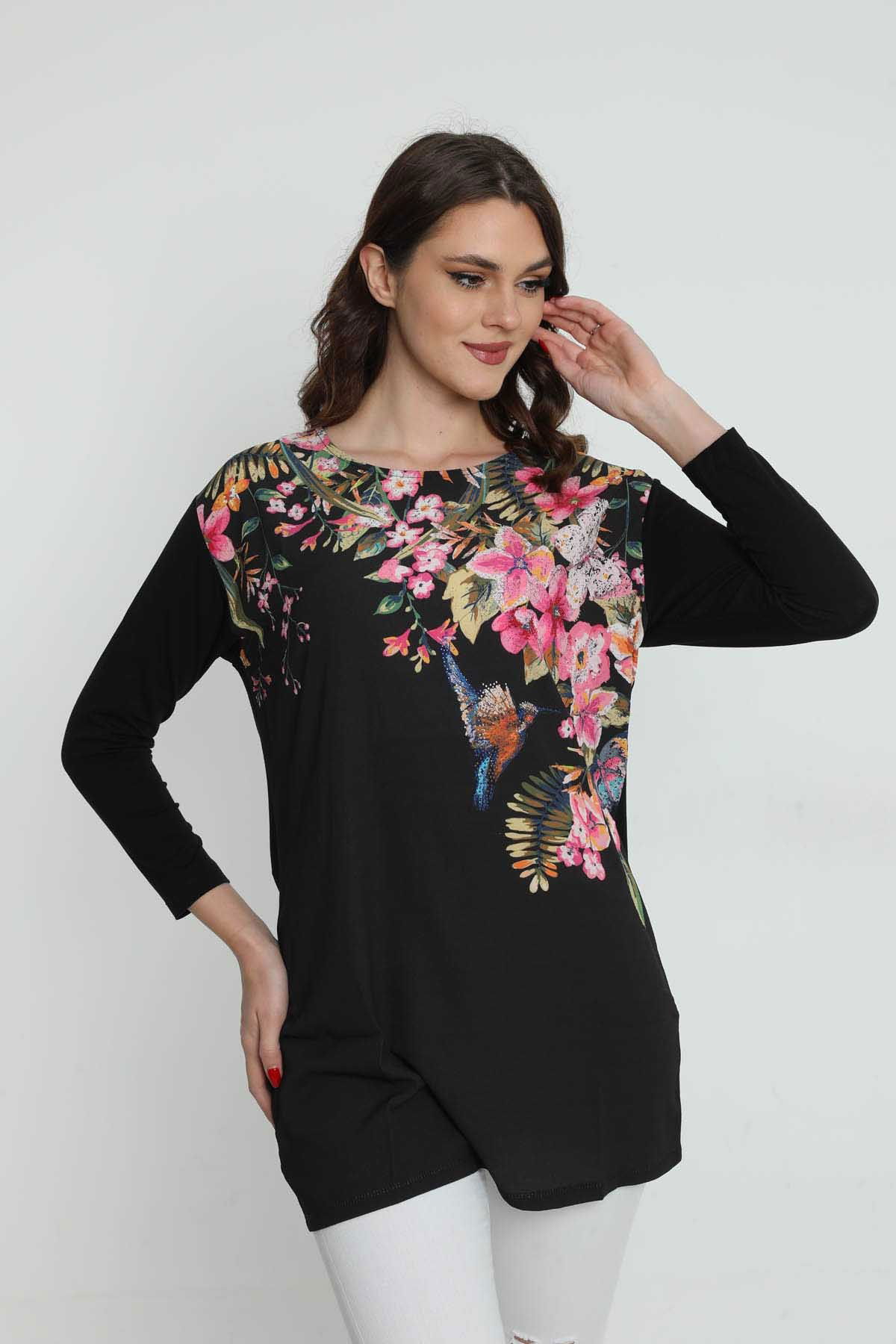 Kalıp Bilgisi: Standart; Detay: Uzun kollu, yuvarlak yaka, çiçek desenli uzun bluz; Model Ölçüleri(cm) / Üzerindeki Ürün: Boy - 179, Göğüs - 89, Bel - 65, Kalça - 98 / 1 (M) Beden
