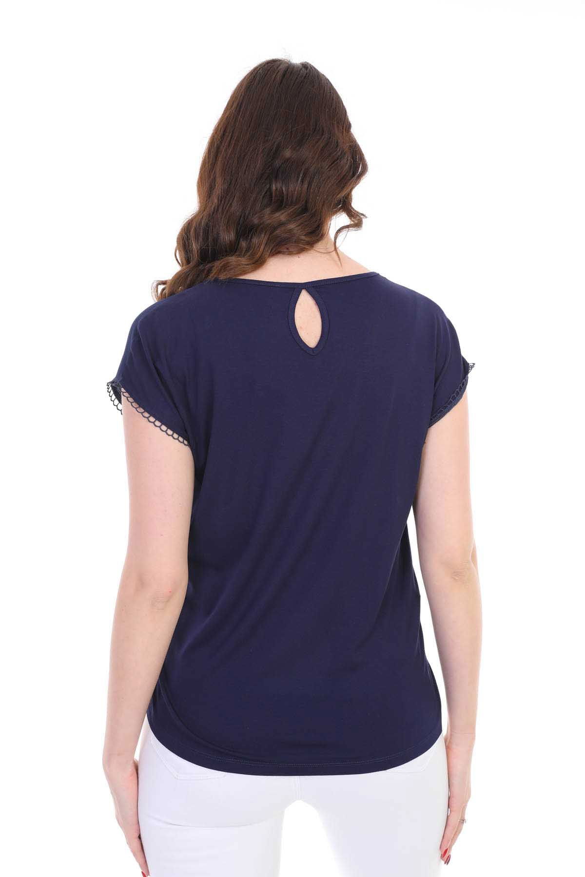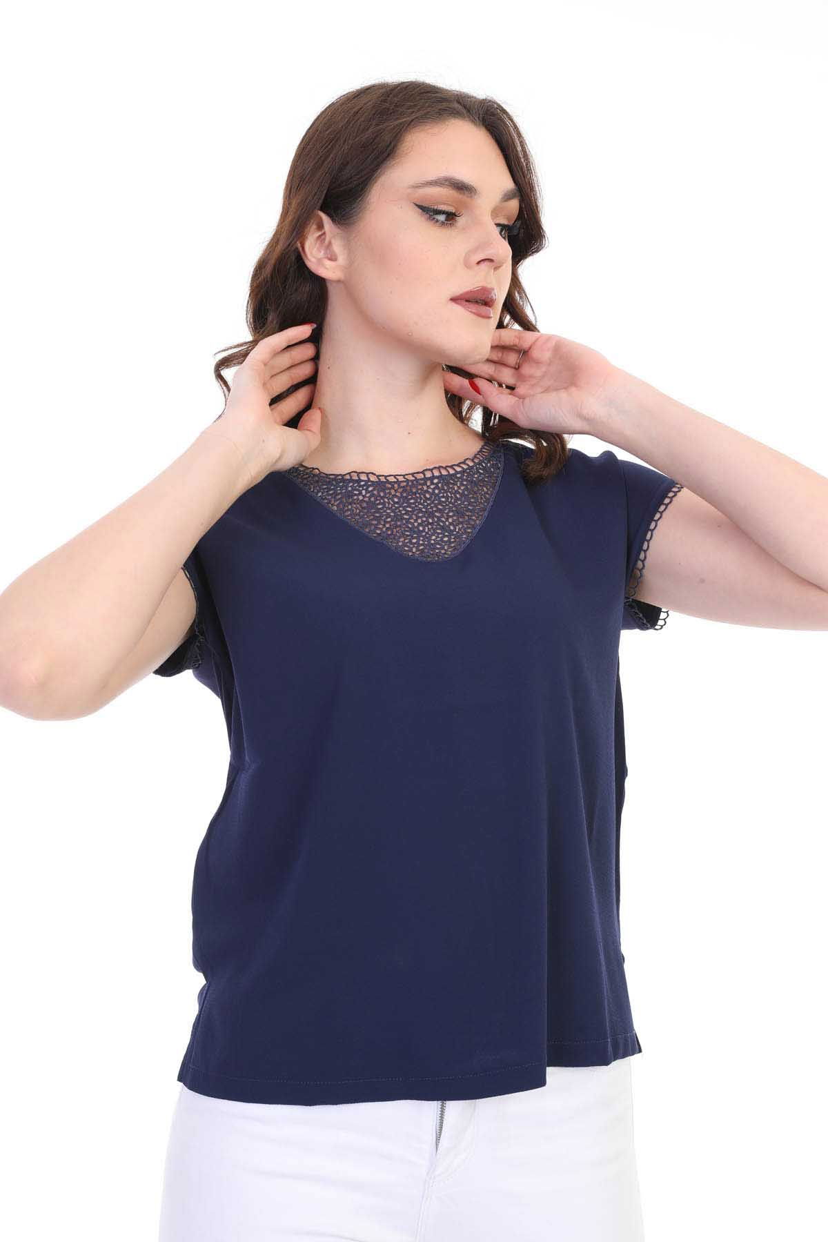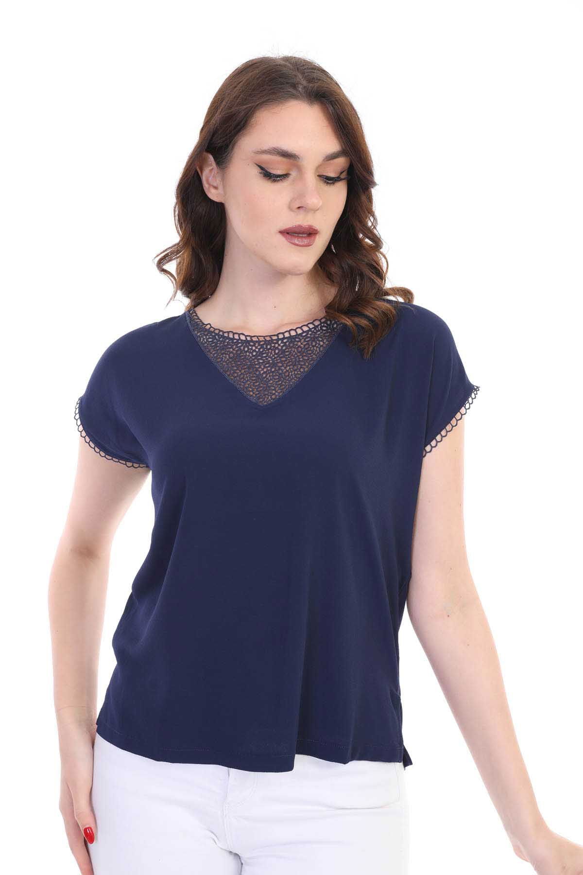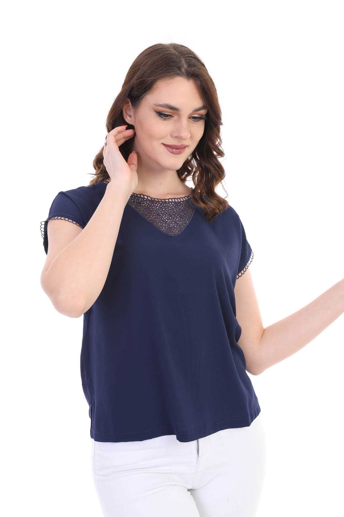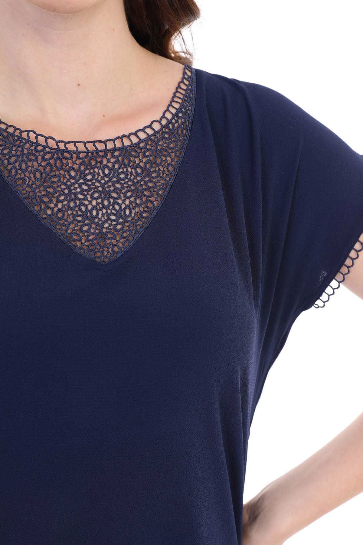 Kalıp Bilgisi: Standart; Detay: Yuvarlak yaka, kısa kollu, dantel detaylı bluz; Model Ölçüleri(cm) / Üzerindeki Ürün: Boy - 179, Göğüs - 89, Bel - 65, Kalça - 98 / 1 (M) Beden