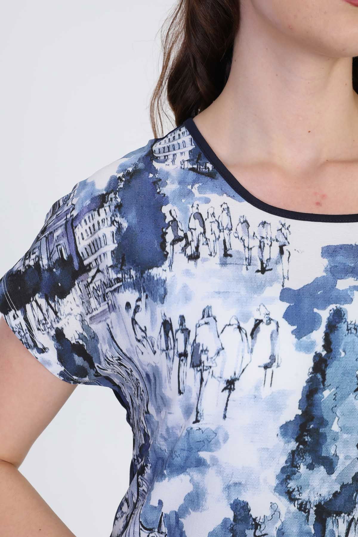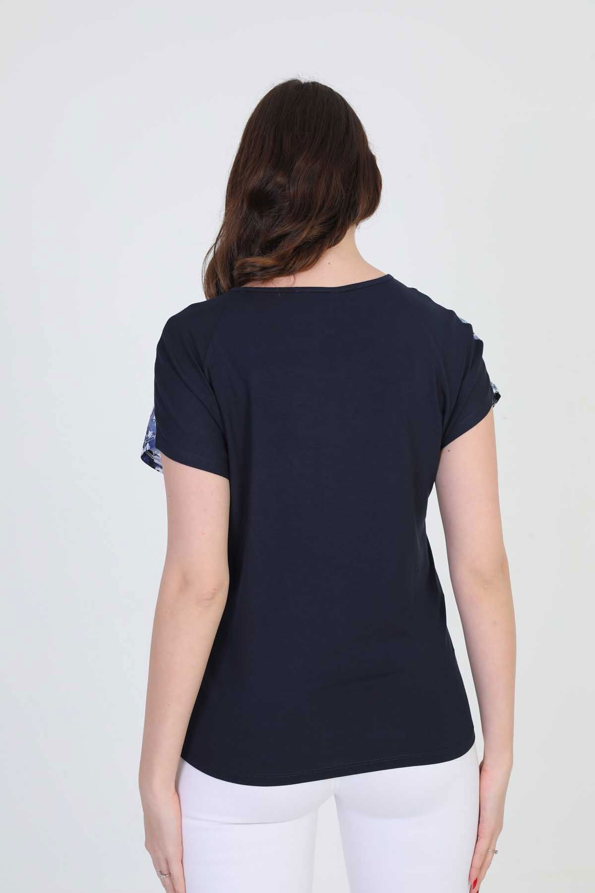 Kalıp Bilgisi: Standart; Detay: Kısa kollu, yuvarlak yaka, desenli bluz; Model Ölçüleri(cm) / Üzerindeki Ürün: Boy - 179, Göğüs - 89, Bel - 65, Kalça - 98 / 1 (M) Beden