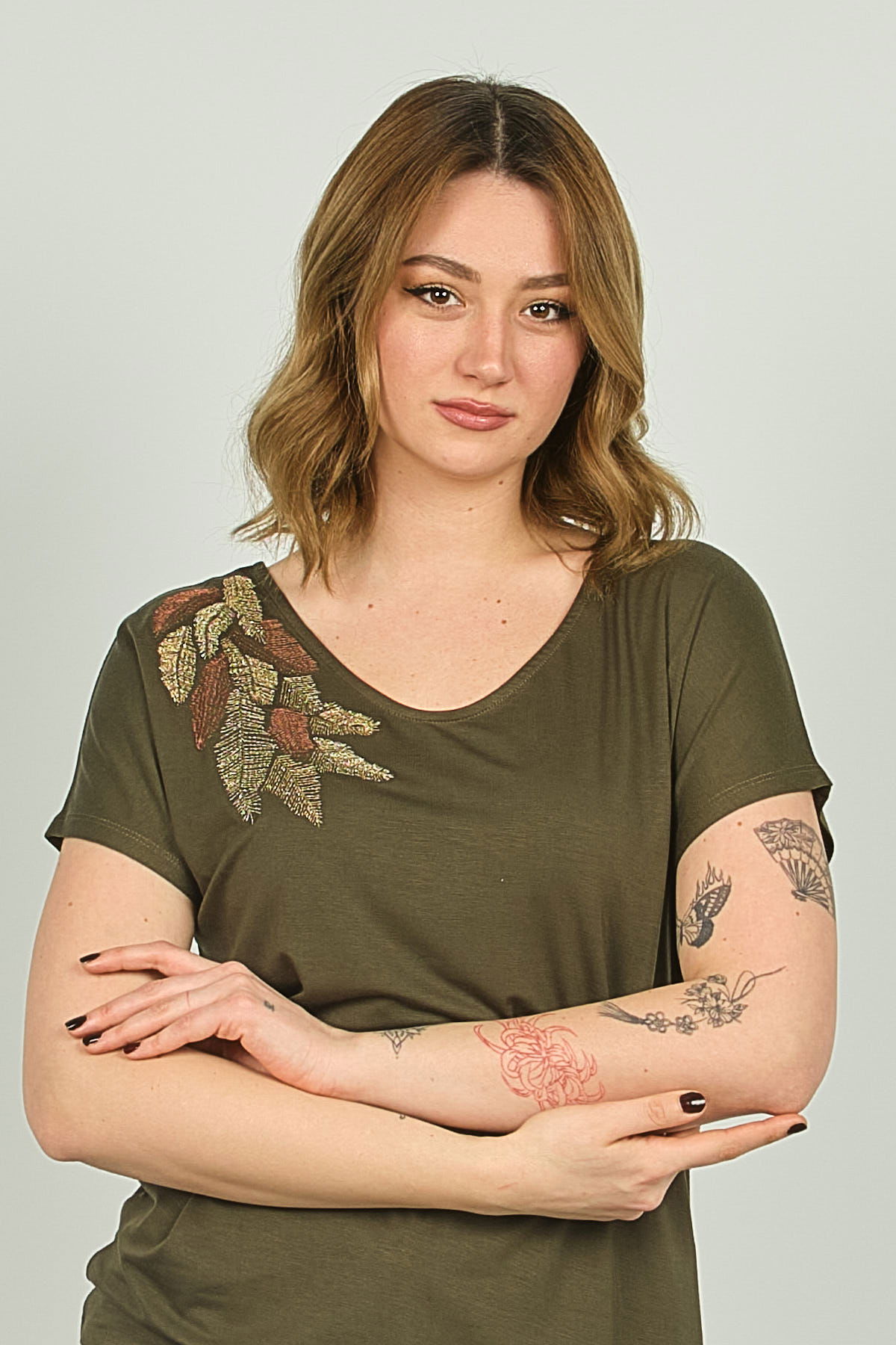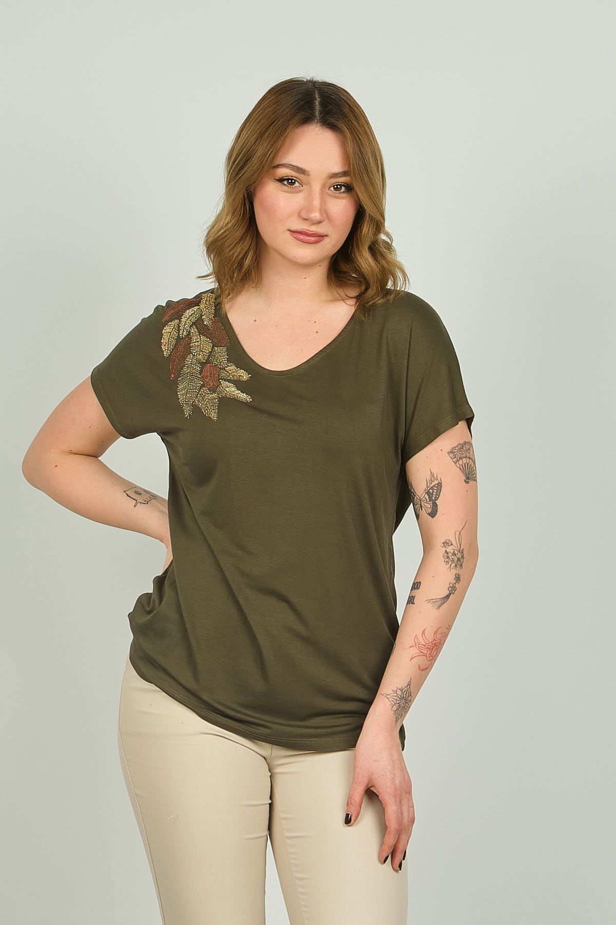 Ella Camelia Kadın Desenli Sırt Detaylı Kısa Kol Bluz 20E065 Haki