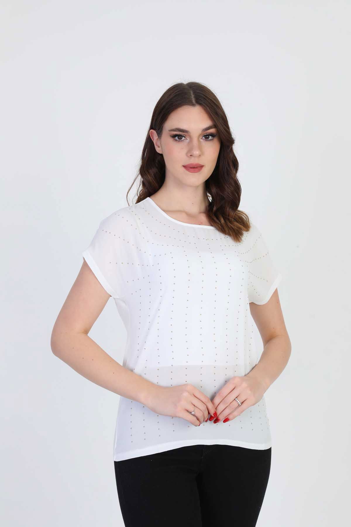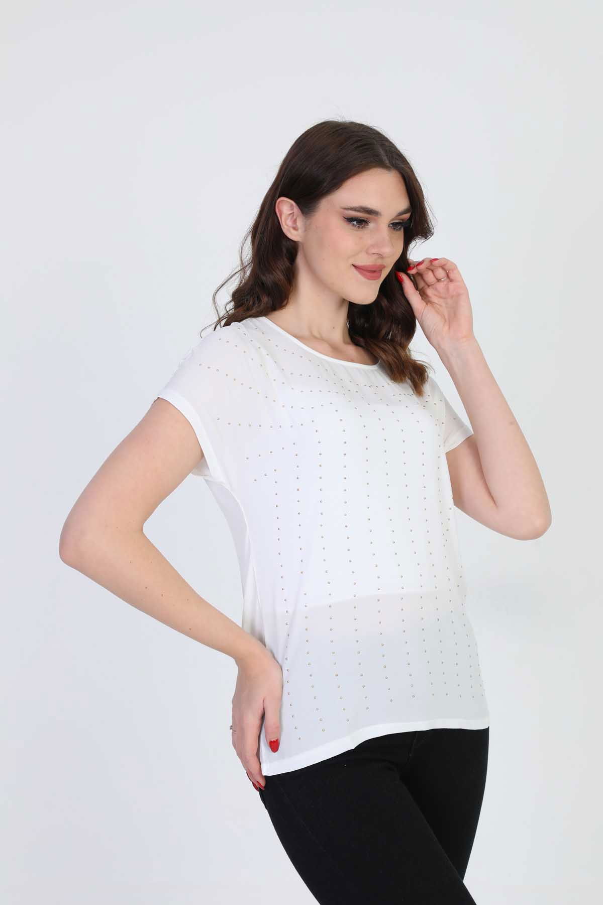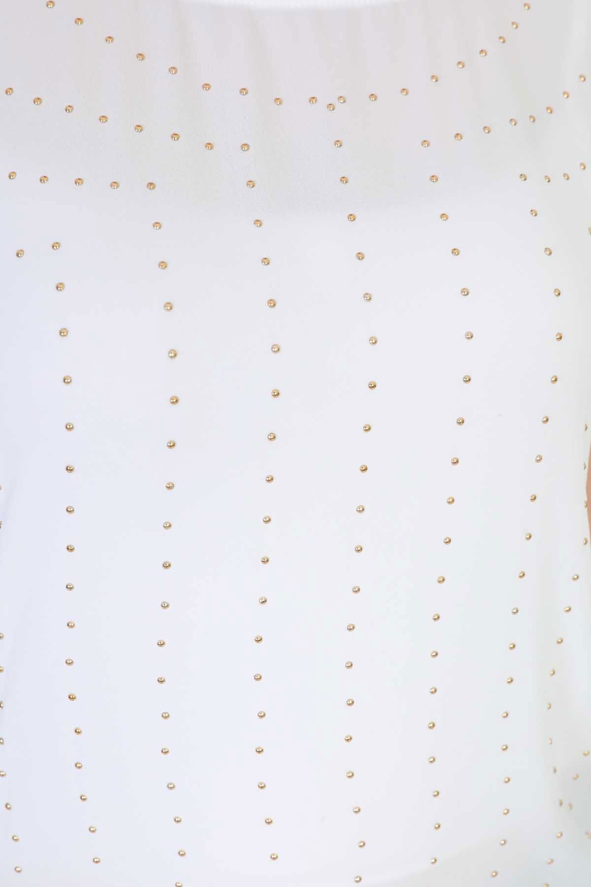 Detay: Boncuk işlemeli, bisiklet yaka bluz;