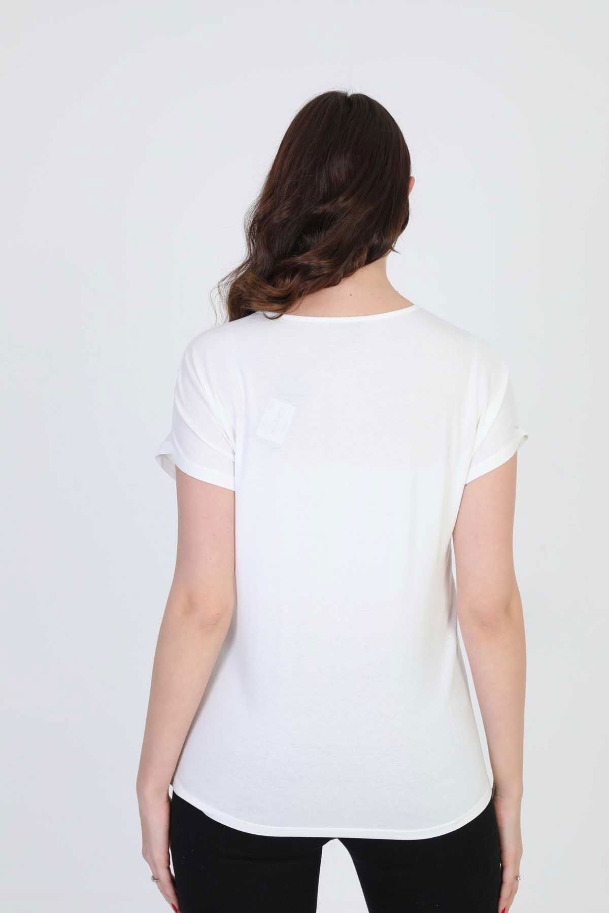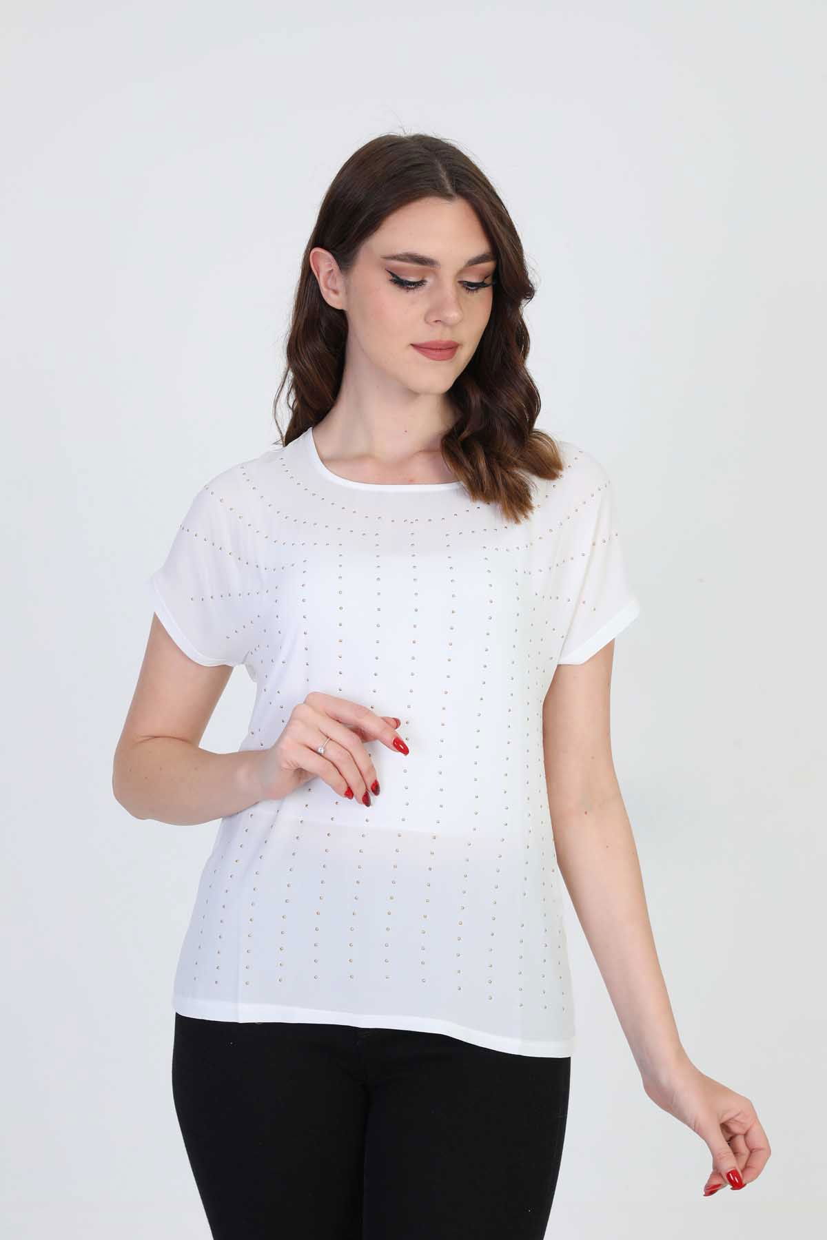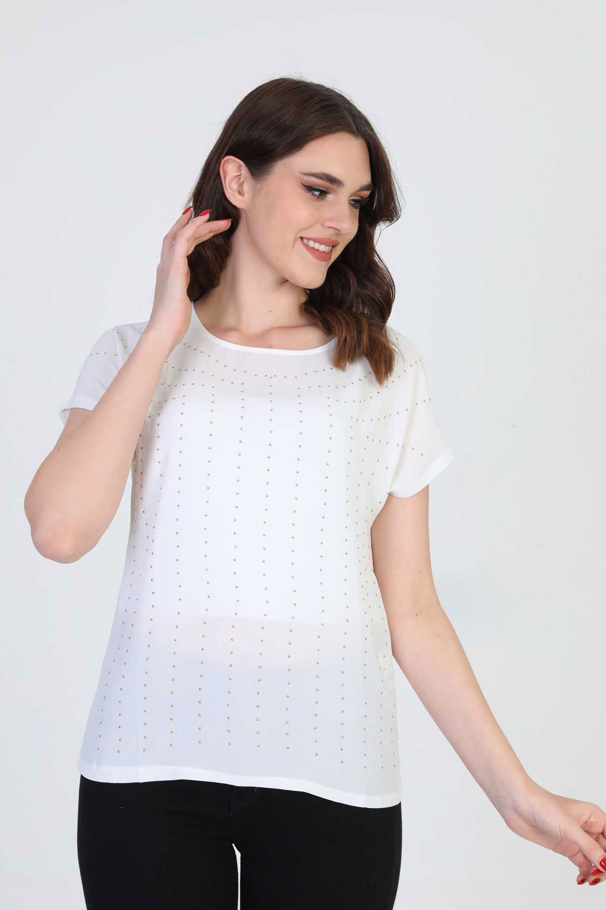 Detay: Boncuk işlemeli, bisiklet yaka bluz;