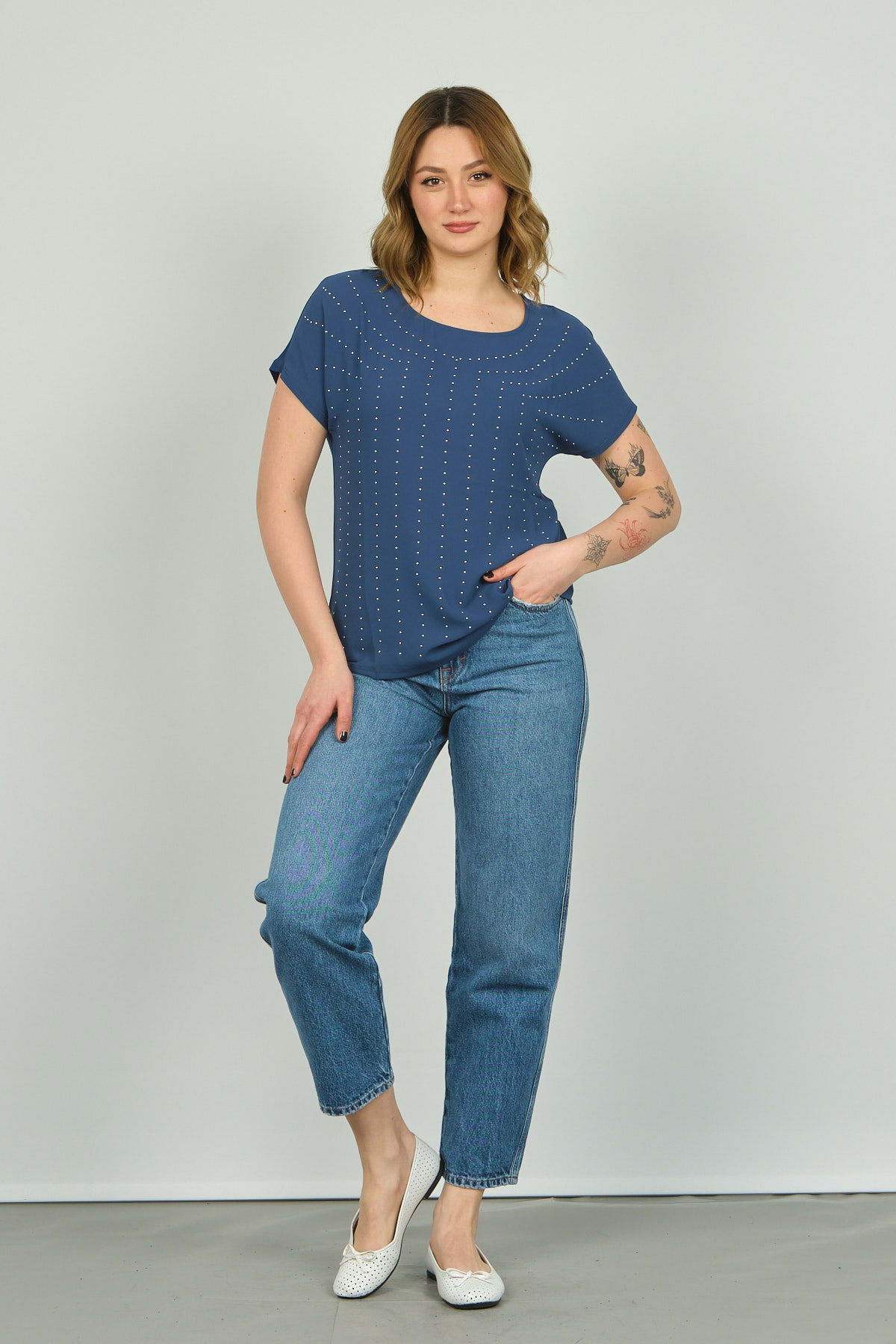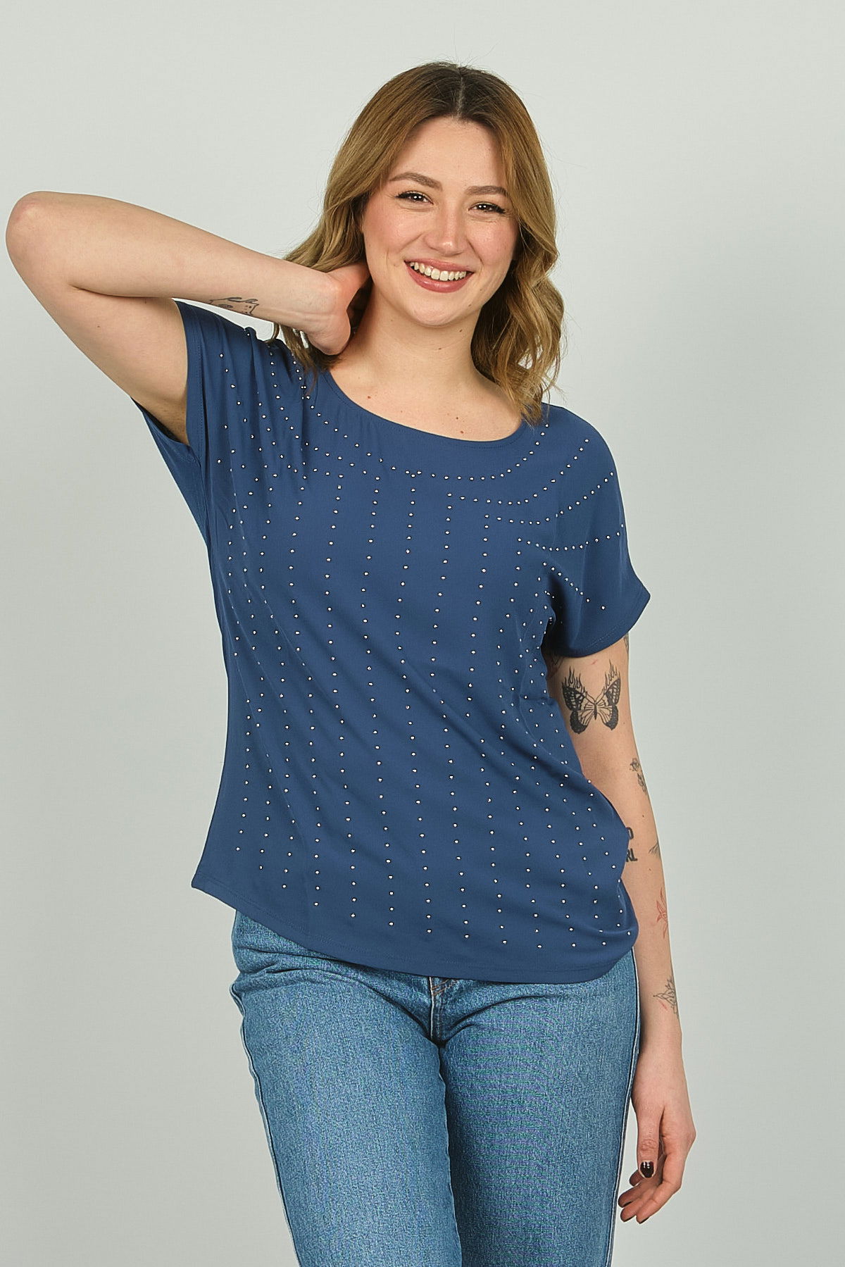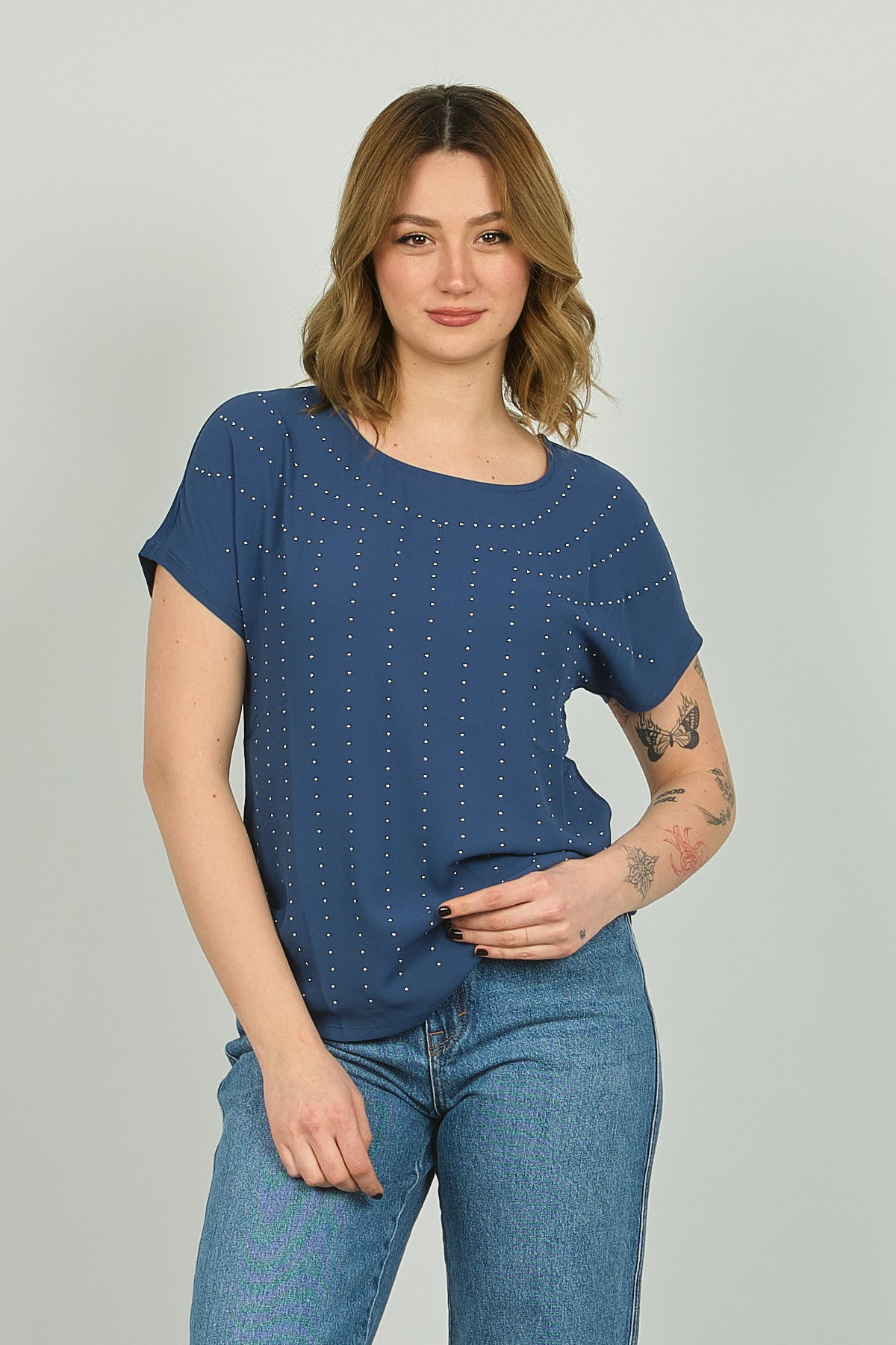 Detay: Boncuk işlemeli, bisiklet yaka bluz;