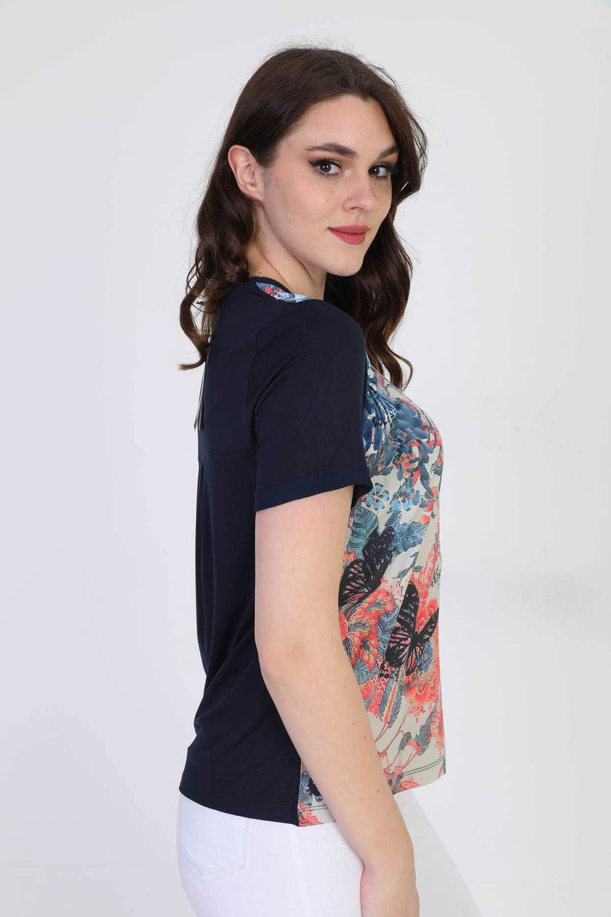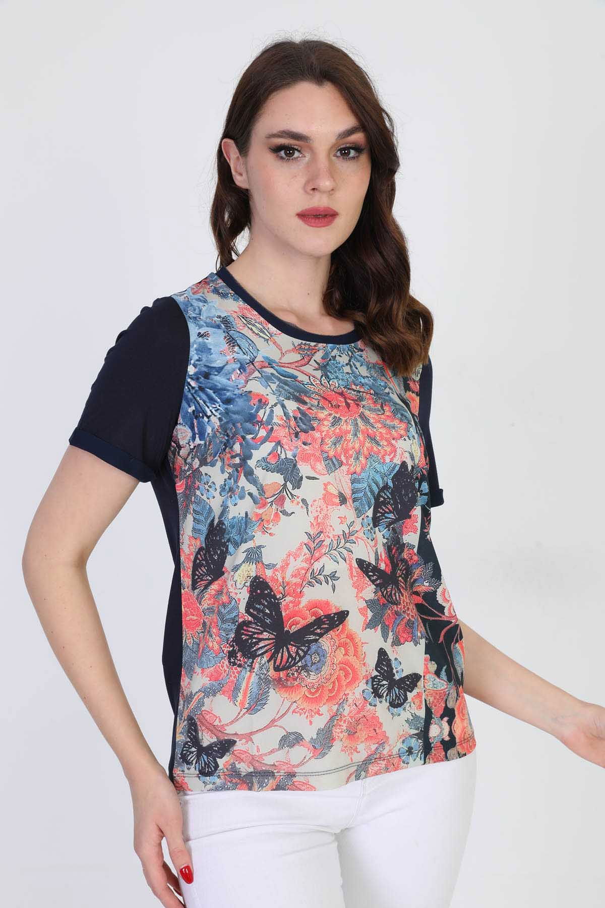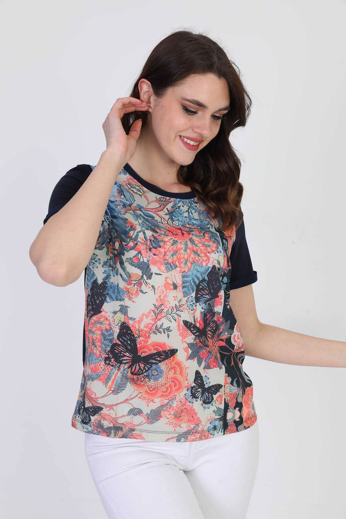 Kalıp Bilgisi: Standart; Detay: Kısa kollu, yuvarlak yaka, kelebek desenli bluz; Model Ölçüleri(cm) / Üzerindeki Ürün: Boy - 179, Göğüs - 89, Bel - 65, Kalça - 98 / 1 (M) Beden