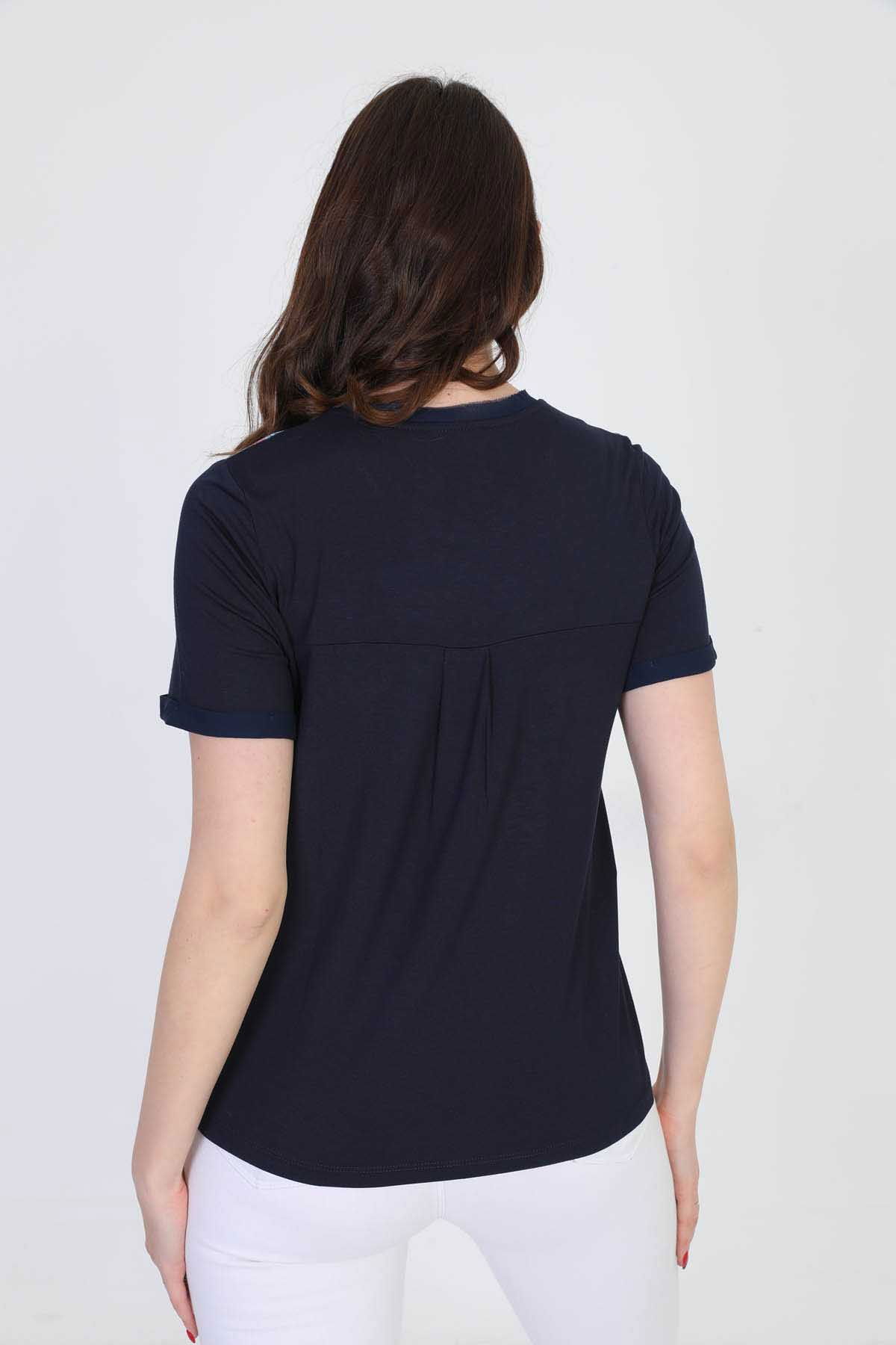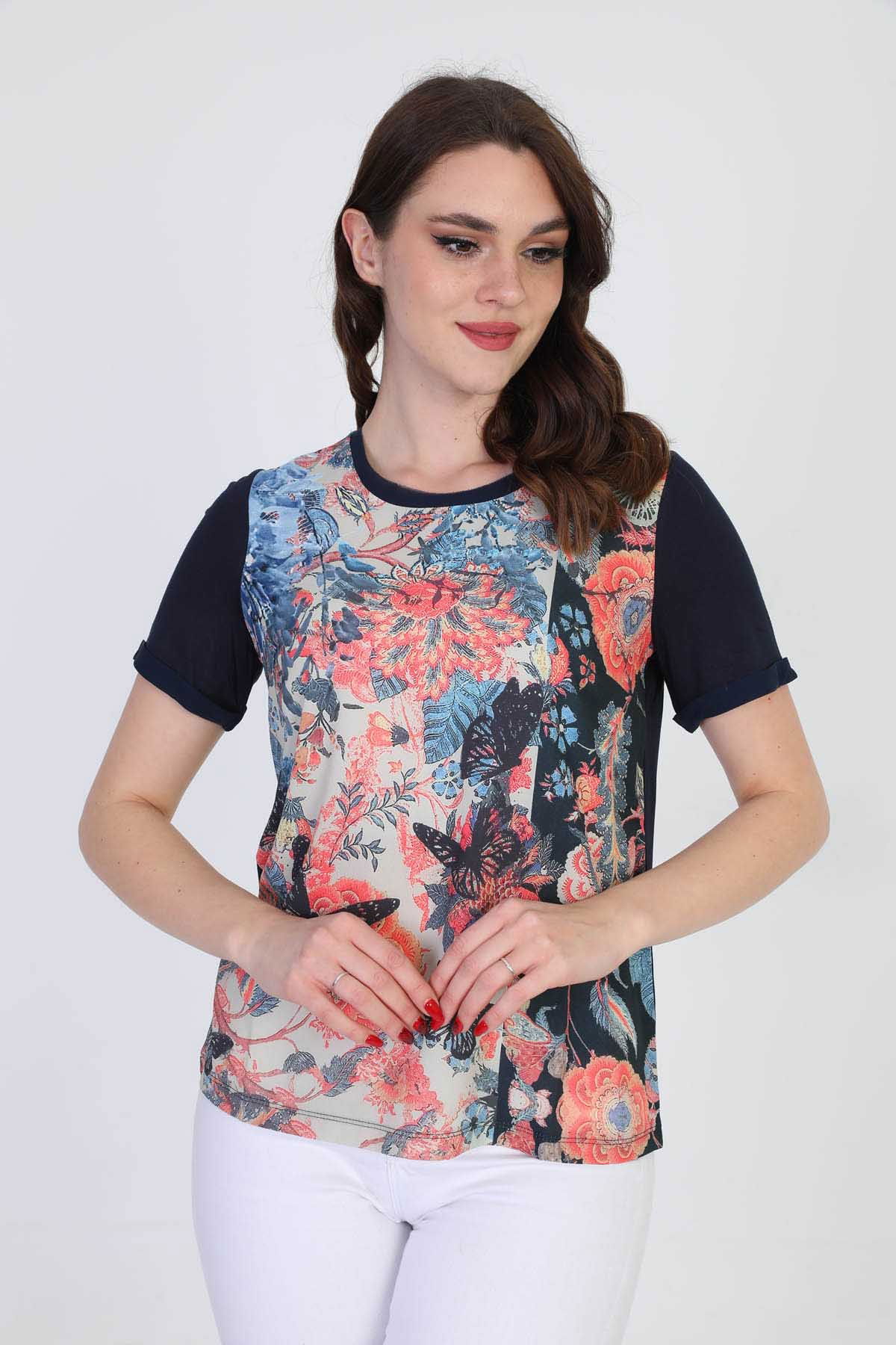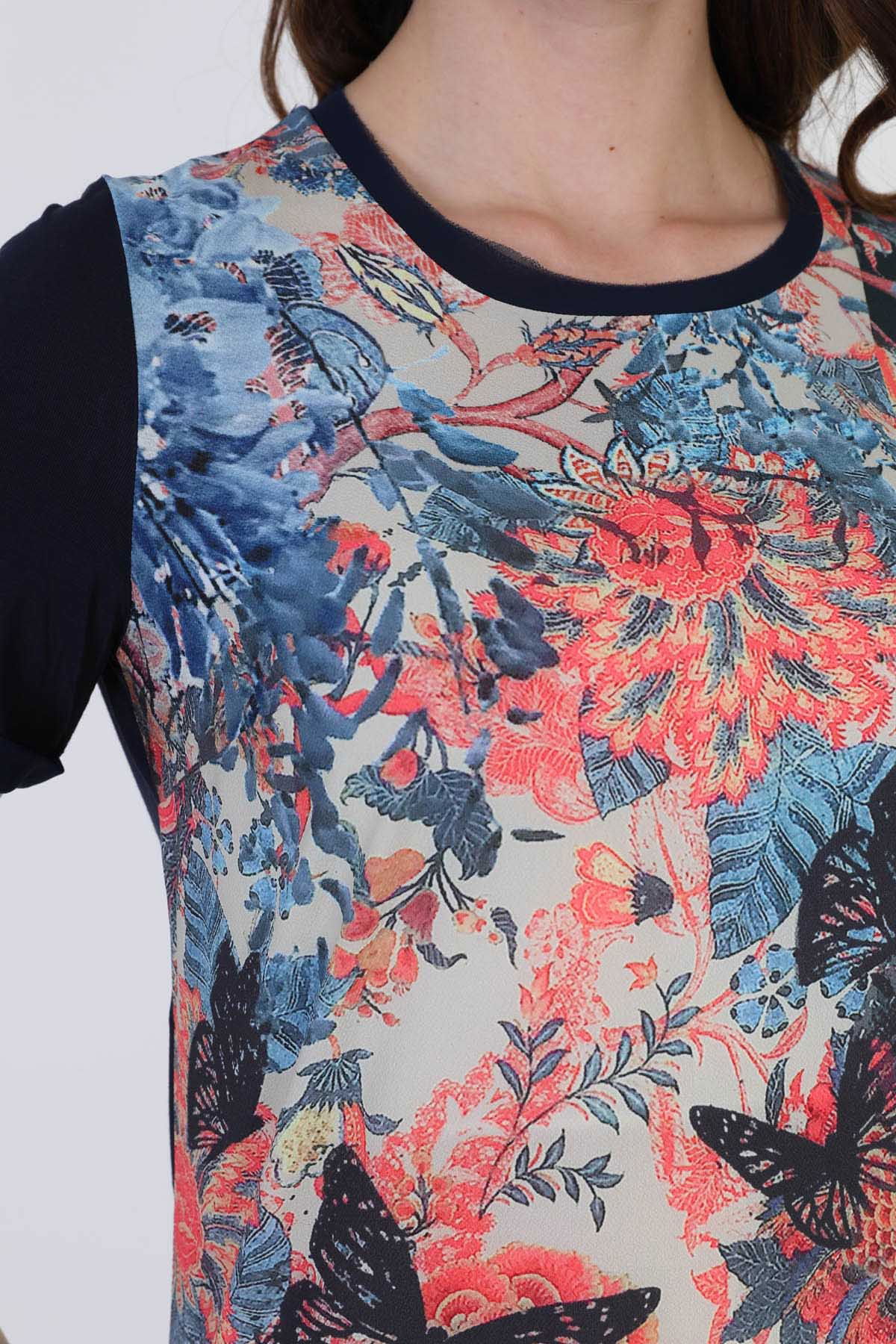 Kalıp Bilgisi: Standart; Detay: Kısa kollu, yuvarlak yaka, kelebek desenli bluz; Model Ölçüleri(cm) / Üzerindeki Ürün: Boy - 179, Göğüs - 89, Bel - 65, Kalça - 98 / 1 (M) Beden