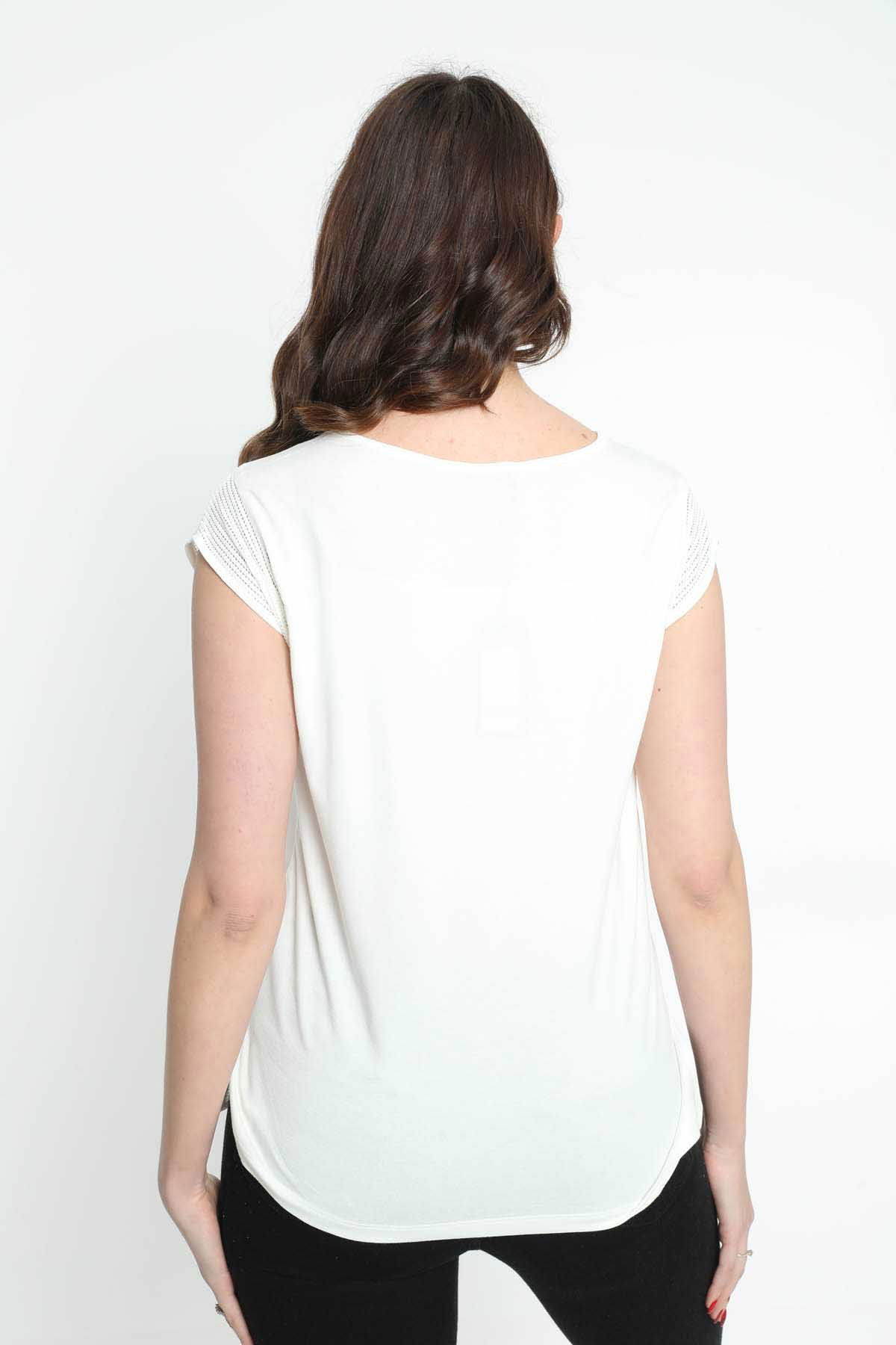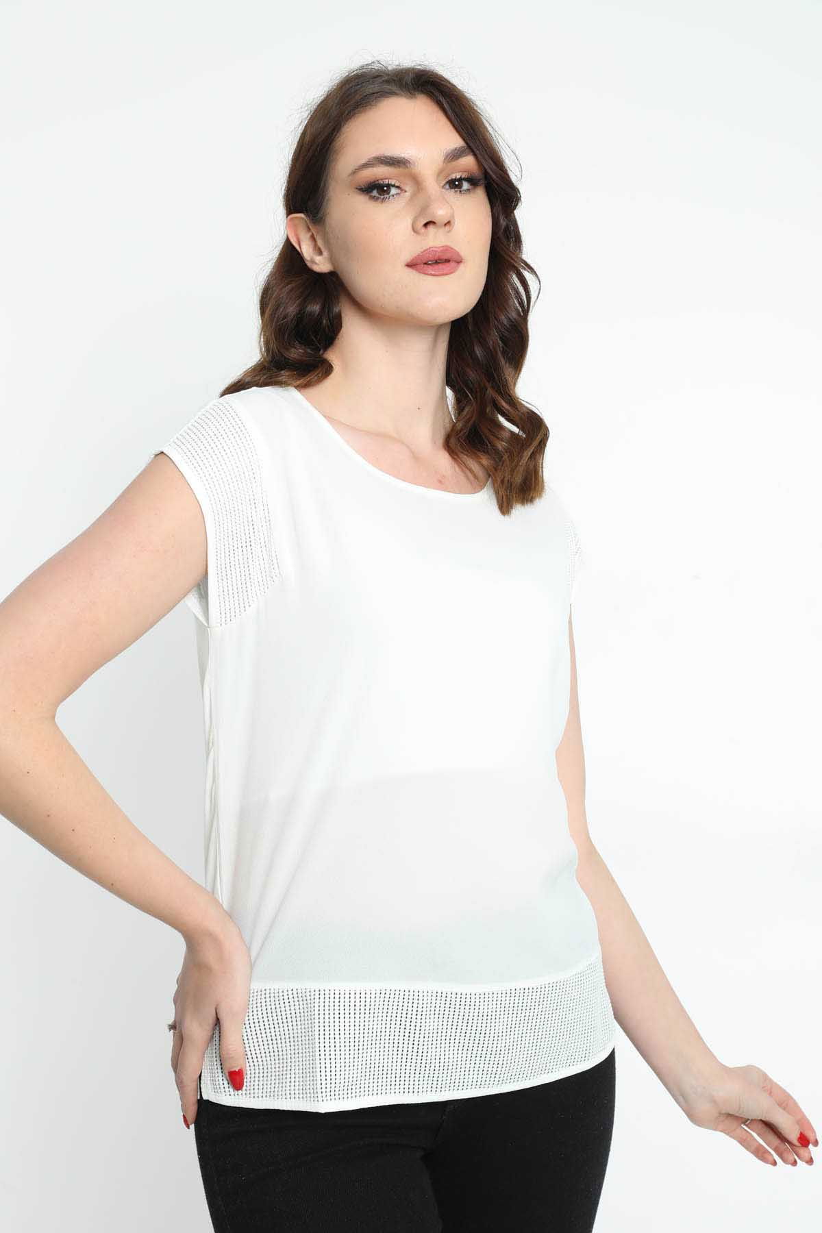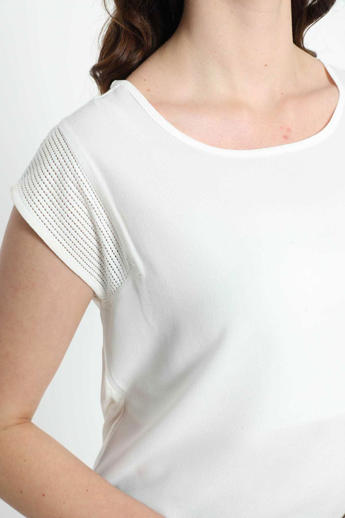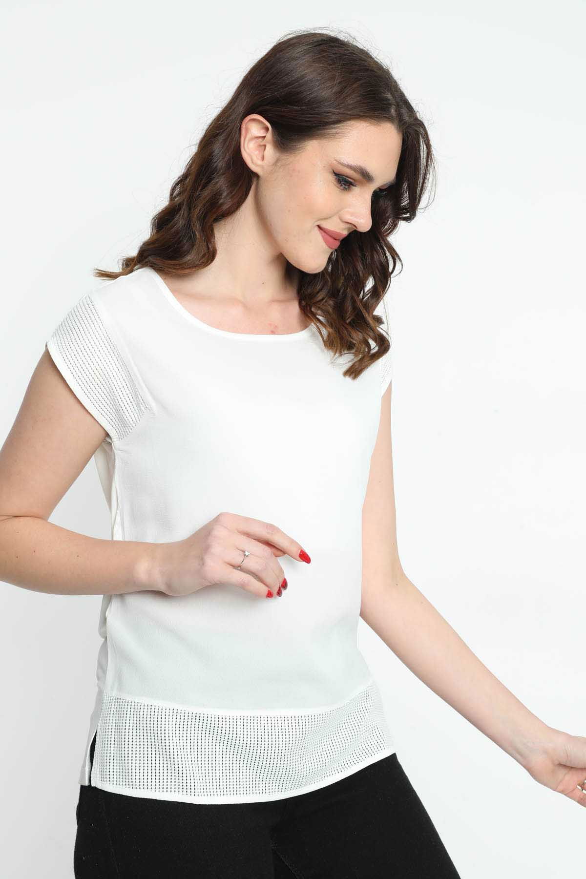 Kalıp Bilgisi: Standart; Detay: Kısa kollu, yuvarlak yaka, omuz ve etek ucu detaylı bluz; Model Ölçüleri(cm) / Üzerindeki Ürün: Boy - 179, Göğüs - 89, Bel - 65, Kalça - 98 / 1 (M) Beden