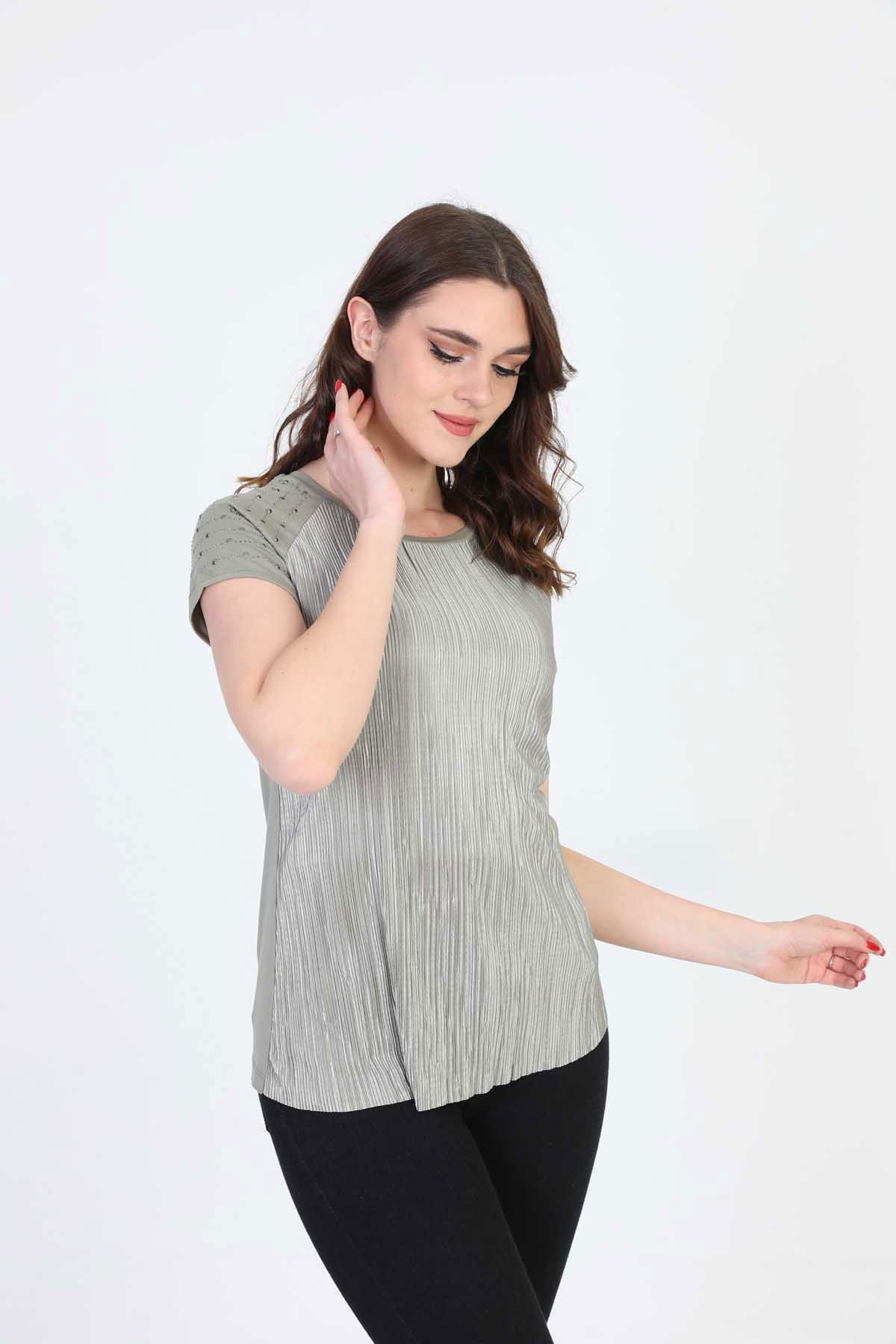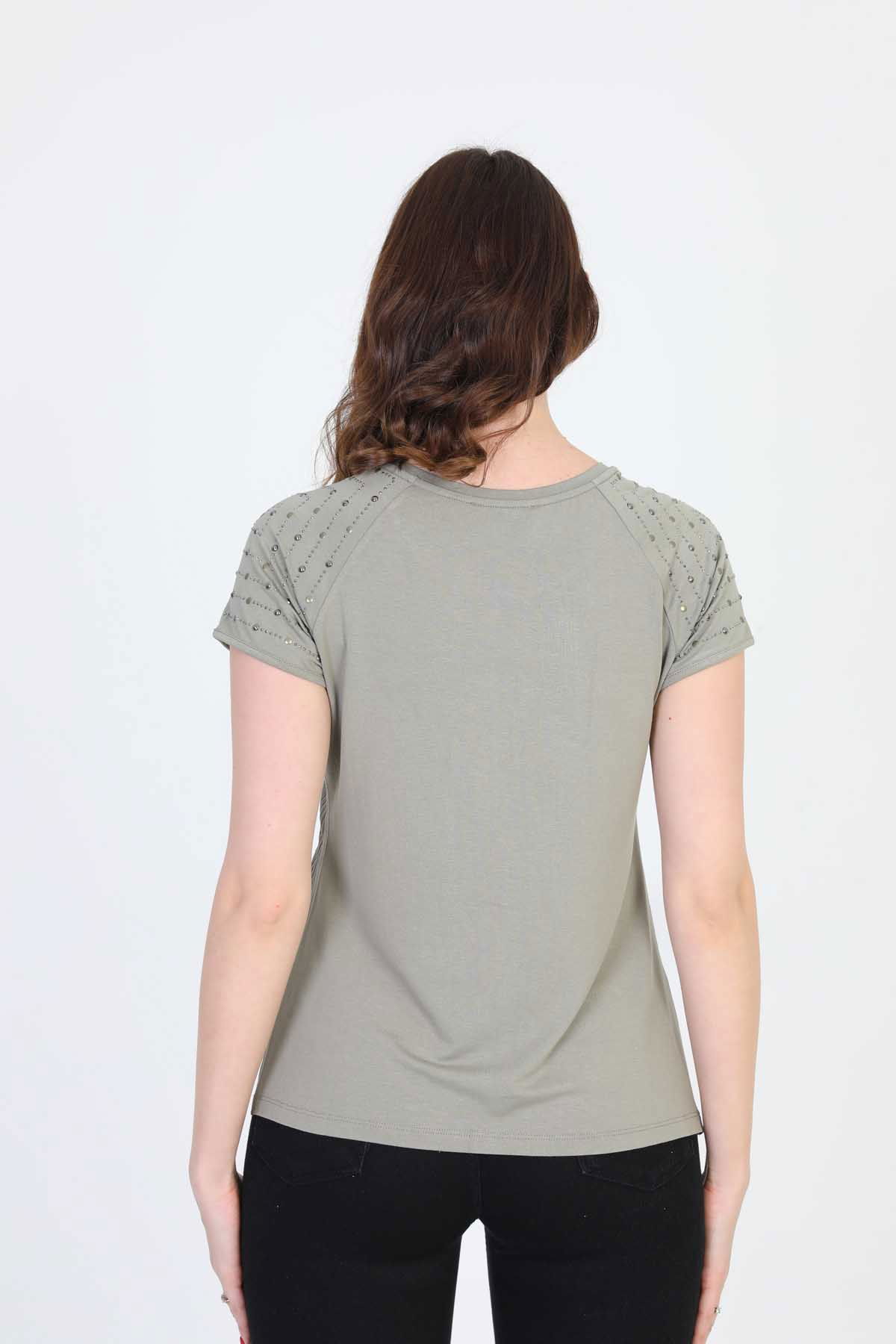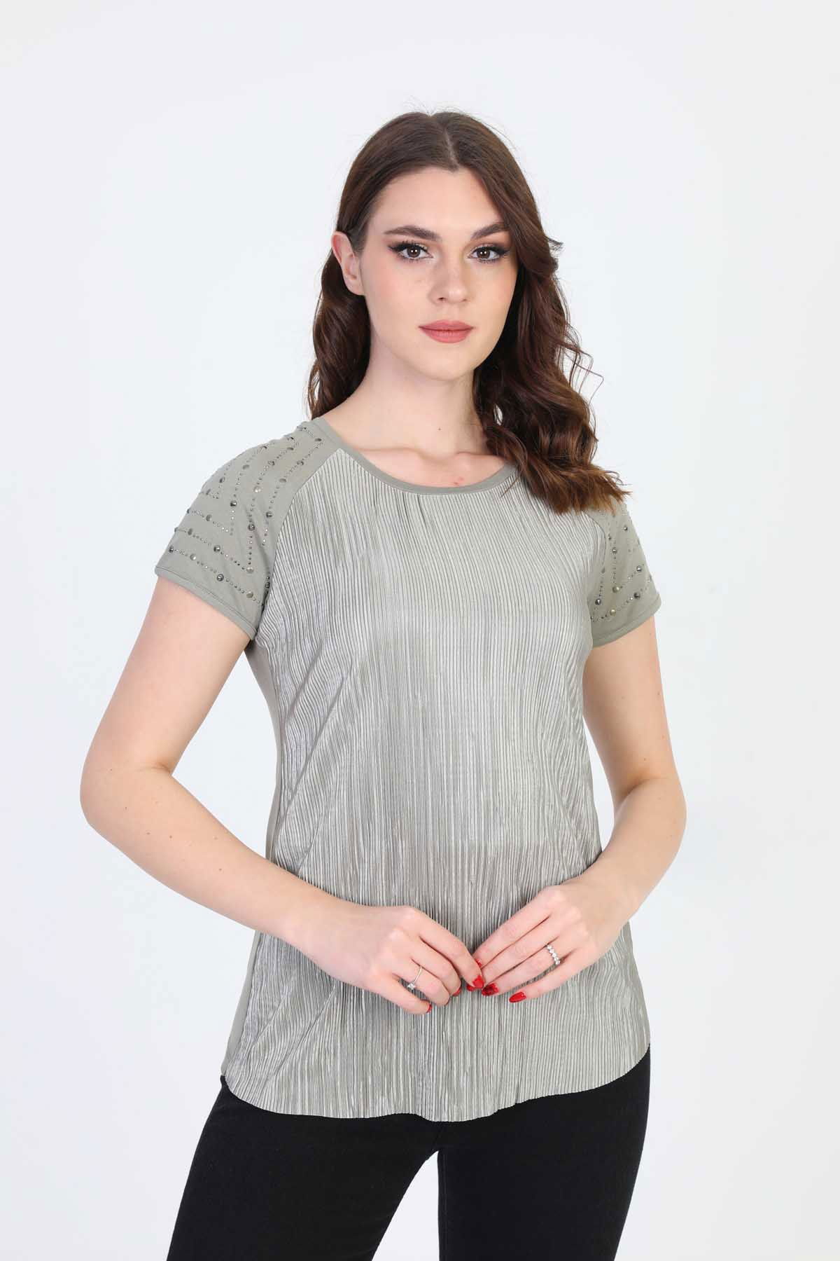 Ella Camelia Kadın Omzu Taş Detaylı Desenli Bluz 18E013 Haki
