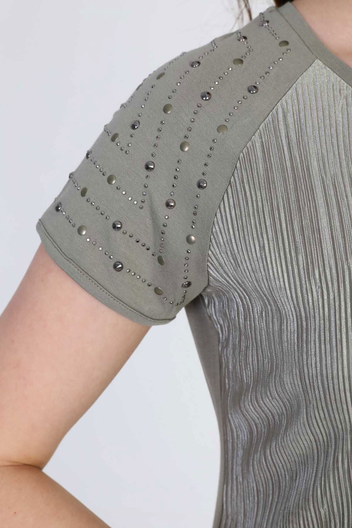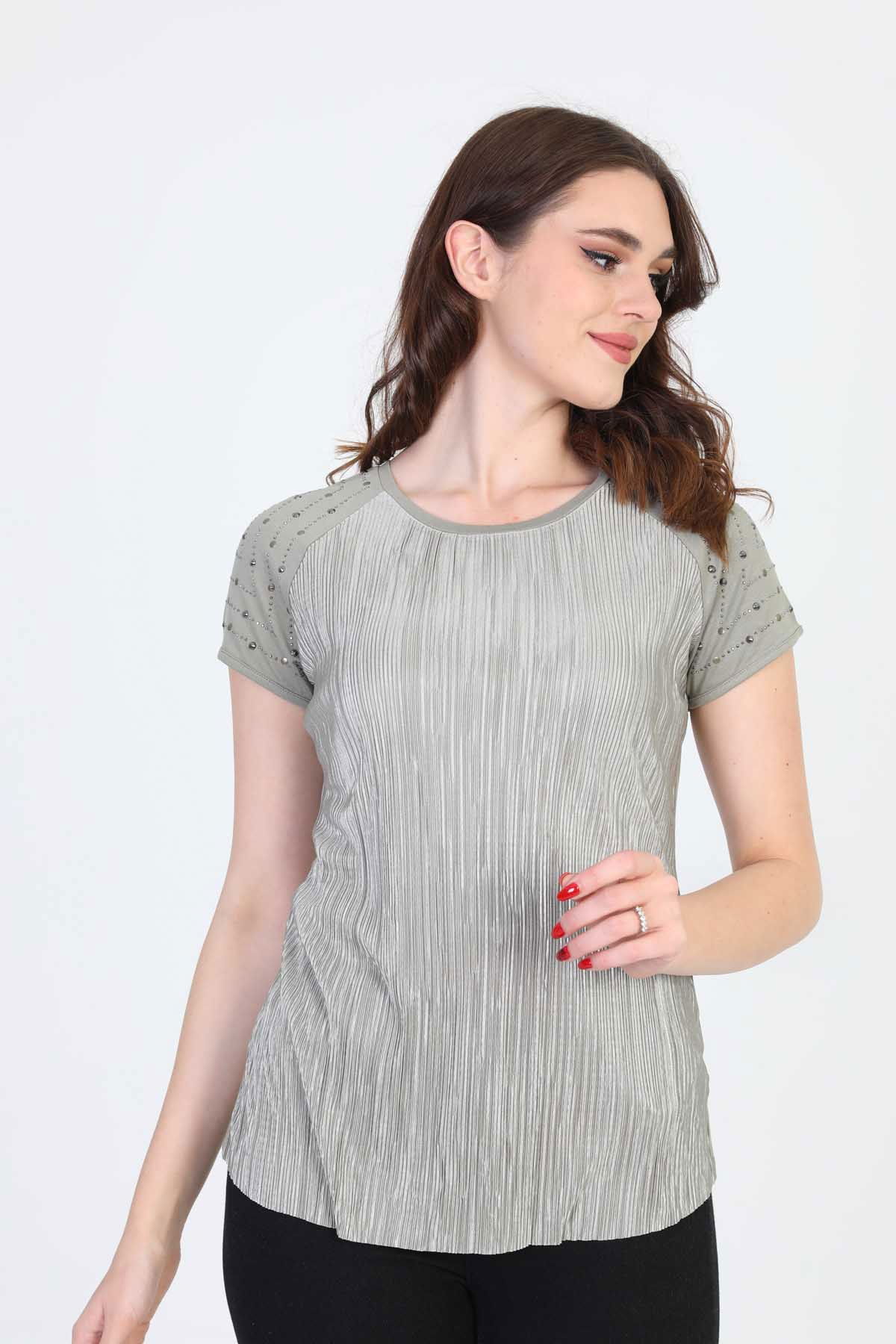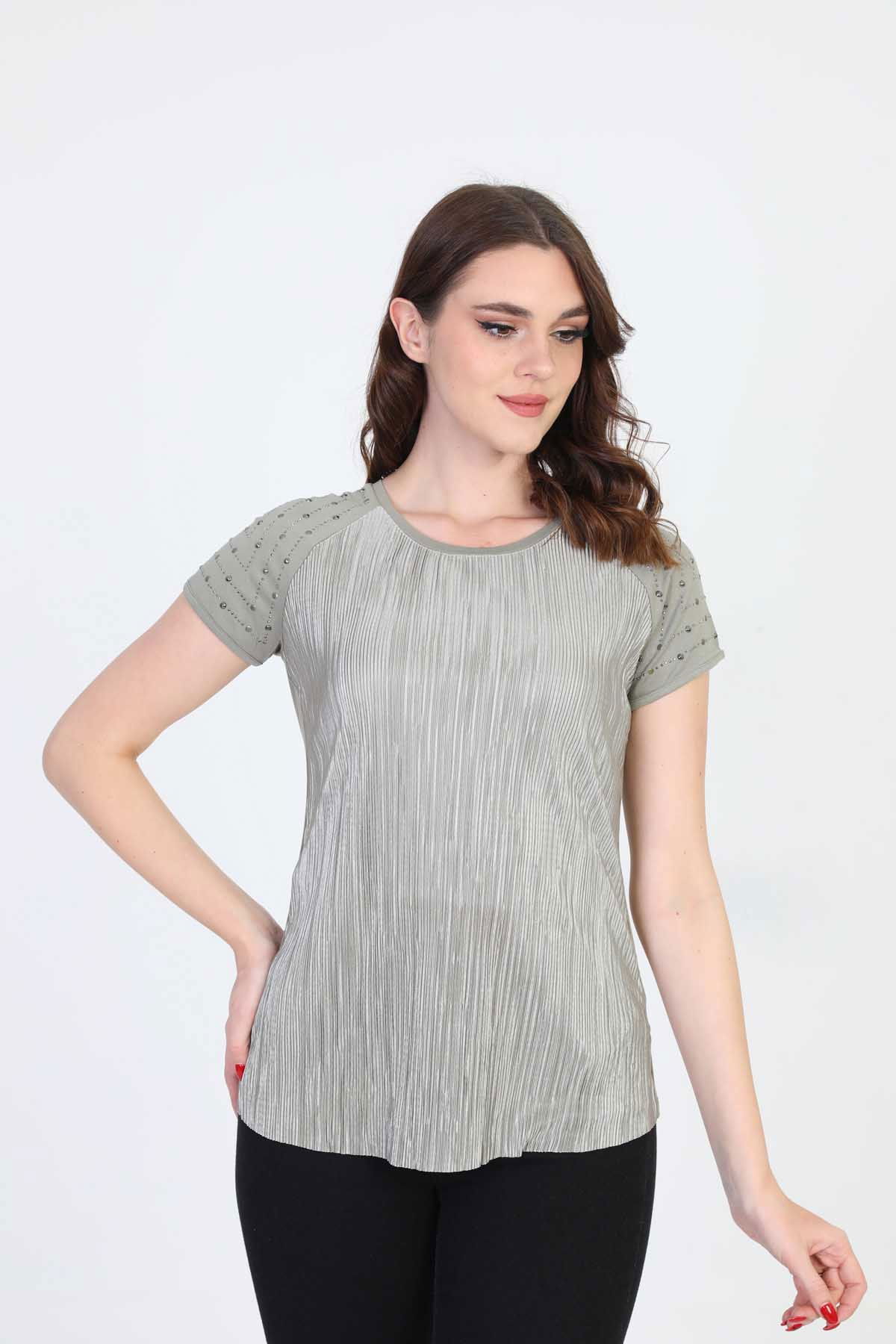 Ella Camelia Kadın Omzu Taş Detaylı Desenli Bluz 18E013 Haki