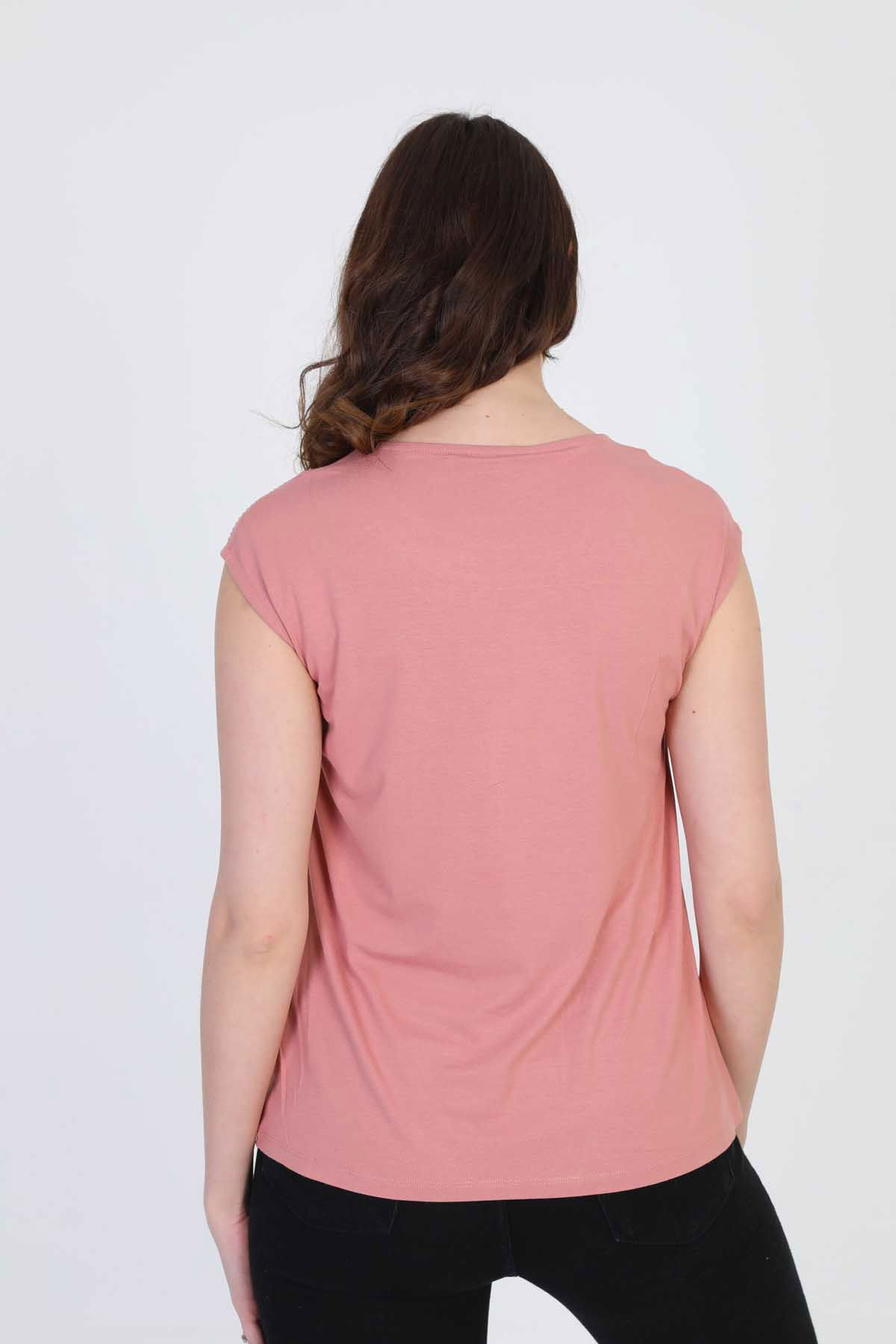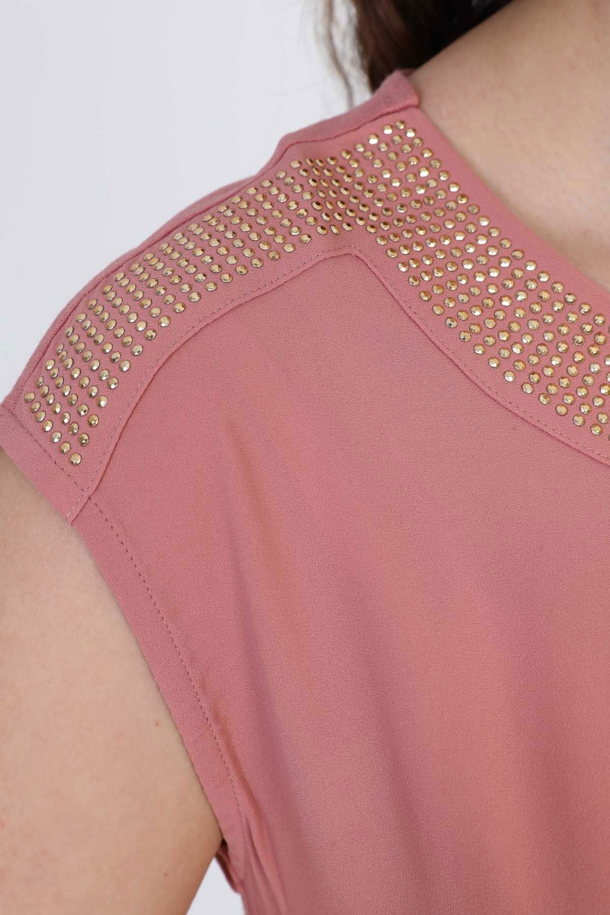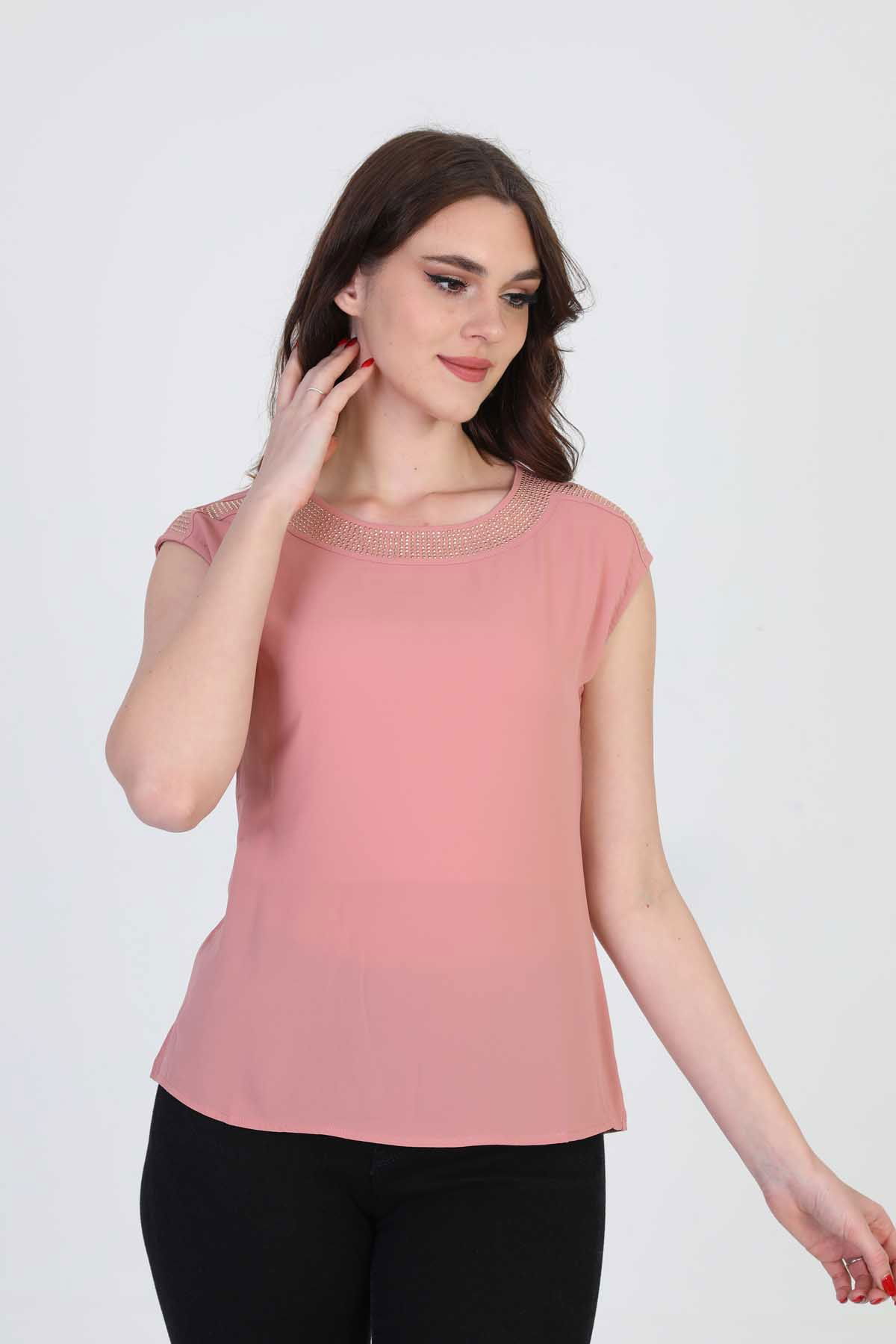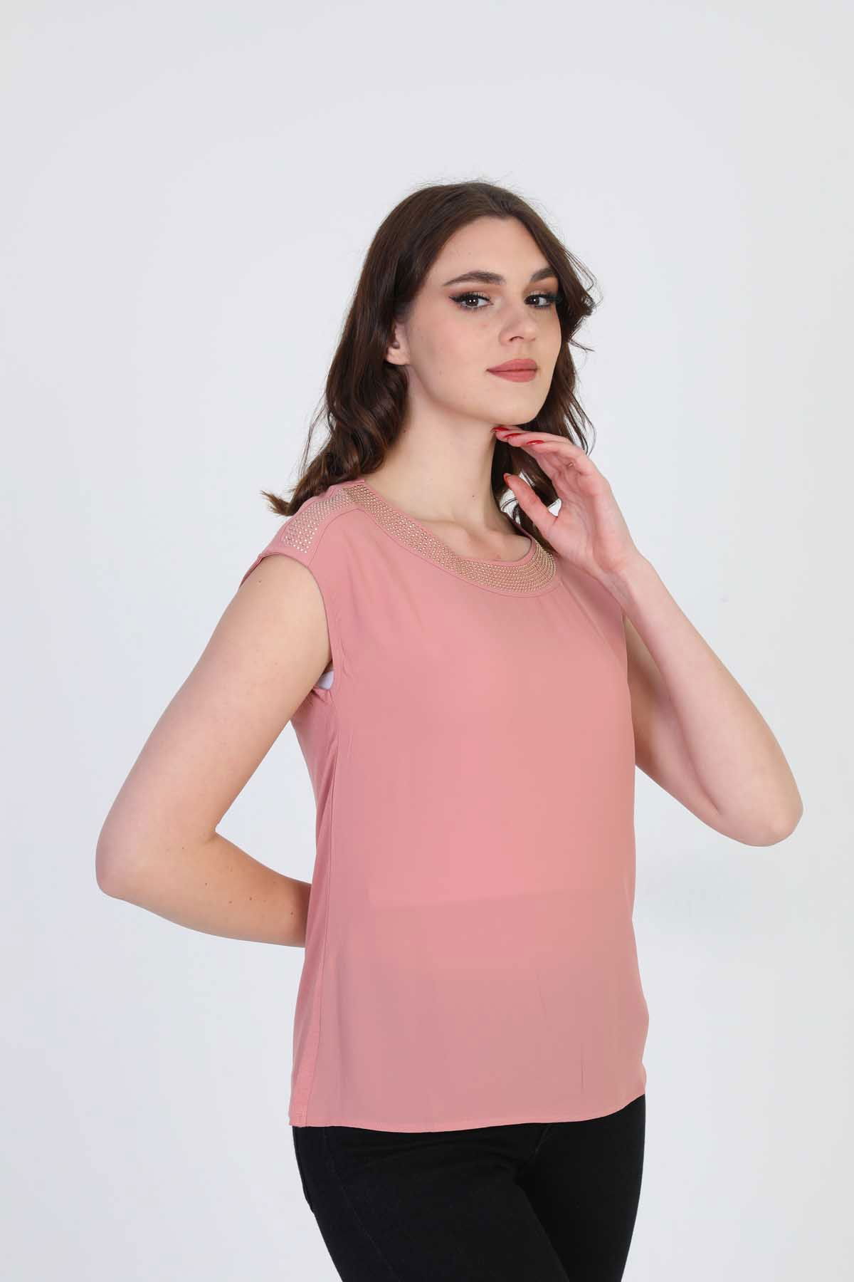 Kalıp Bilgisi: Standart; Detay: Sıfır kollu, yuvarlak yaka, omzu ve yakası taş detaylı bluz; Model Ölçüleri(cm) / Üzerindeki Ürün: Boy - 179, Göğüs - 89, Bel - 65, Kalça - 98 / 1 (M) Beden