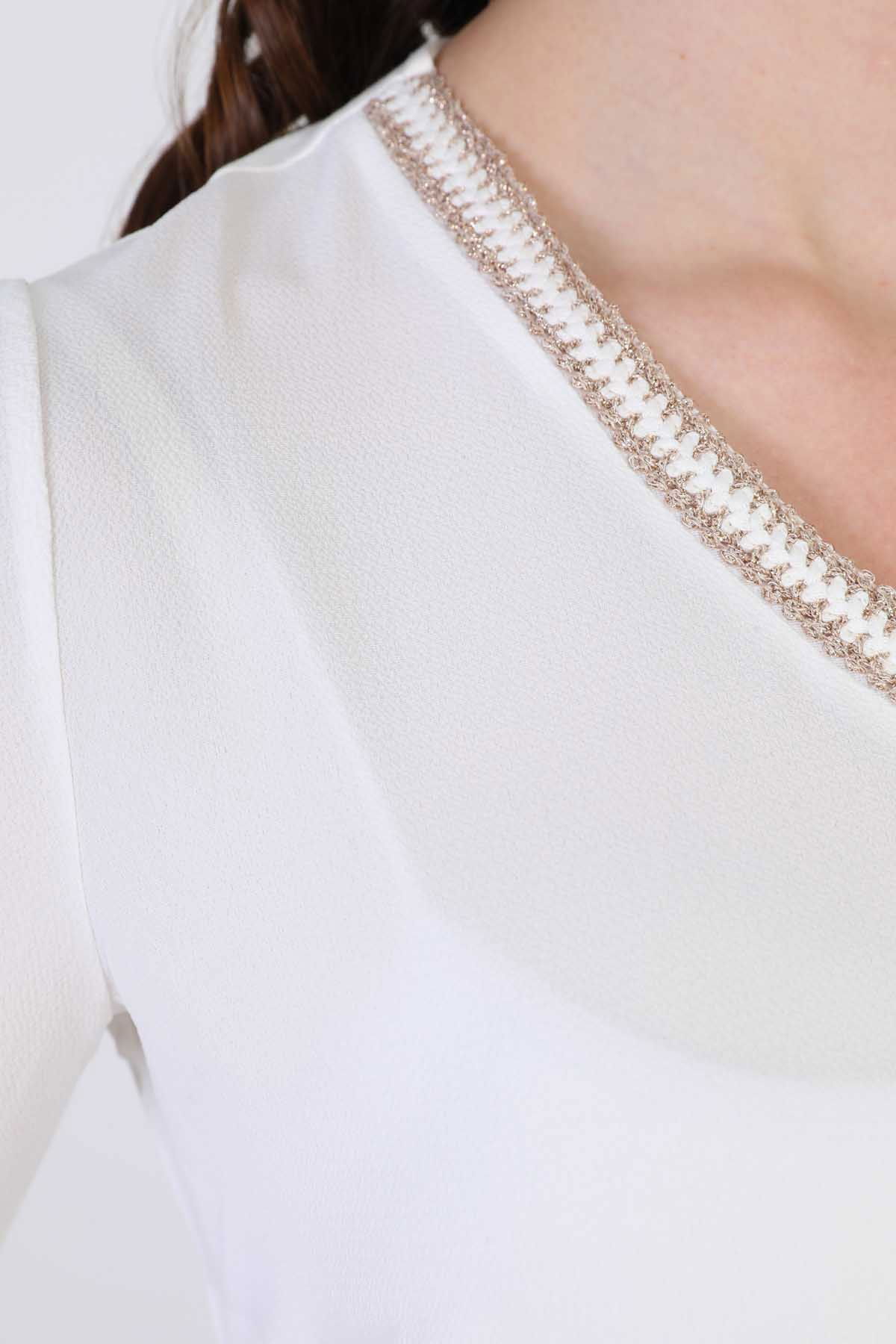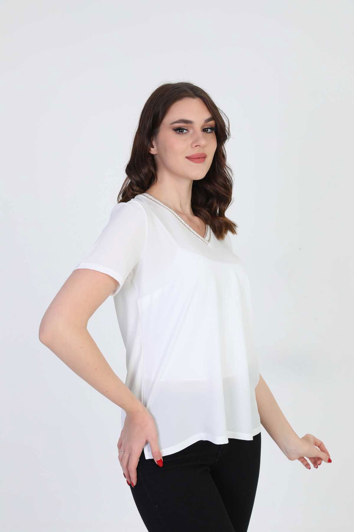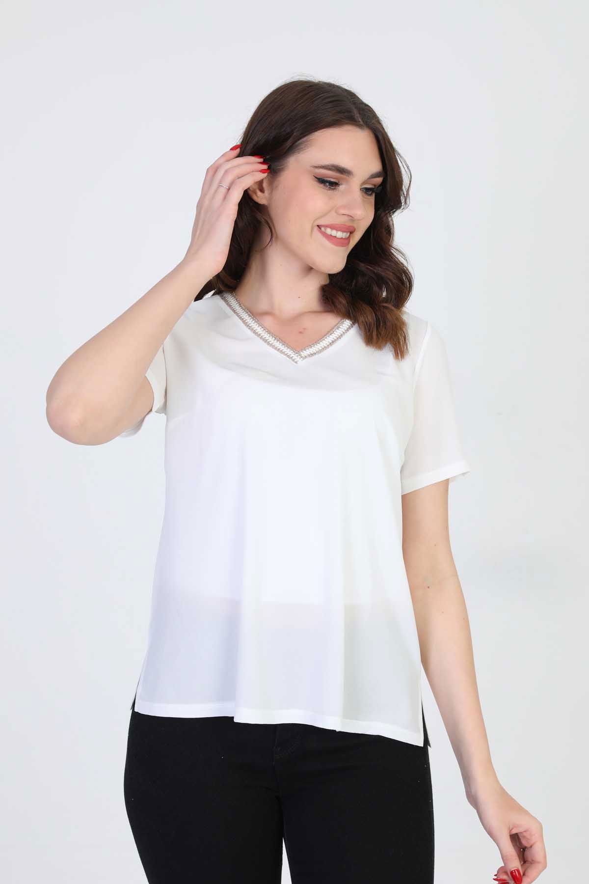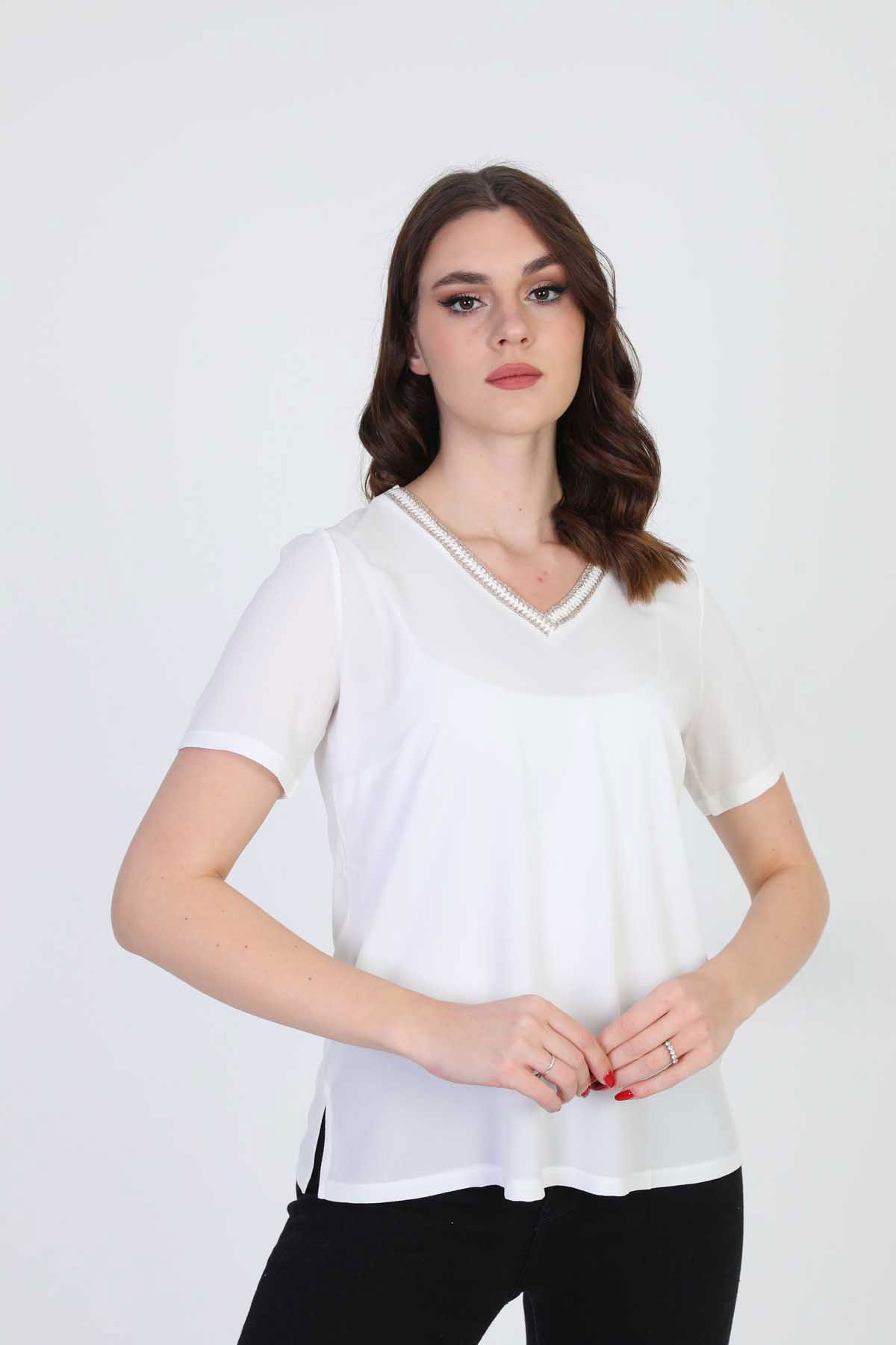 Kalıp Bilgisi: Standart; Detay: V yaka, kısa kollu, yaka detaylı bluz; Model Ölçüleri(cm) / Üzerindeki Ürün: Boy - 179, Göğüs - 89, Bel - 65, Kalça - 98 / 1 (M) Beden