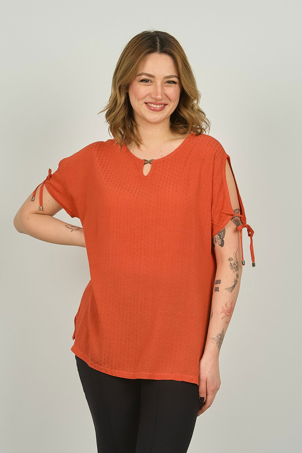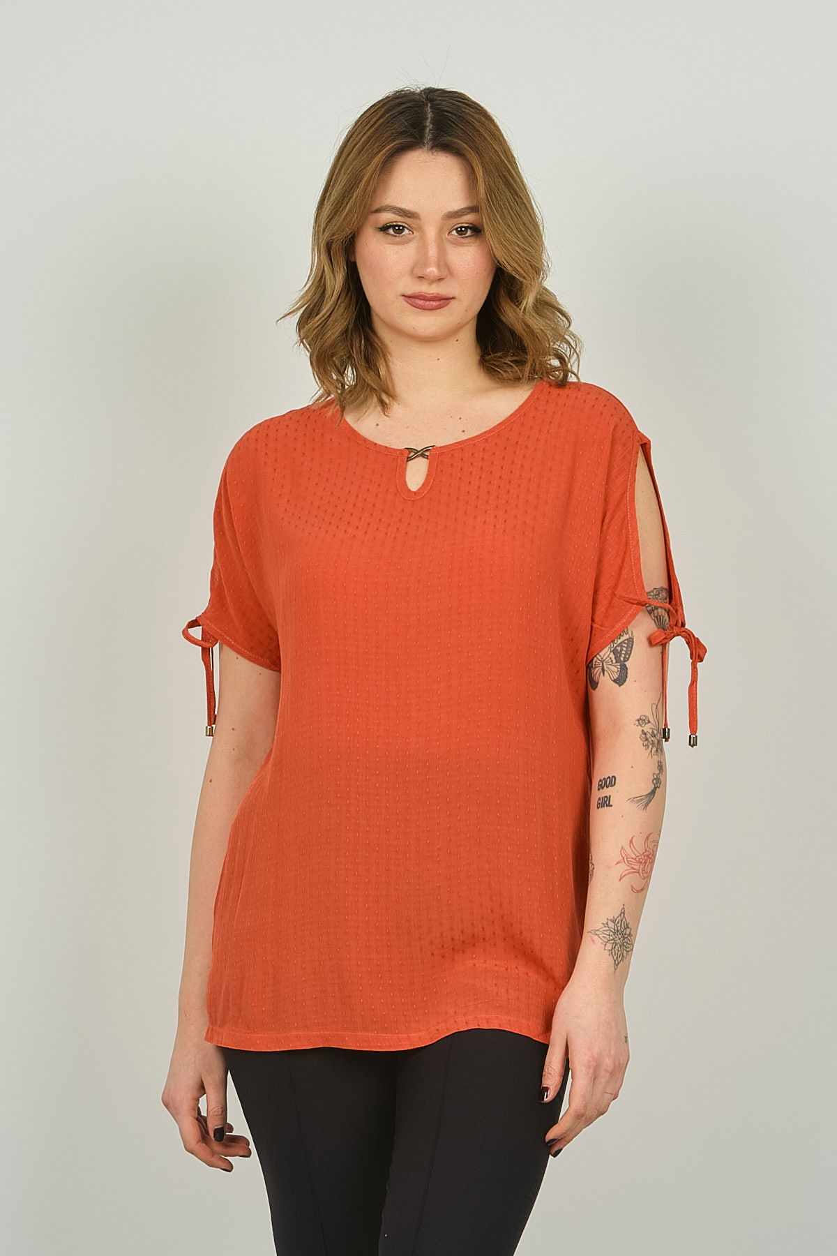 Kalıp Bilgisi: Standart;Detay: Kısa kollu, yakası ve kolları detaylı, yuvarlak yaka, desenli bluz;Model Ölçüleri(cm) / Üzerindeki Ürün: Boy - 179, Göğüs - 89, Bel - 65, Kalça - 89/ 1 (M) Beden