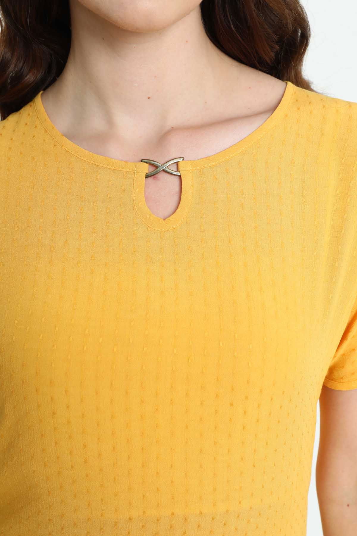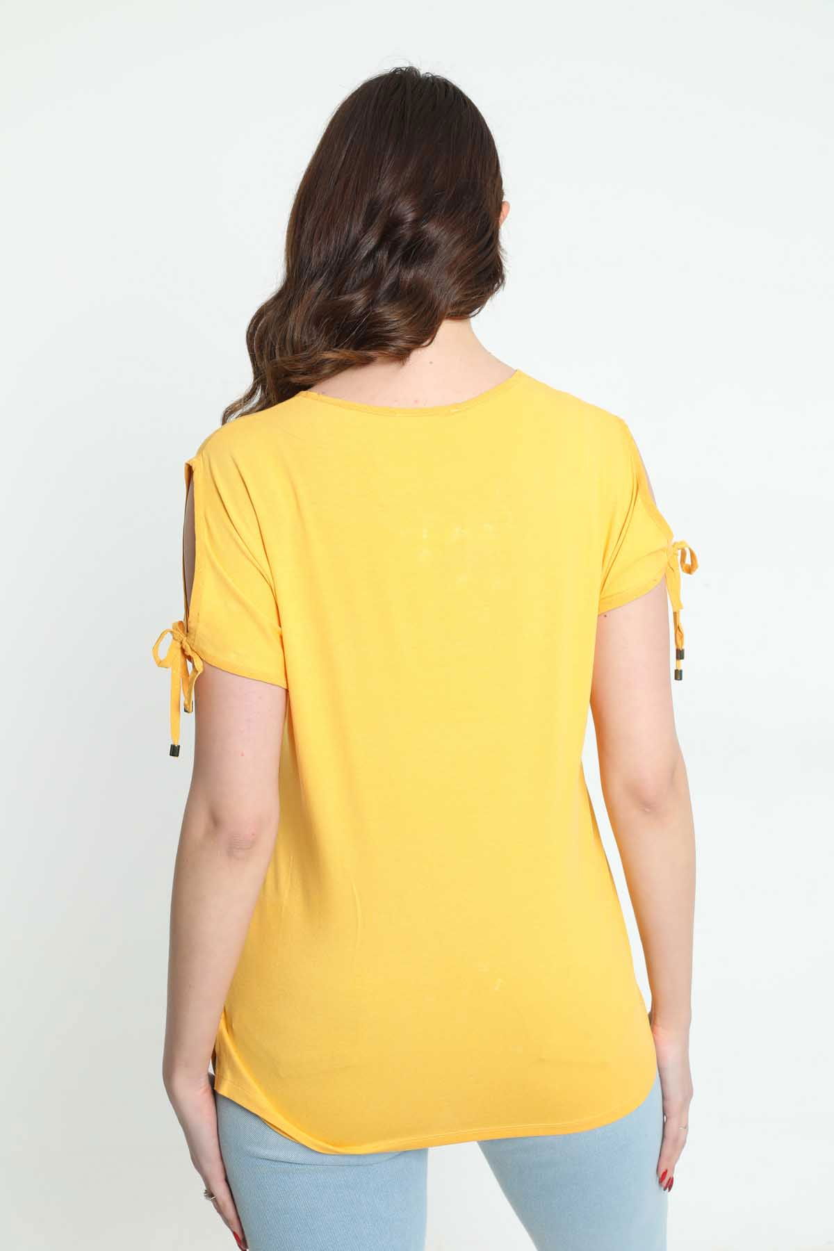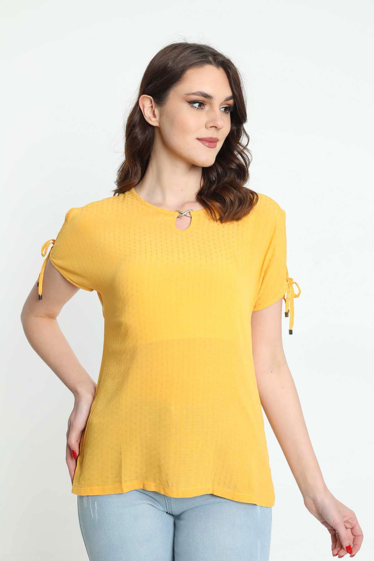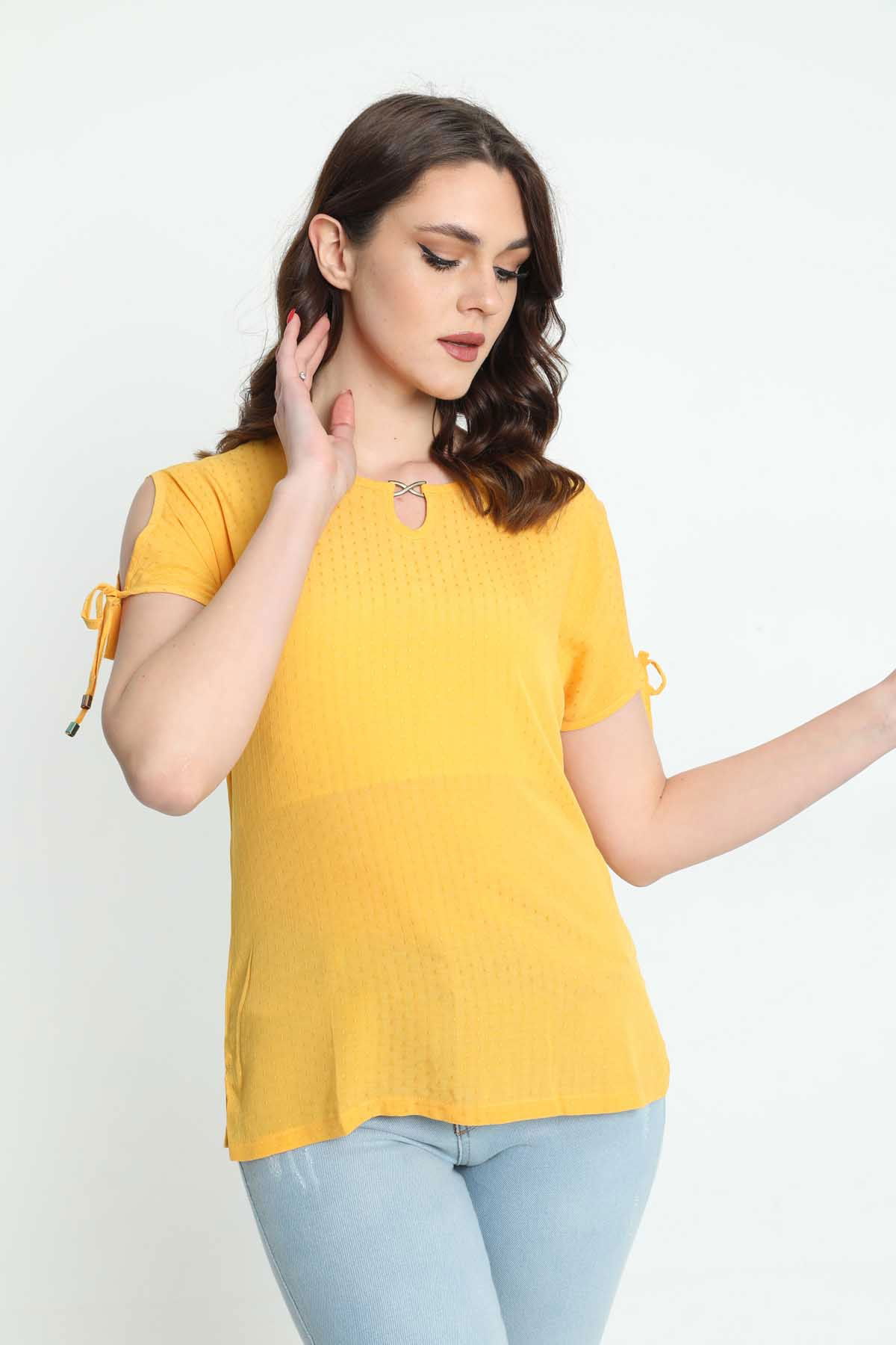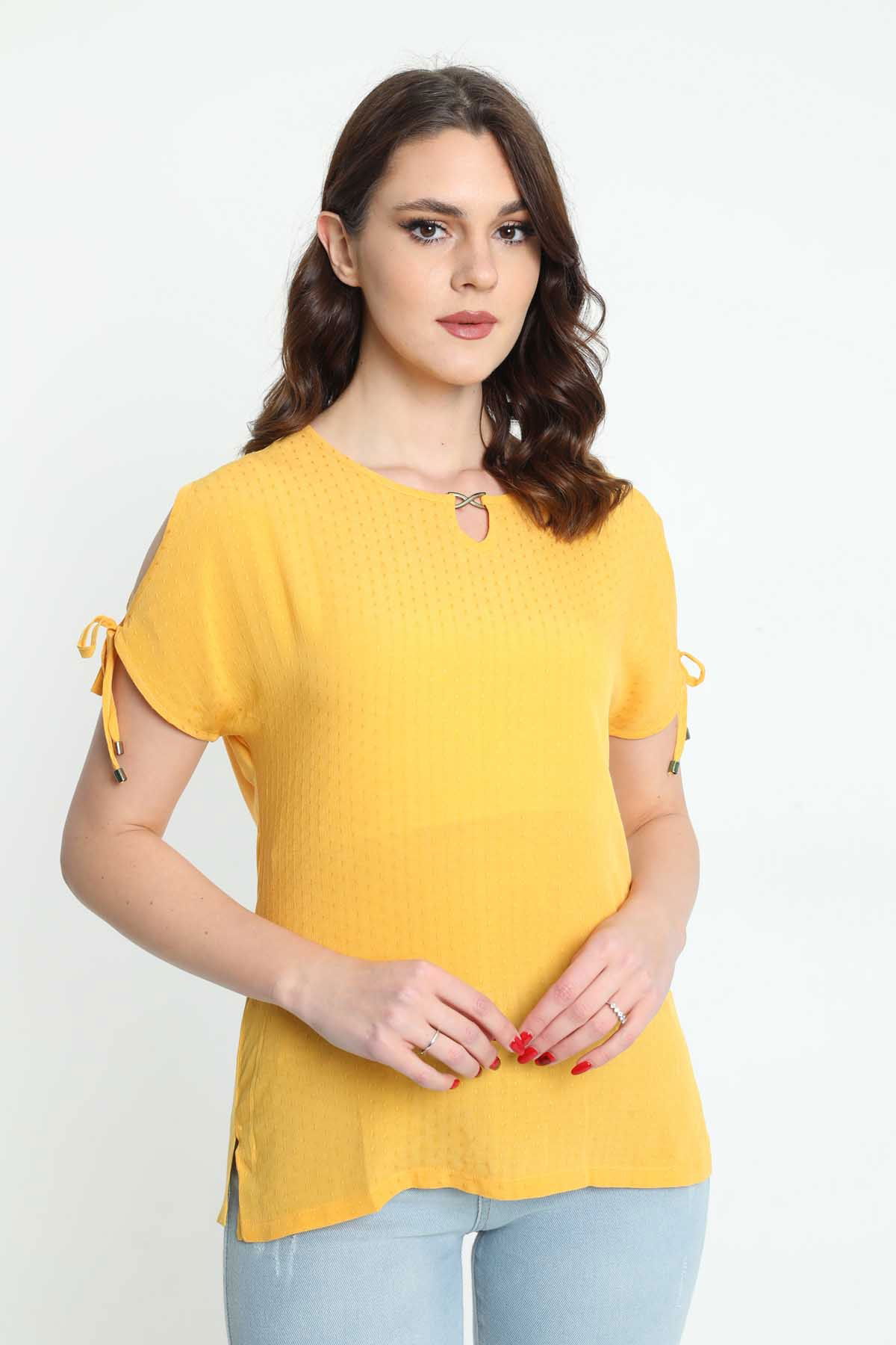 Kalıp Bilgisi: Standart;Detay: Kısa kollu, yakası ve kolları detaylı, yuvarlak yaka, desenli bluz;Model Ölçüleri(cm) / Üzerindeki Ürün: Boy - 179, Göğüs - 89, Bel - 65, Kalça - 89/ 1 (M) Beden