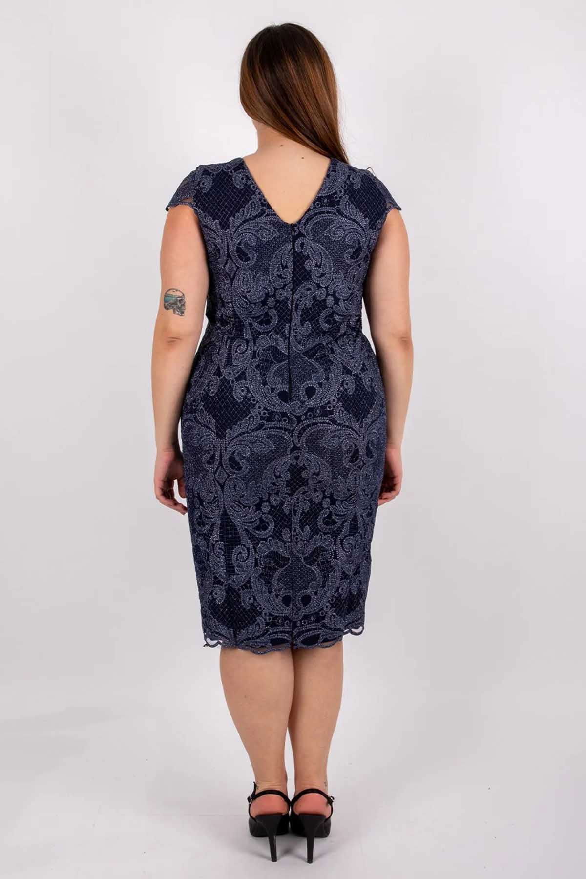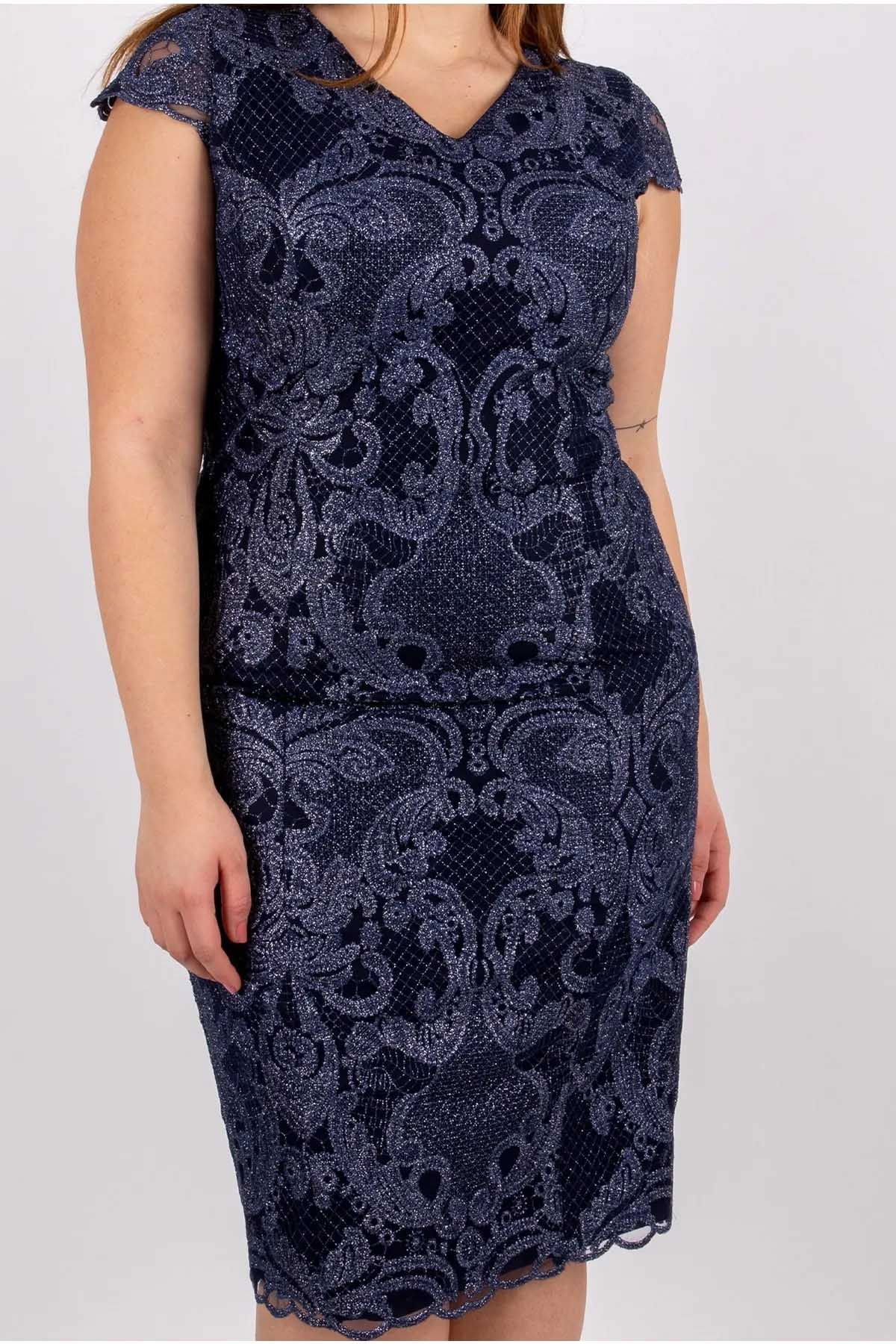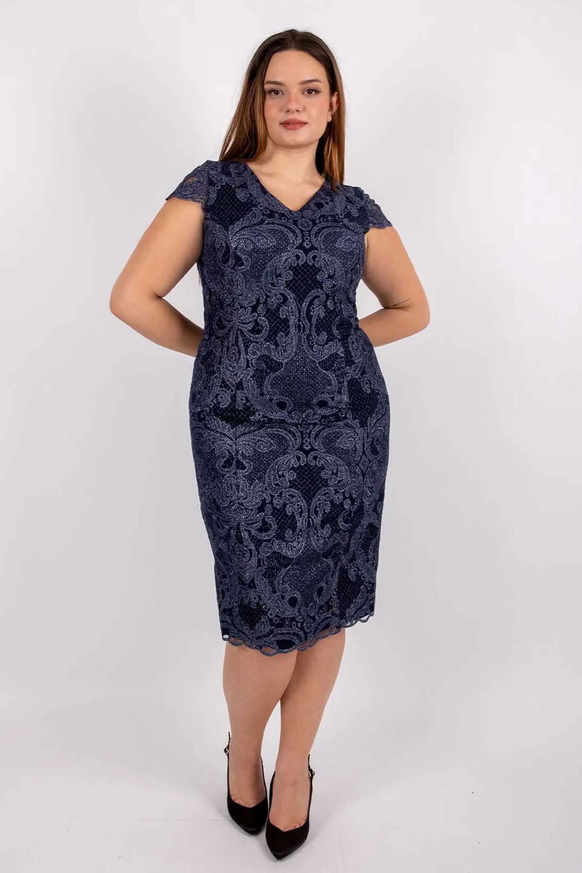 Detay: 1. Sınıf ithal dantel pano desenli kumaş, çift astarlı tırnak kol, ön-arka V yaka, midi boy, astarlı abiye elbise;
